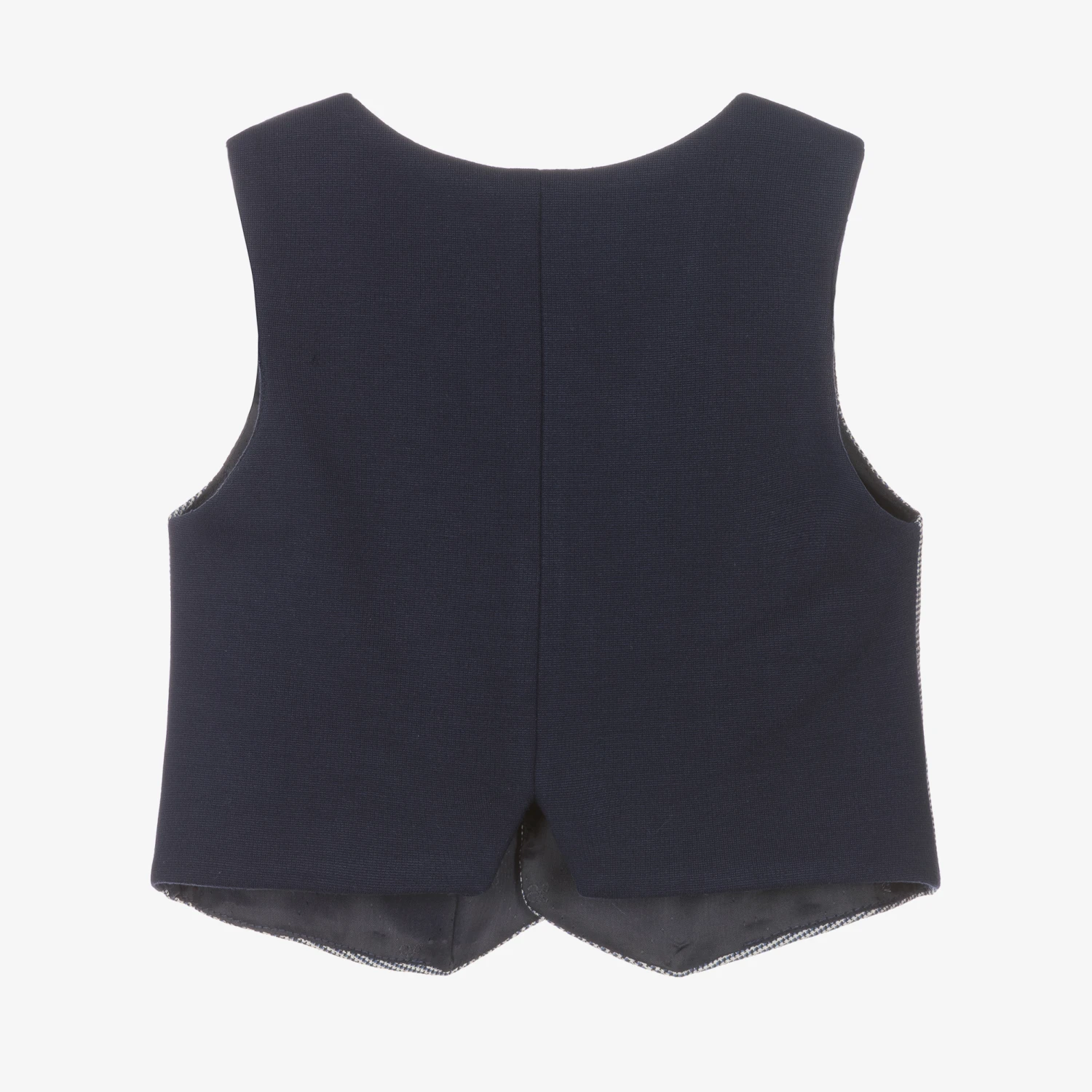 A smart navy blue waistcoat for little boys by Spanish brand Abel & Lula, made in a soft viscose, cotton and linen blend. The front panel is designed in a fine blue, black and white pattern with button fastenings on the front. It is made with a soft jersey back for comfortable wear.