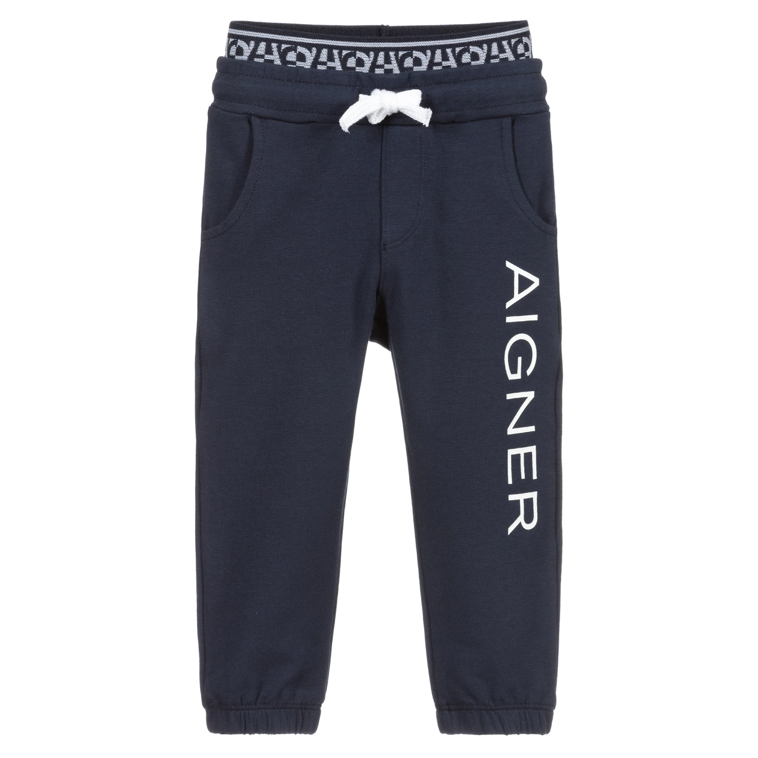 Baby boys navy blue joggers by AIGNER, with a white logo print on one leg. Made in soft cotton jersey, they have a double waistband with a logo branded insert and a drawstring tie. The joggers have front pockets and an embroidered white logo on the back patch pocket.