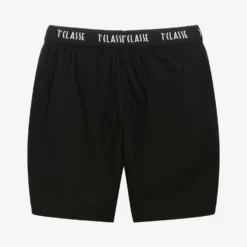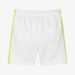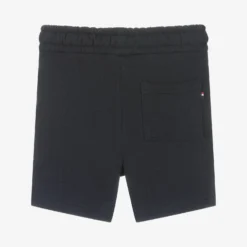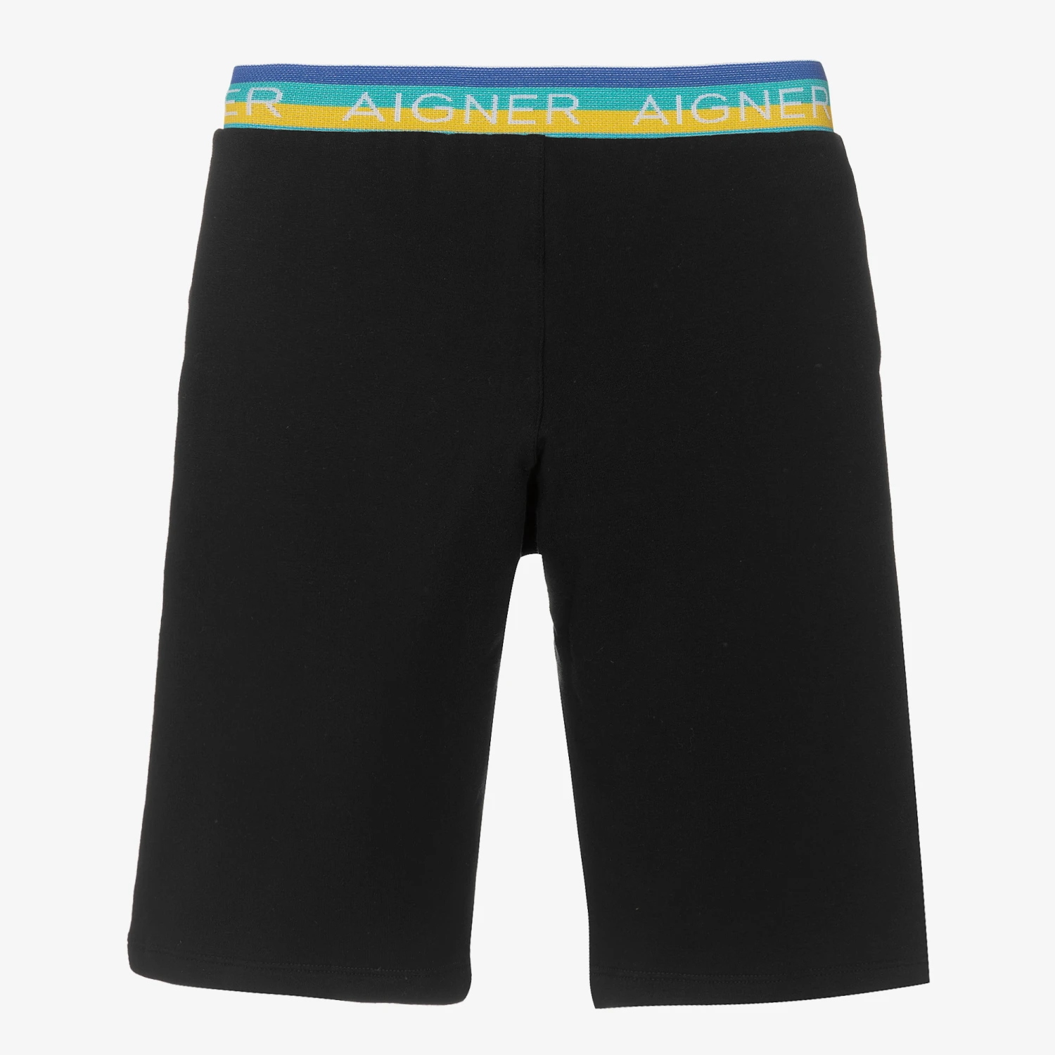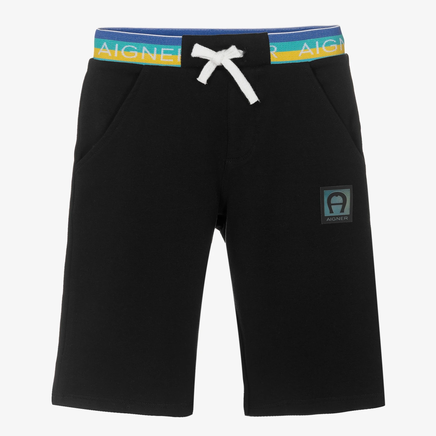 Black casual shorts for boys by AIGNER, made from soft and comfortable cotton jersey, with a rubberised holographic signature ‘A’ horseshoe logo on the front. They have a stretchy blue and yellow stripe logo waistband, faux drawstrings and slanted front pockets.