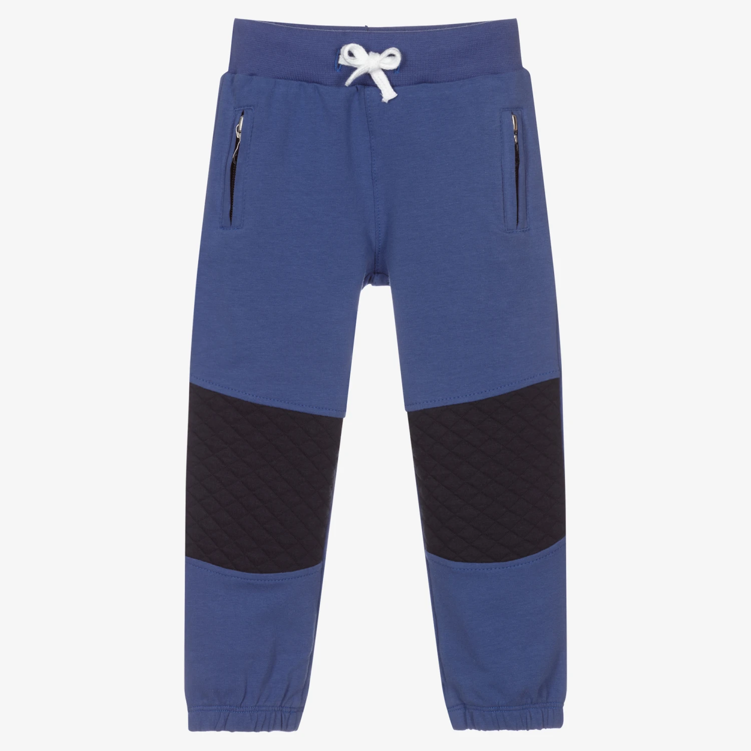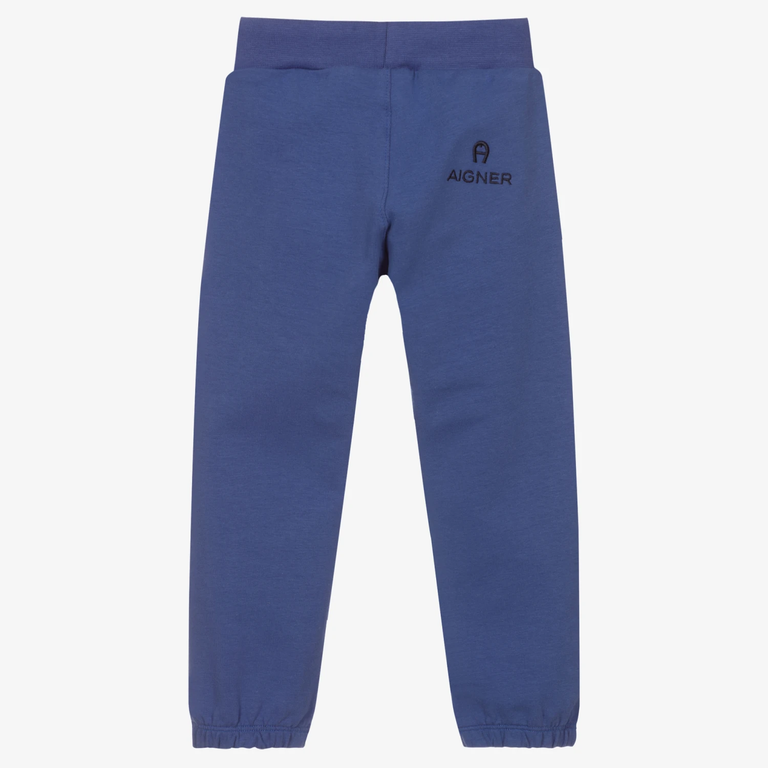 Royal blue joggers for little boys by AIGNER. They are made in soft cotton jersey, with navy blue diamond-patterned inserts on the legs. They have an elasticated drawstring waistband and zip fastening front pockets. The brand’s name and signature ‘A’ horseshoe logo is embroidered on the back.