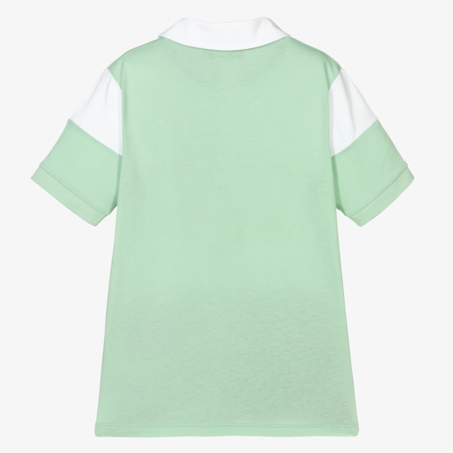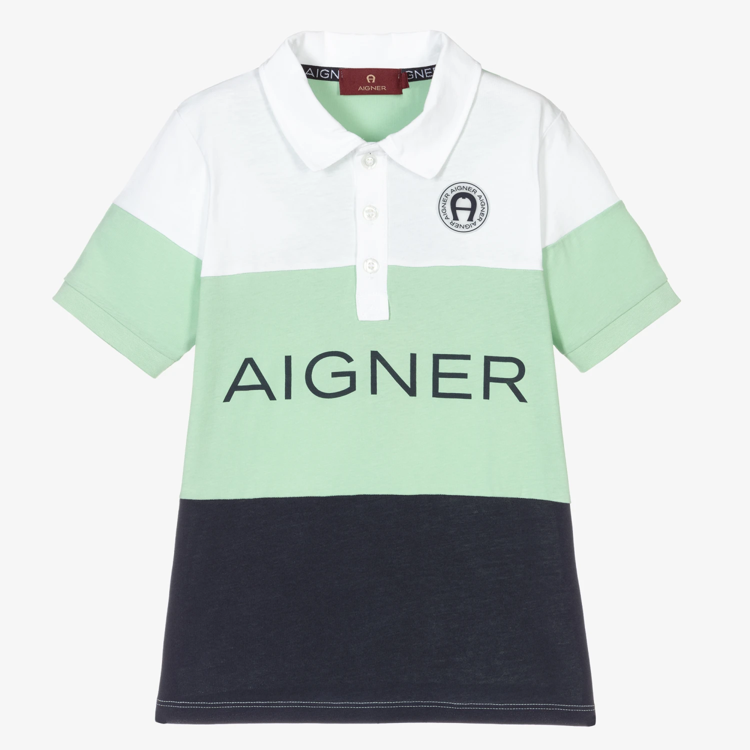 Pale green polo shirt for boys by AIGNER, exclusive to Childrensalon. Made in soft and stretchy cotton jersey, it has white and navy blue panels on the front with a navy blue logo print and button fastenings. There is a clear rubber patch on the chest with the brand’s signature ‘A’ horseshoe logo in navy blue.