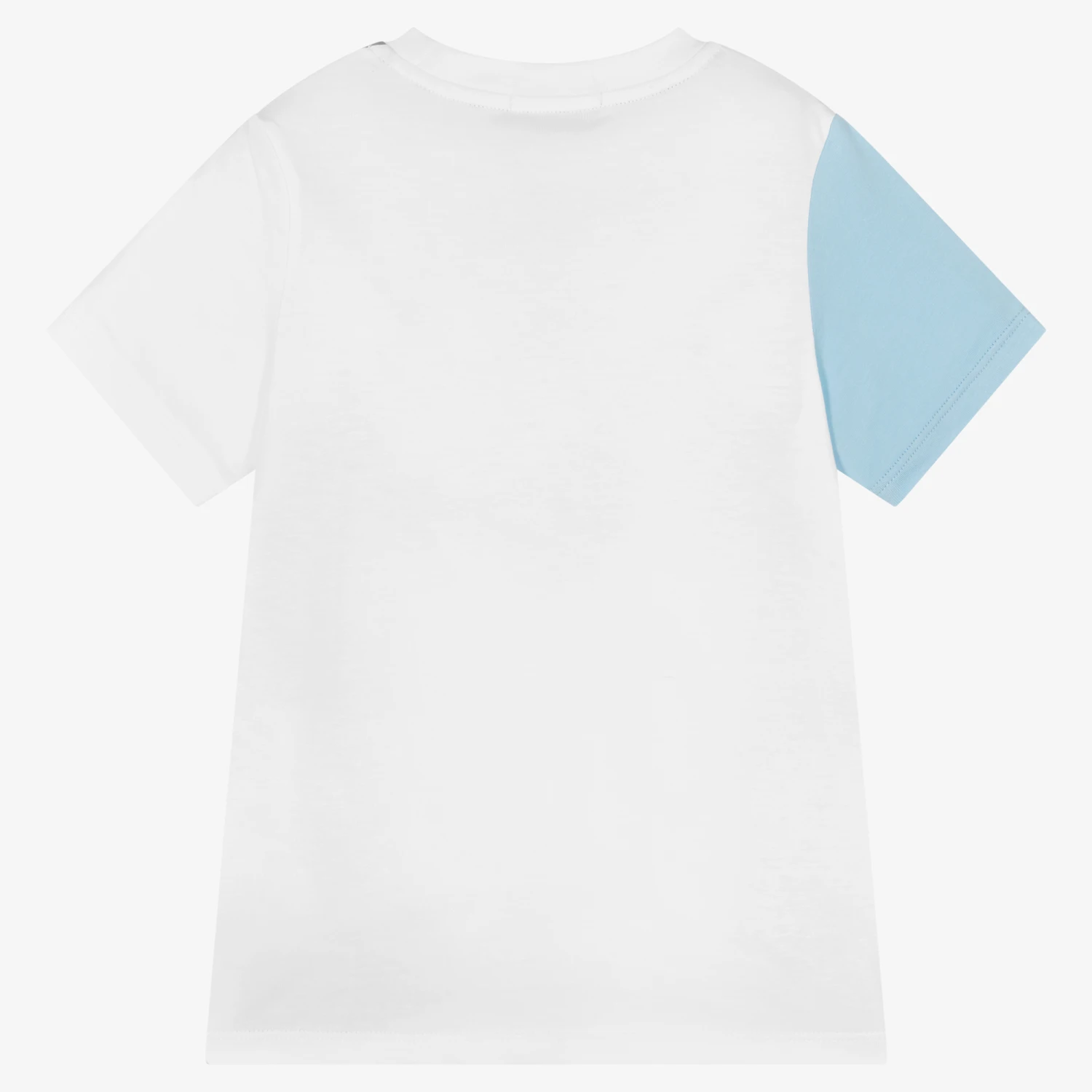 Cool white T-shirt for boys from AIGNER, with white and blue colourblocked sections. Made in soft cotton jersey and with a traditional crew neck, it is casual and comfortable. The brand’s signature ‘A’ horseshoe logo is embroidered on the chest in navy blue for a designer touch.