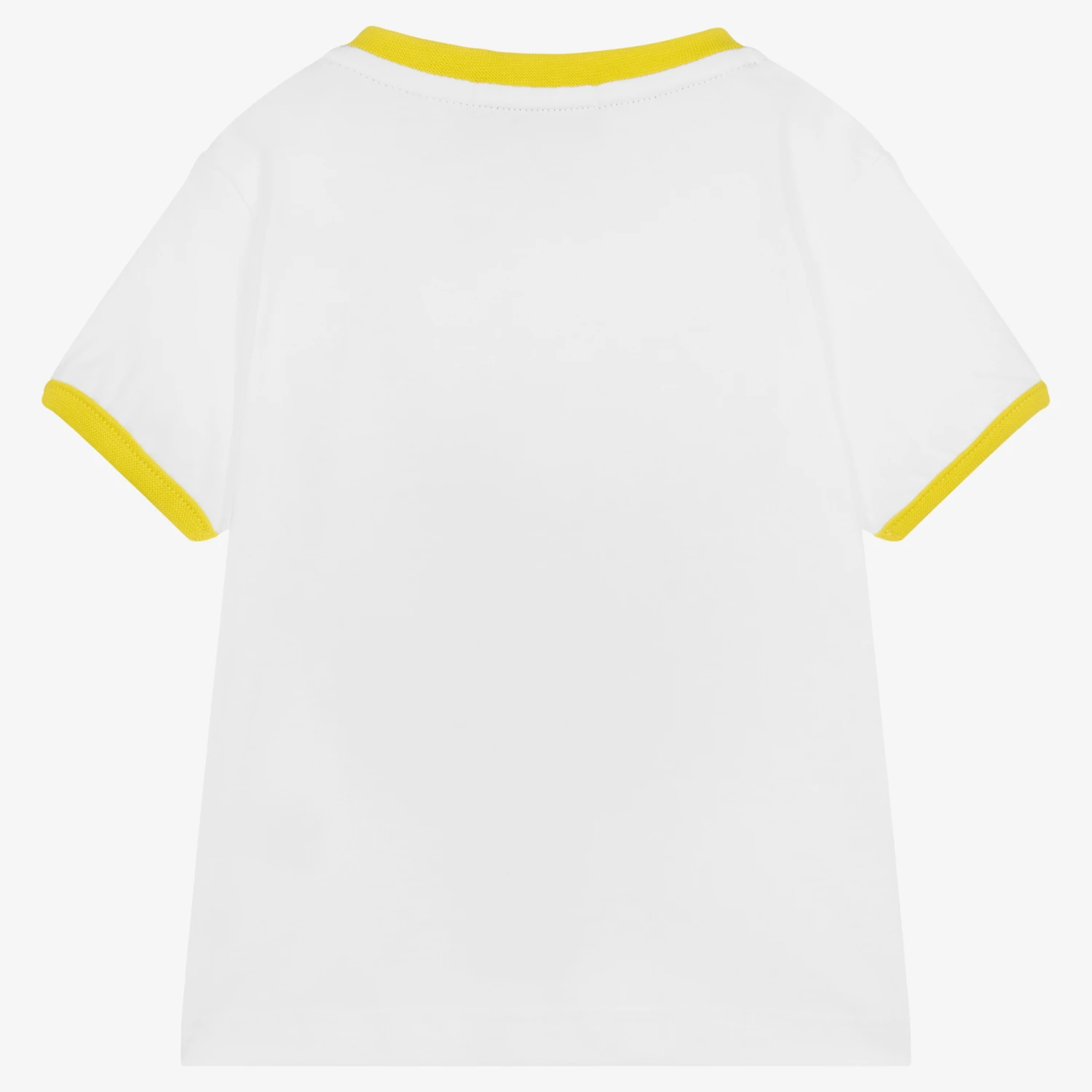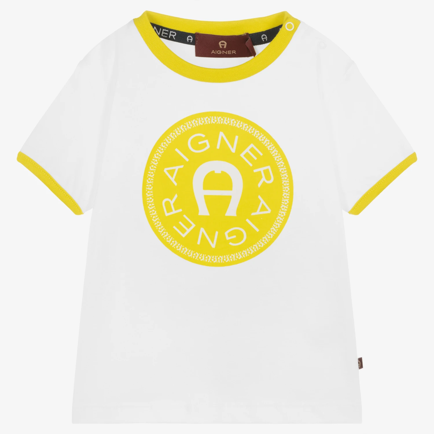 White cotton T-shirt for little boys from German brand AIGNER, made in soft and comfortable cotton jersey. It has contrast lime green trim and a circular logo motif featuring the designer’s signature ‘A’ horseshoe. There are useful popper fastenings on one shoulder and a logo tab on the side seam completes the look.
