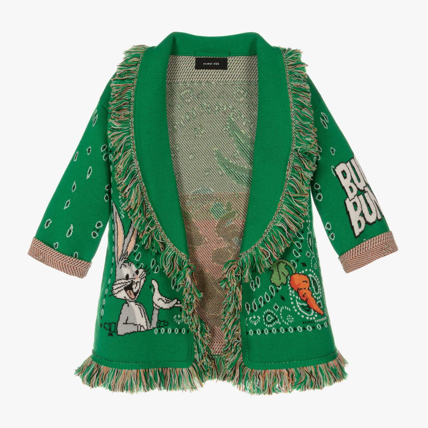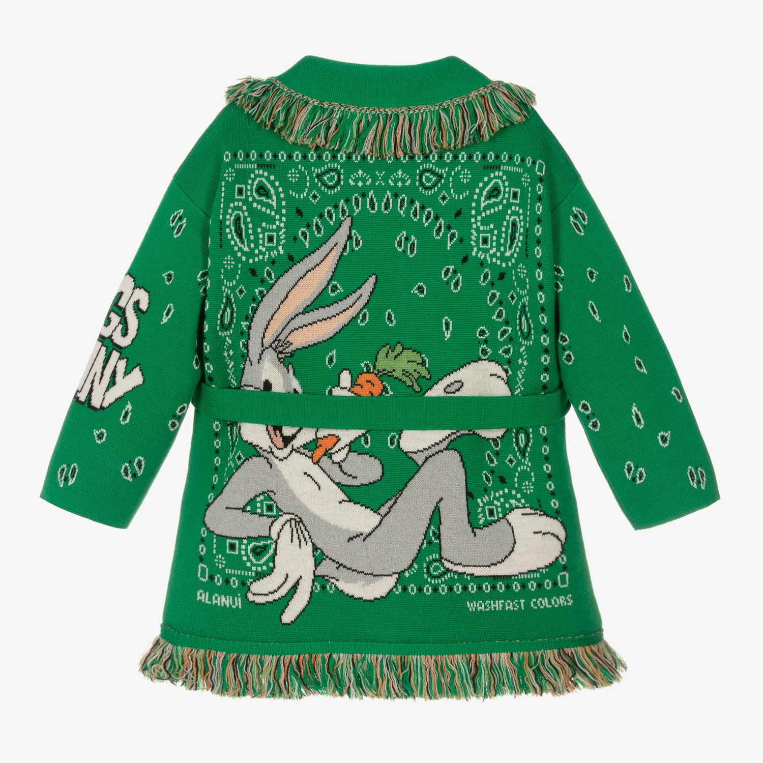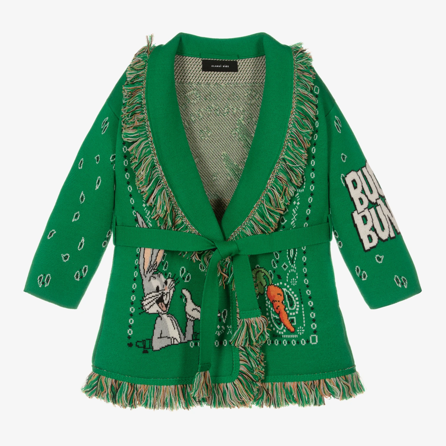 Luxury knit meets ultimate comfort, this bold green icon jacquard cardigan for boys and girls is a signature style by Alanui. It is hand-crafted in a double jacquard knit from the finest virgin wool, taking over six hours of superb Italian artisanal technique to complete. Reflecting the brand’s spirit of travels and adventures, it is knitted in the iconic pattern with fringed edges and incorporates Looney Tunes’ playful Bugs Bunny motifs. It can be worn with an open front or with the two-sided tie belt in shades of blue for optional styling.