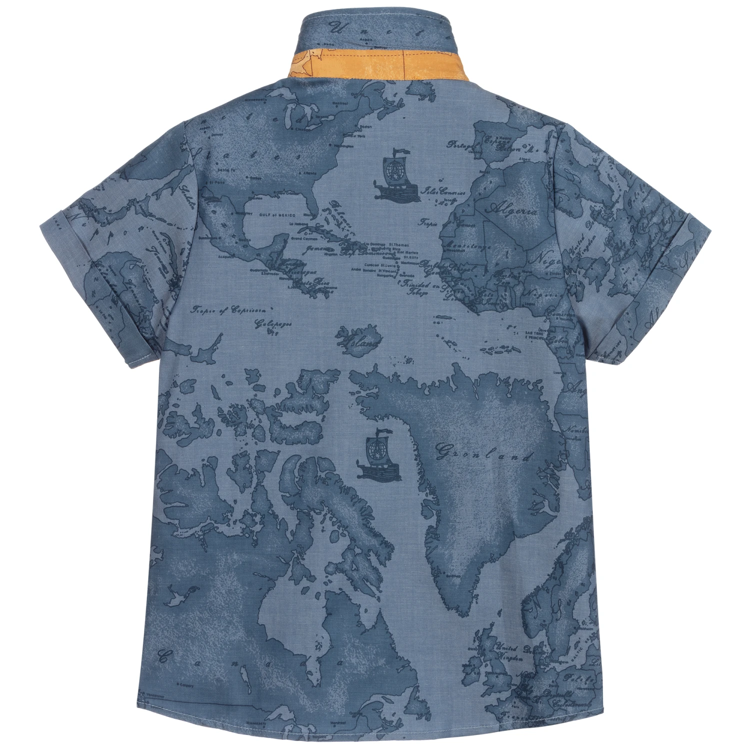 Blue Geo Map shirt for boys by Alviero Martini made in soft and lightweight cotton. It has contrasting dark beige details inside the collar and placket, and it comes with a detachable bow tie