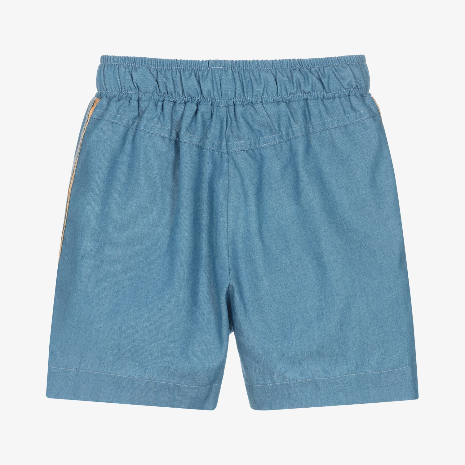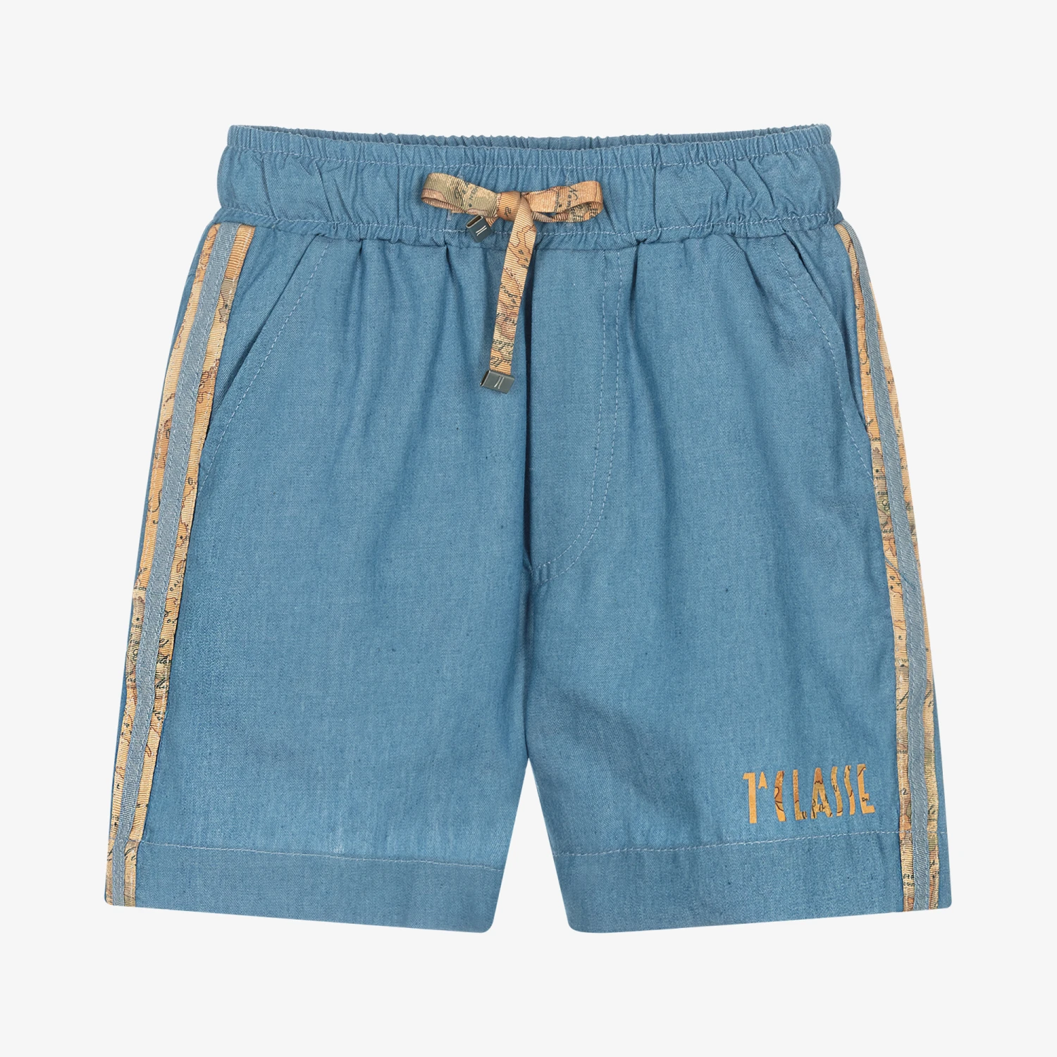 Little boys navy blue cotton blend shorts by luxury Italian brand Alviero Martini. Soft and lightweight they have side slant pockets and a dark beige 1a Classe small logo print on the front and the signature dark beige Geo map print down the sides. The elasticated waist and dark beige Geo map ribbon drawstring give them a comfortable fit. Monogram-branded end caps give them an extra designer touch.