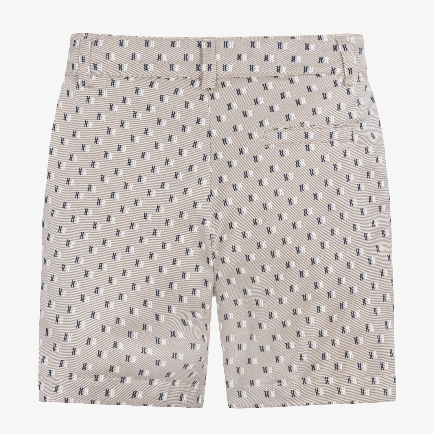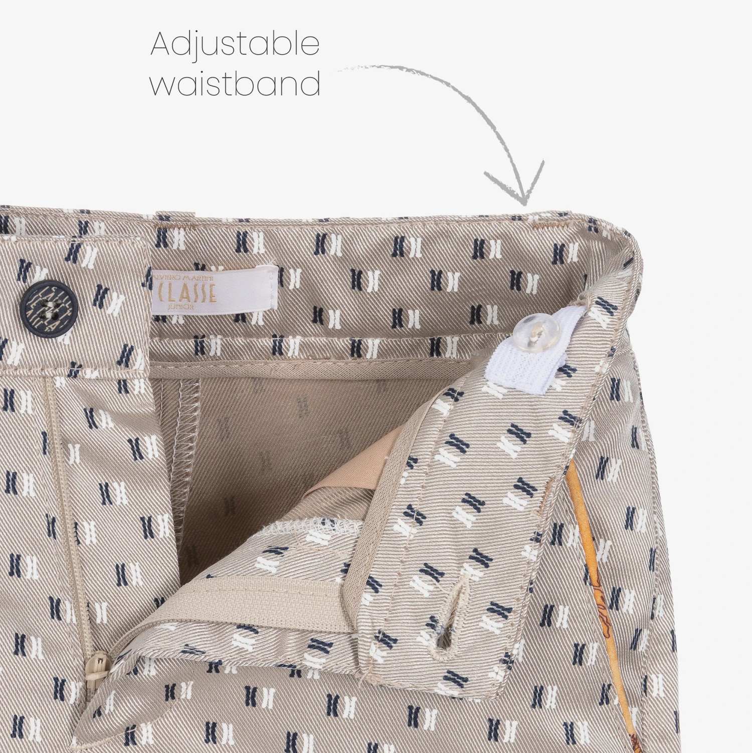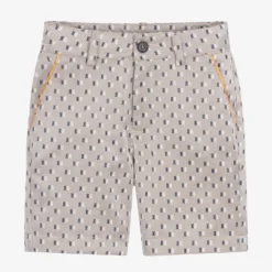 Boys light silvery beige 1st Classe monogram shorts by luxury Italian brand, Alviero Martini. Silky and smooth, the logo initials are woven in white and navy blue, with dark beige Geo map print trims. Fastening with a button and zip, they have side slant pockets and a pocket on the back, with belt loops and an adjustable waistband.