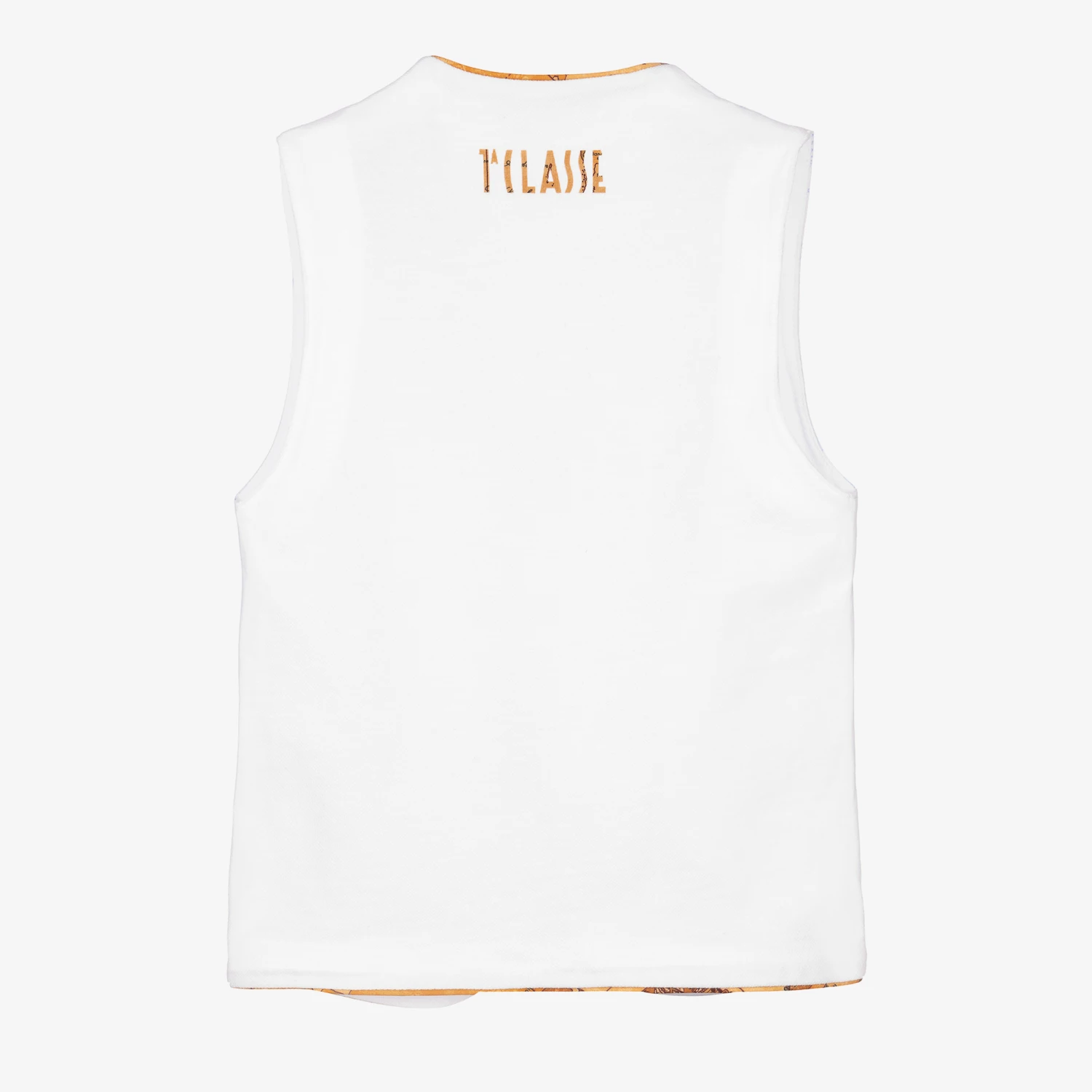 Smart white and pale blue waistcoat for boys by Alviero Martini, made in soft cotton piqué. Patterned with the iconic blue Geo map logo all-over, it has dark beige Geo map logo piping, and a matching 1a Classe logo on the back.