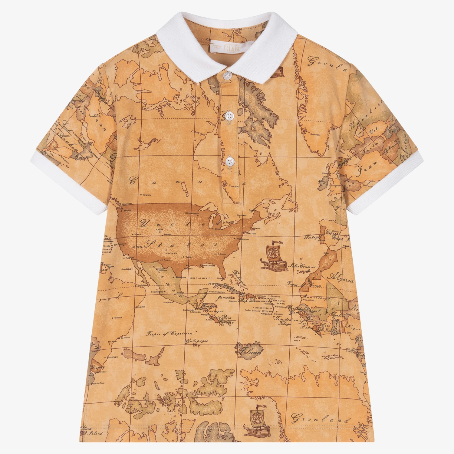 Boys dark beige Geo map print polo shirt by luxury Italian brand, Alviero Martini. The shirt is made in soft cotton jersey for comfort and stretch. There is a ribbed collar and front button fastening.