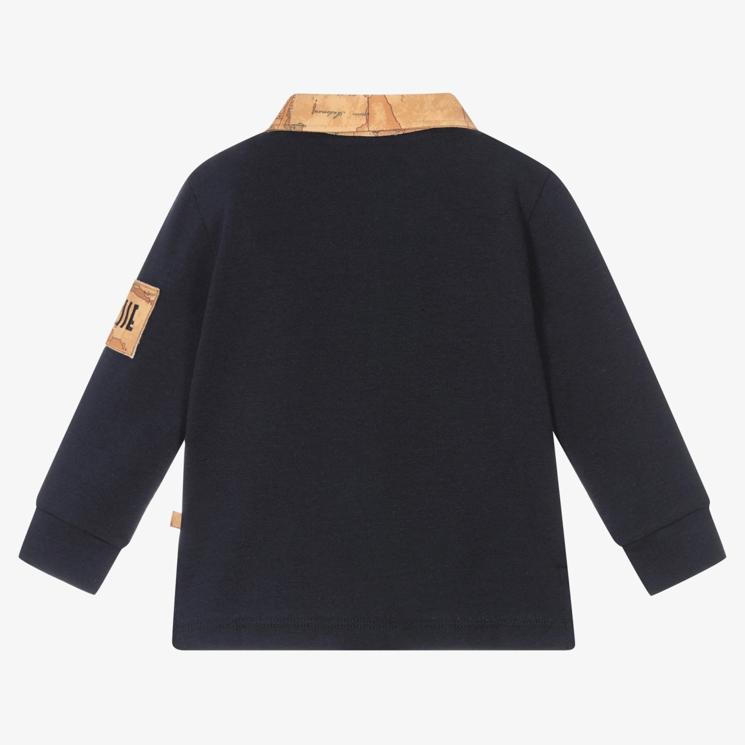 Navy blue polo shirt for boys by luxury Italian brand Alviero Martini. The collar, sleeve patch and side vents are in a dark beige Geo map print, with the front Monogram logo in a matching beige Geo map print. There are popper fastenings on the front for easy dressing.