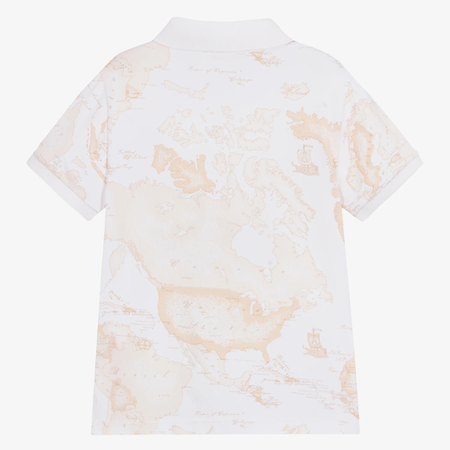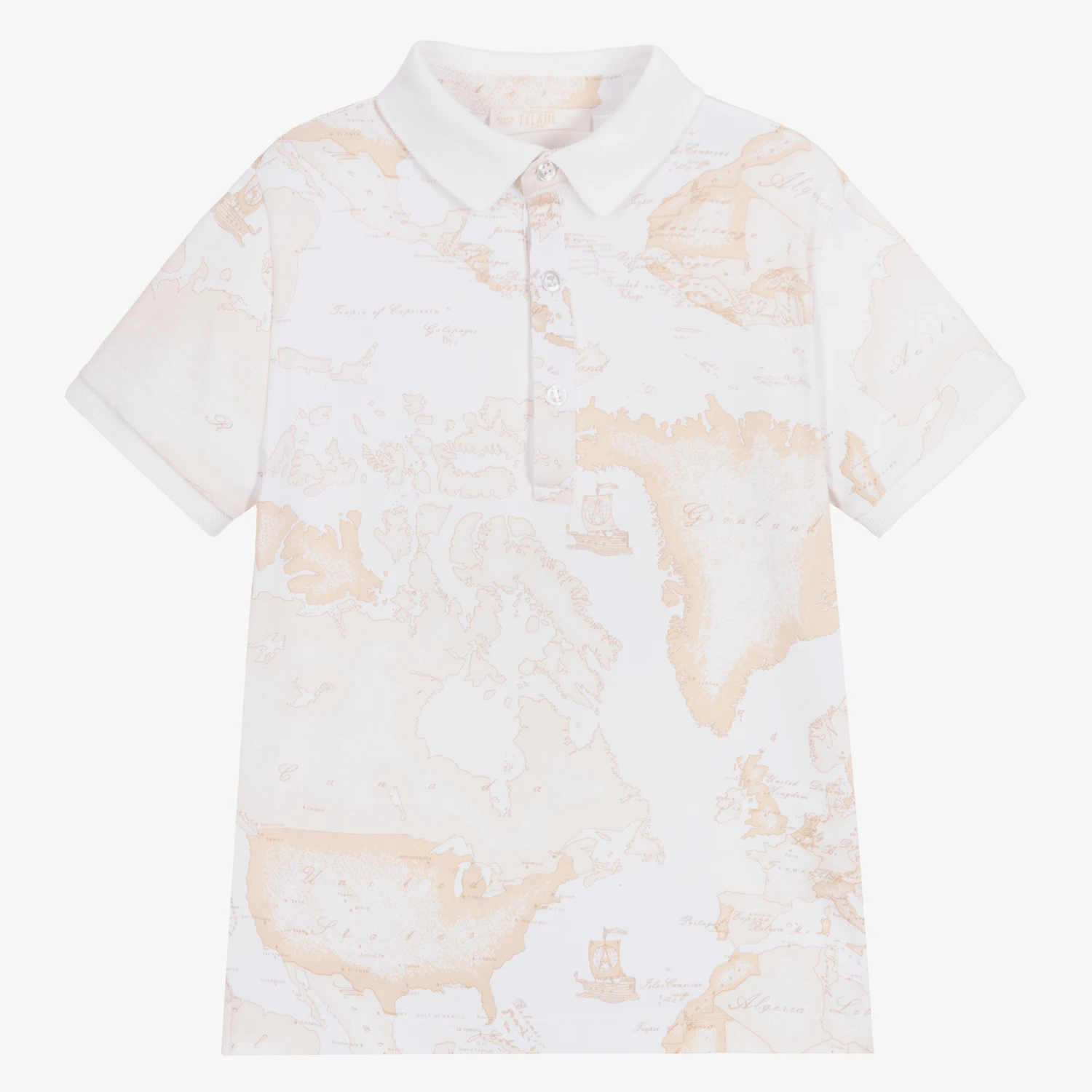 Boys light beige 1st Classe Geo map polo shirt by luxury Italian brand, Alviero Martini. The shirt is made in soft cotton jersey for comfort and stretch. There is a ribbed collar and front button fastening.