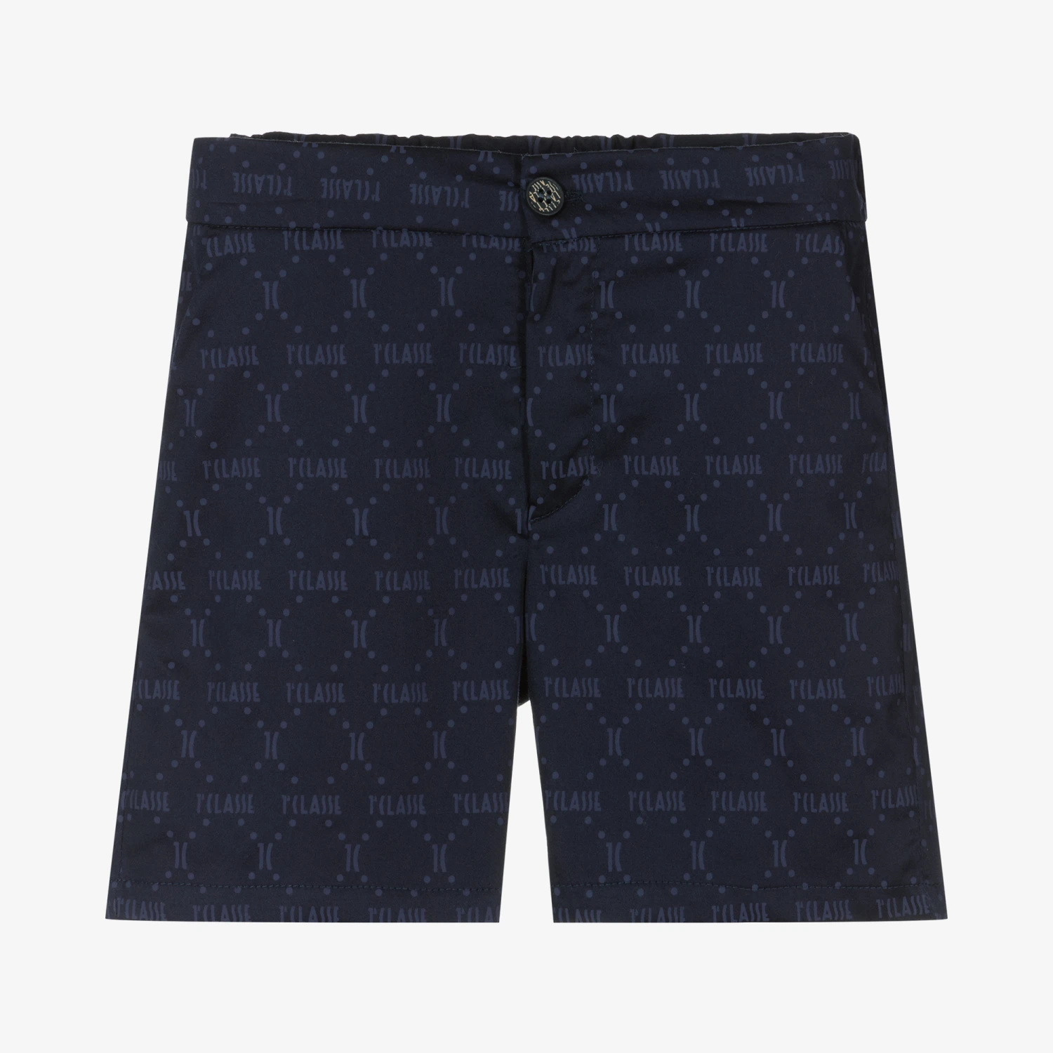 Boys navy blue 1st Classe print shorts by Alviero Martini. Smartly tailored in a chino style, they are made in lightweight stretch cotton for a luxurious feel and comfort in wearing. They fasten with a button and zip and have side slant pockets and an elasticated waistband for fit.