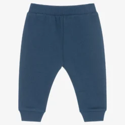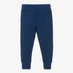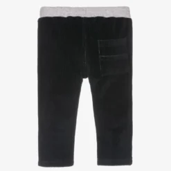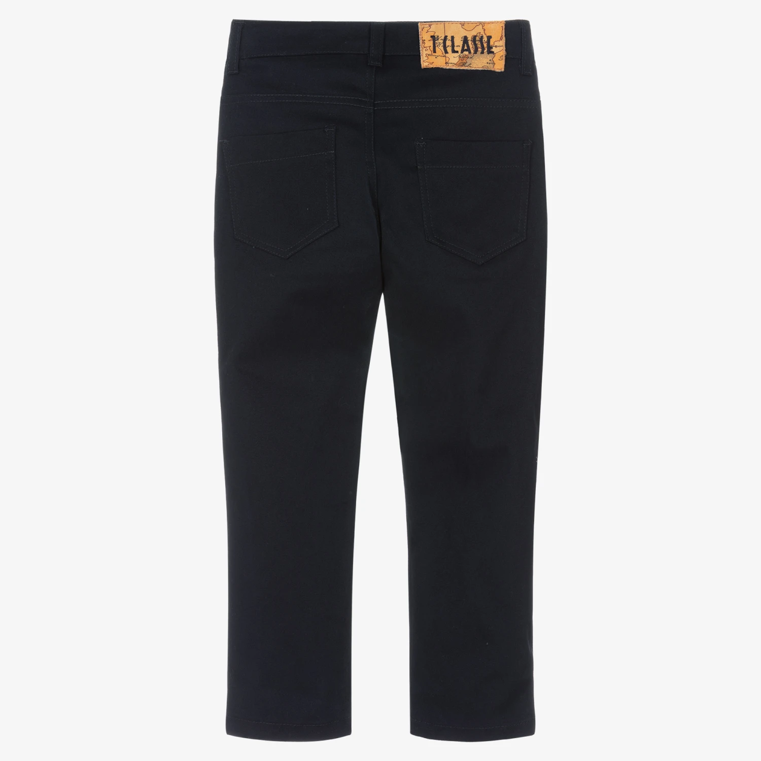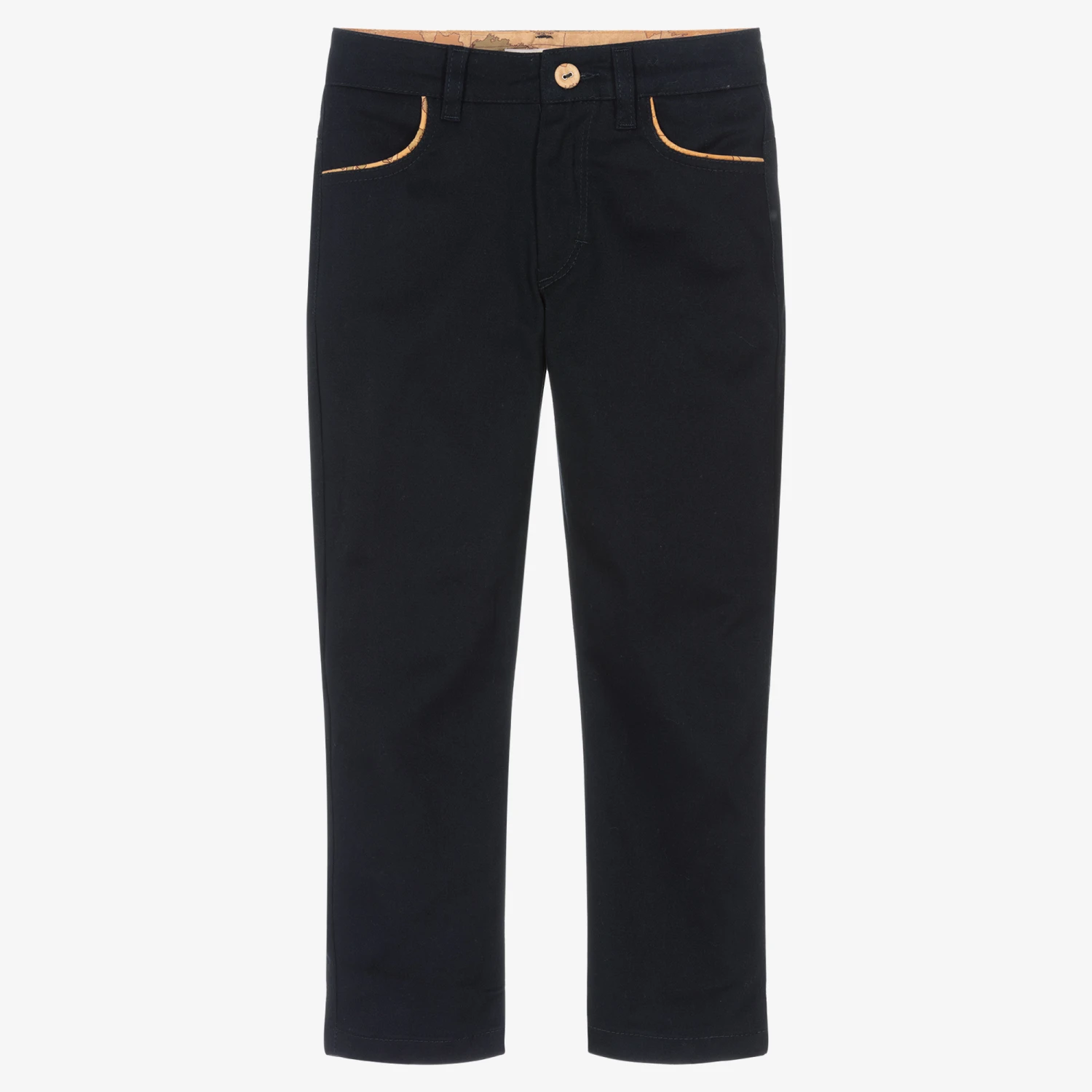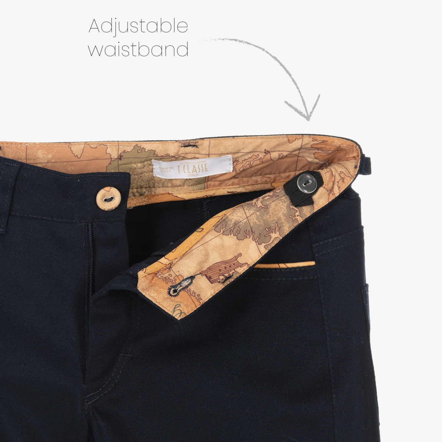 Boys navy blue trousers from Alviero Martini, with signature beige Geo map trim. Made in soft cotton twill with a slight stretch, these comfortable trousers fasten with a zip and button and have an adjustable waistband for a good fit. There is a branded patch on the back waistband with the brand’s ‘1a Classe’ logo.