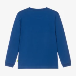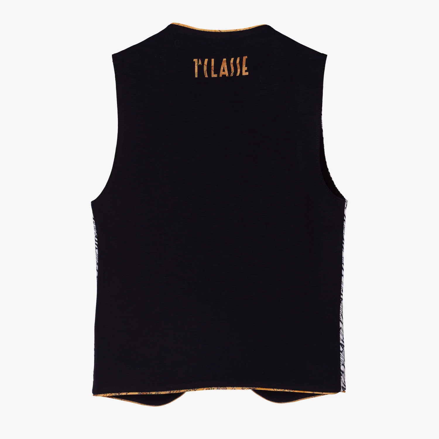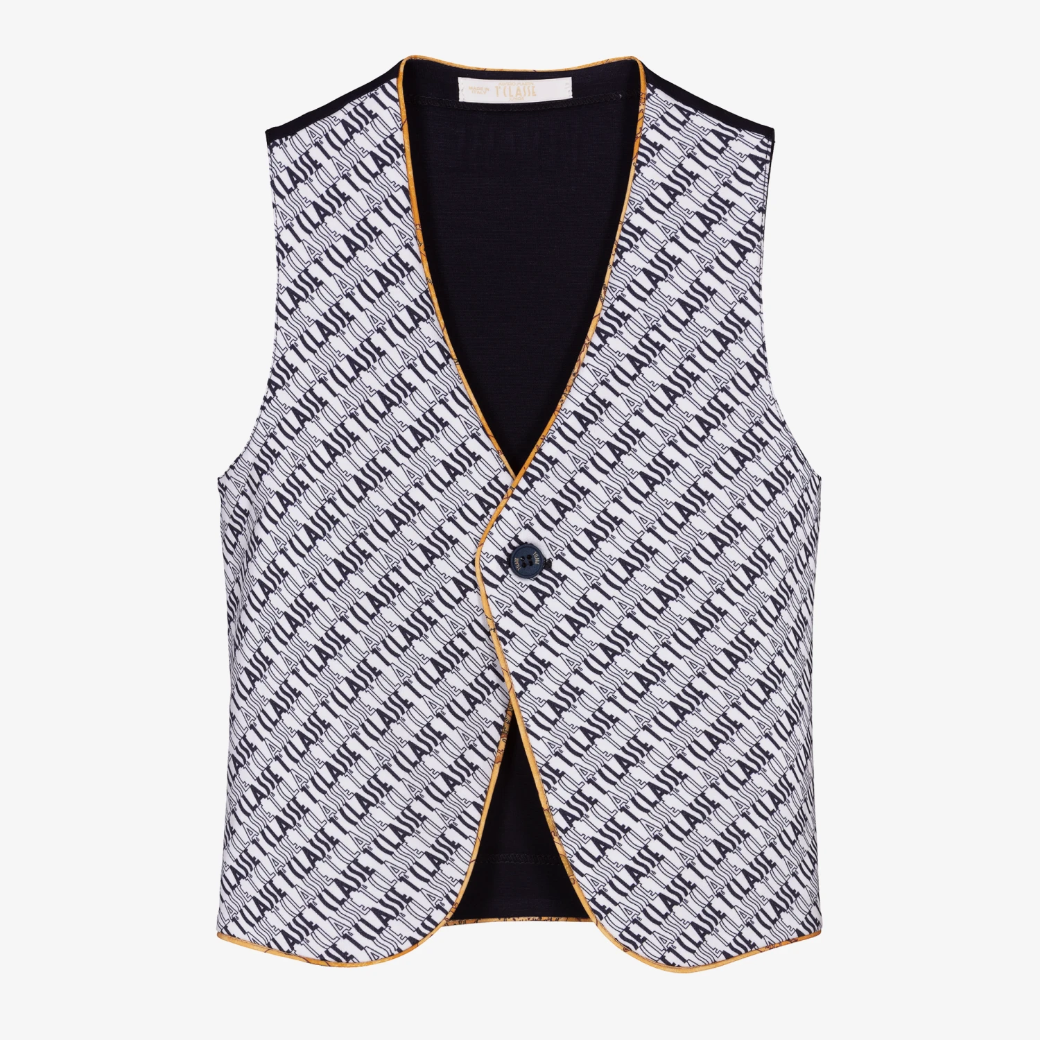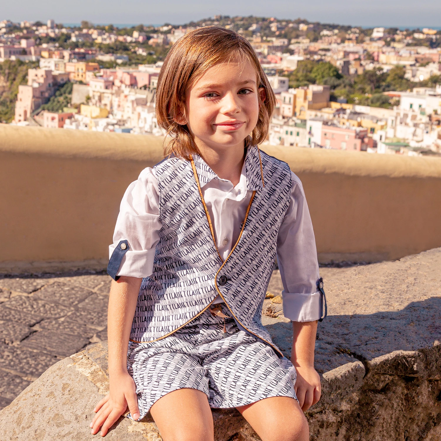 White and navy blue waistcoat for boys by Alviero Martini, made in comfortable cotton jersey. Patterned with a repeat navy blue 1a Classe logo all-over, it has dark beige Geo map logo piping, and a logo embossed button fastening.