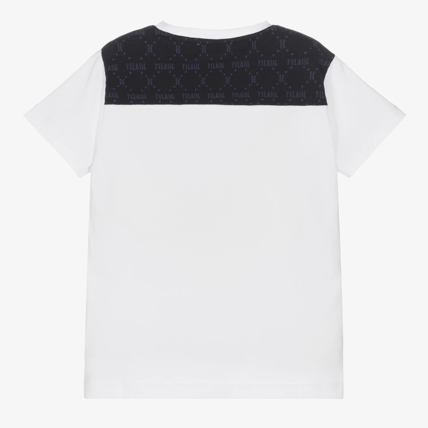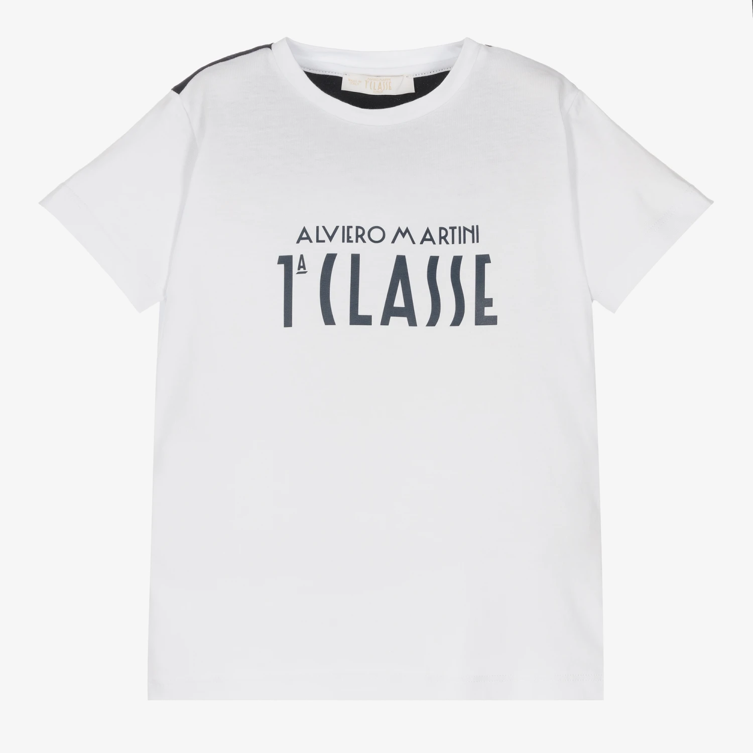 Designed by Alviero Martini, a white cotton T-shirt for boys. This Italian-crafted top is made in soft, stretchy and comfortable jersey, with the label’s signature navy blue 1a Classe logo print across the front. On the back is a tone-on-tone blue Monogram-print panel for a subtle designer detail.