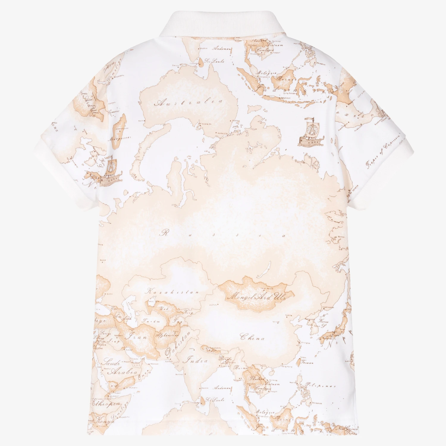 Boys white polo shirt by Alviero Martini, with light beige Geo map print and ribbed white trims. It is made in soft and stretchy cotton jersey with classic styling and button fastening.