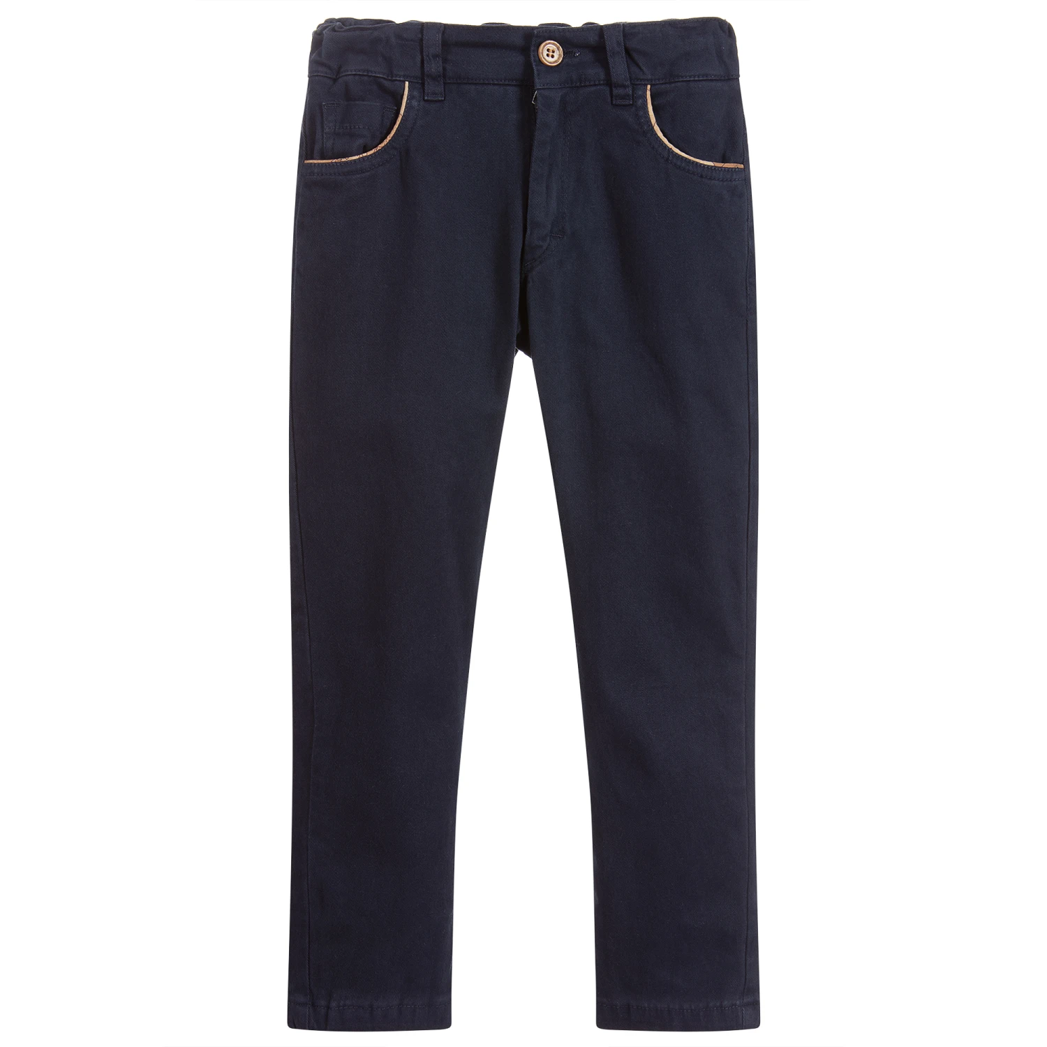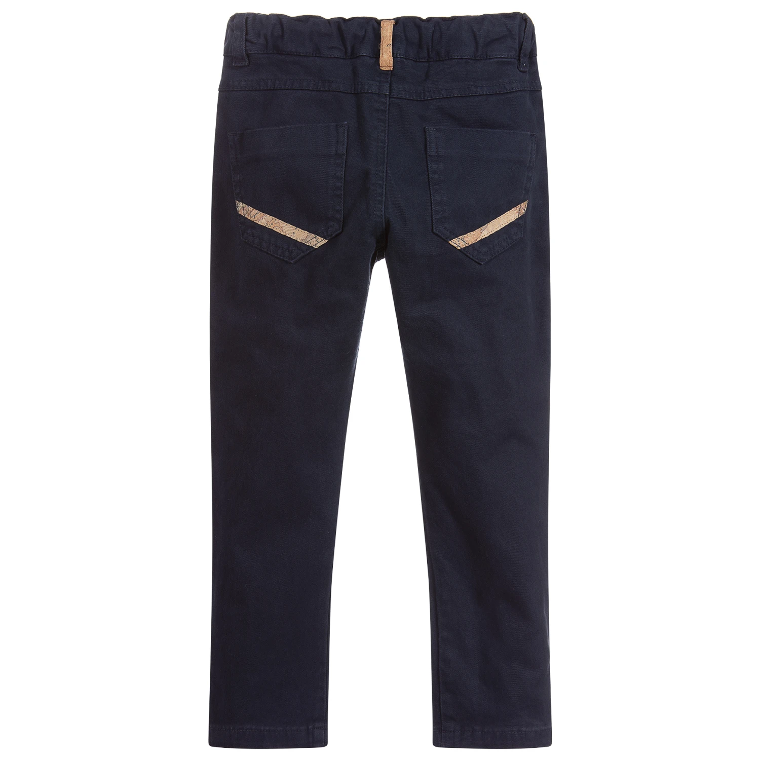 Boys navy blue, mid-weight cotton twill trousers by Alviero Martini, with signature beige Geo map trim on the back and pockets. They have an elasticated, adjustable waistband with a zip and button fastening on the front.