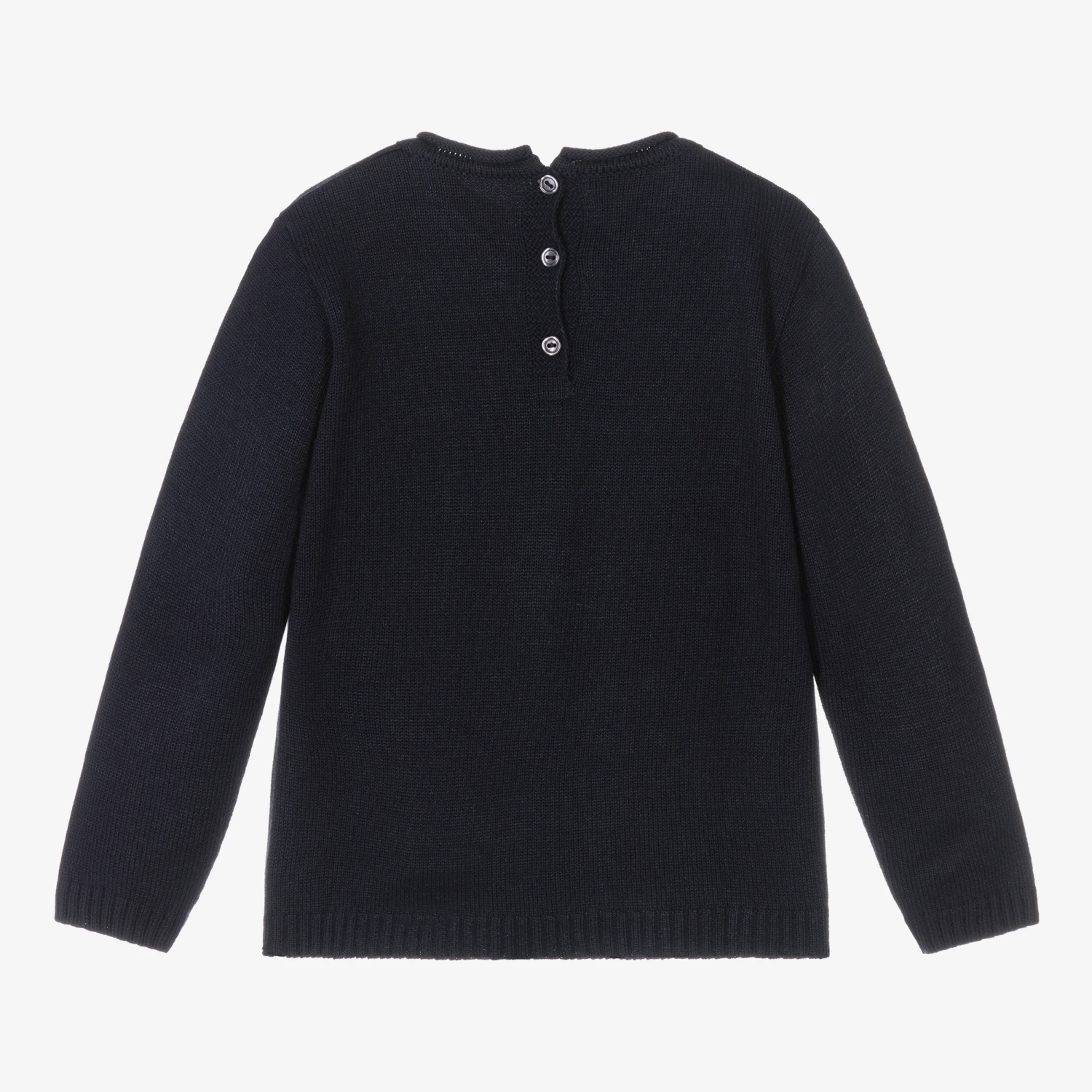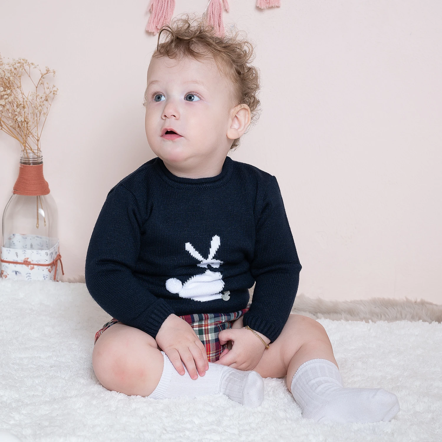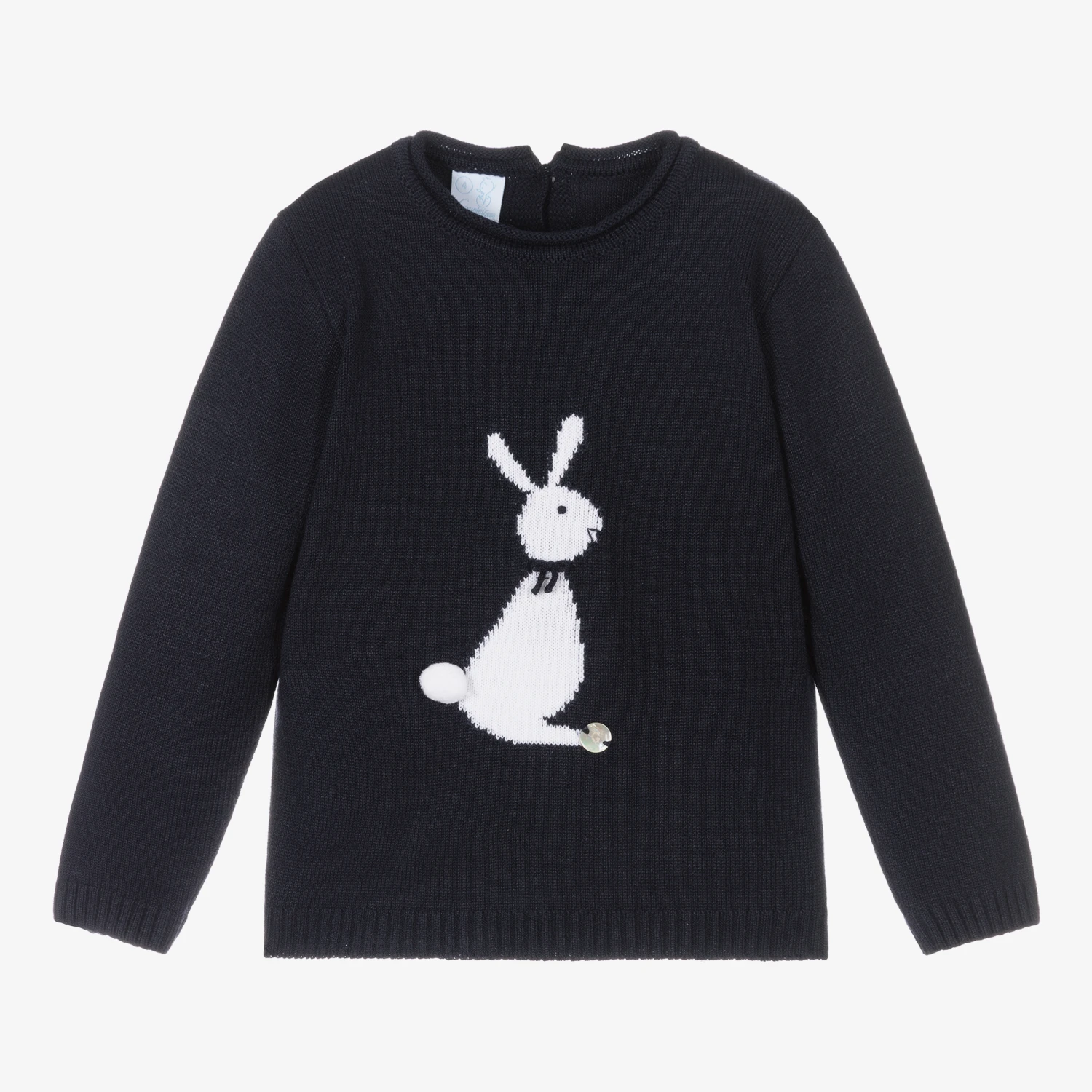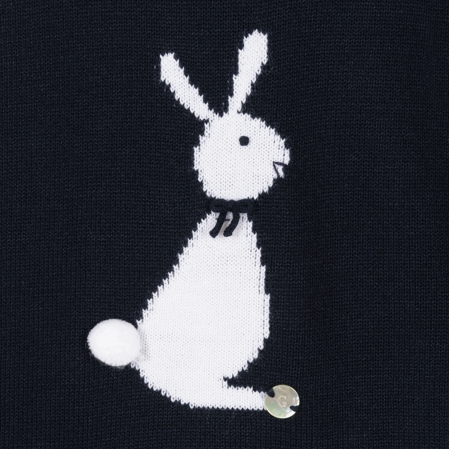 Adorable navy blue knitted sweater for boys and girls by Artesania Granlei. It has a cute white bunny rabbit on the front, with a matching pom-pom tail and a little knitted bow. Mid-weight, it has a curled neckline, ribbed trims and button fastenings on the back to help with dressing.