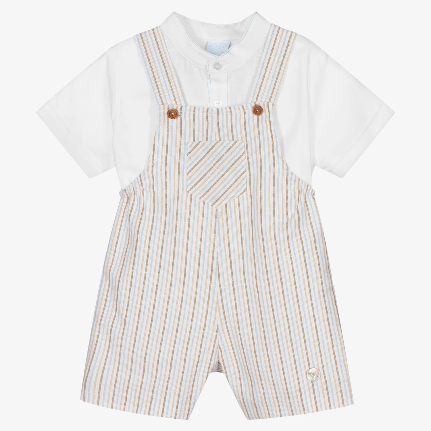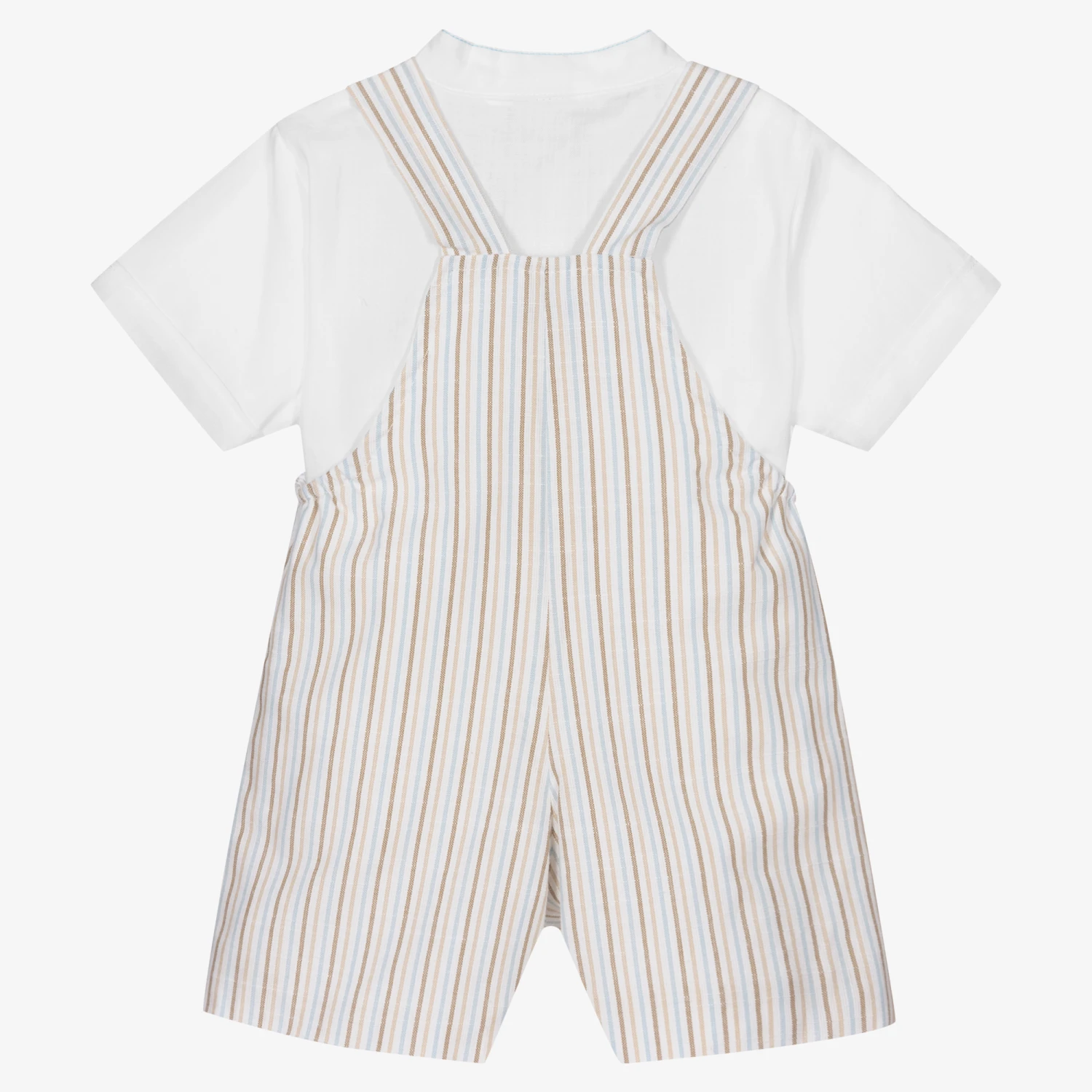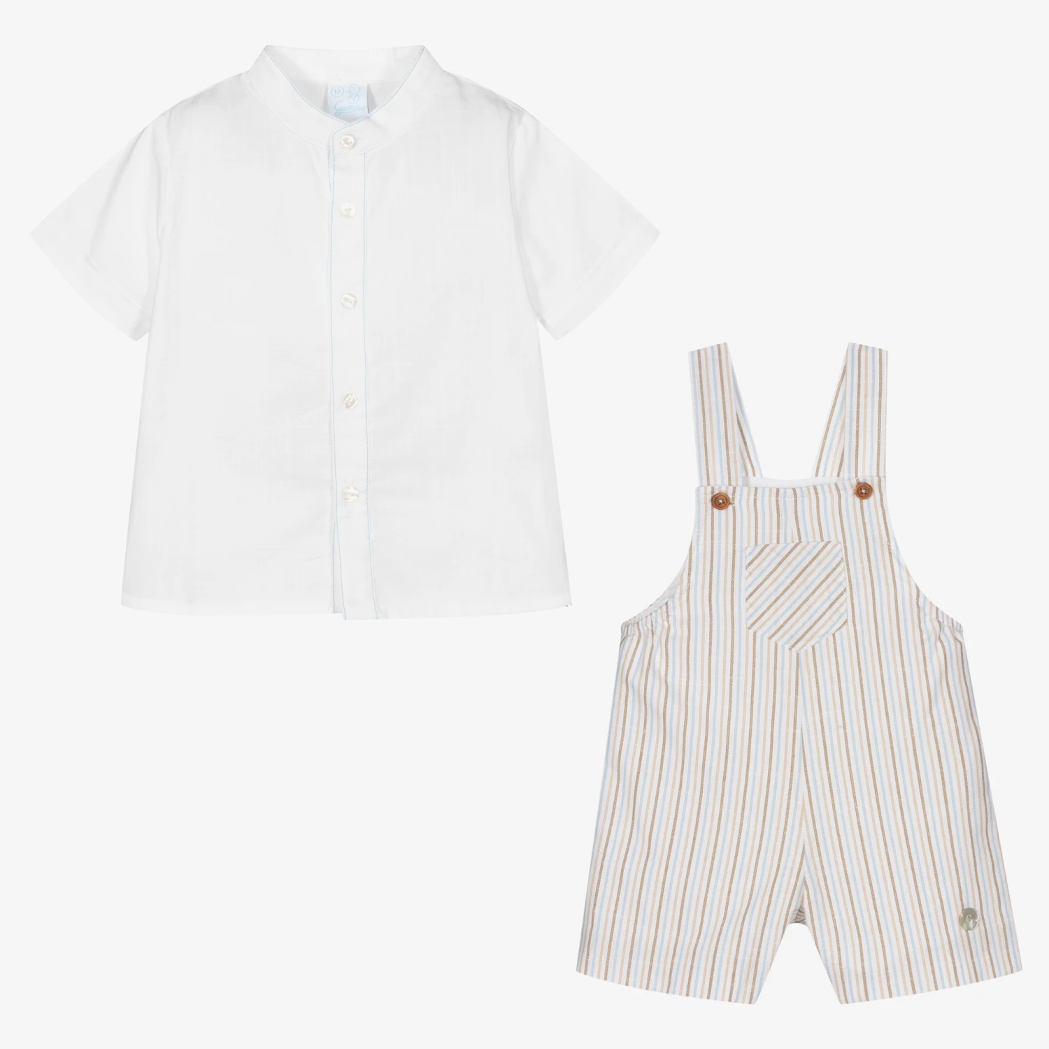 Dungaree shorts set for younger boys by Artesania Granlei. The white lightweight cotton shirt has pale blue stitching detail around the neckline and placket. The ivory, beige and blue striped dungarees are made in a cotton and linen blend, with wooden button fastenings on the shoulder straps. They have the brand’s mother-of-pearl logo charm sewn on one side.