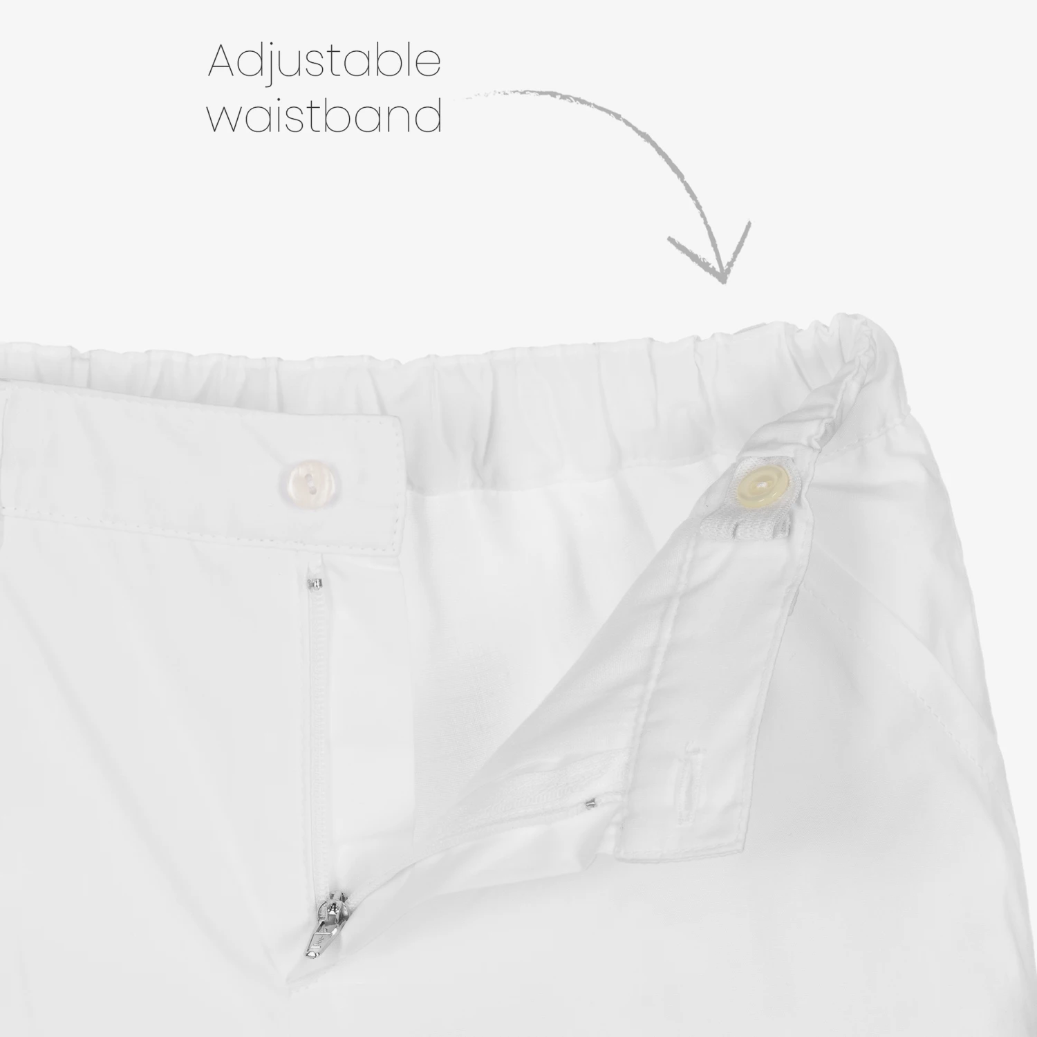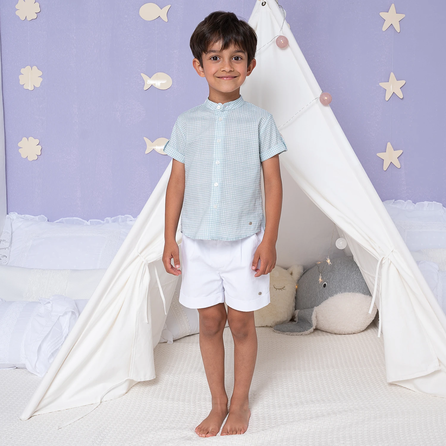 Ideal for smart-casual wear, this classic shirt and shorts set for boys is by Spanish brand Artesania Granlei. Made from soft cotton in a collarless style, the green and white gingham shirt has turned-up short sleeves, trimmed with button tabs. Fully lined for comfort, the white cotton shorts have an adjustable waist, faux pockets, and a button and zip fastening on the front.