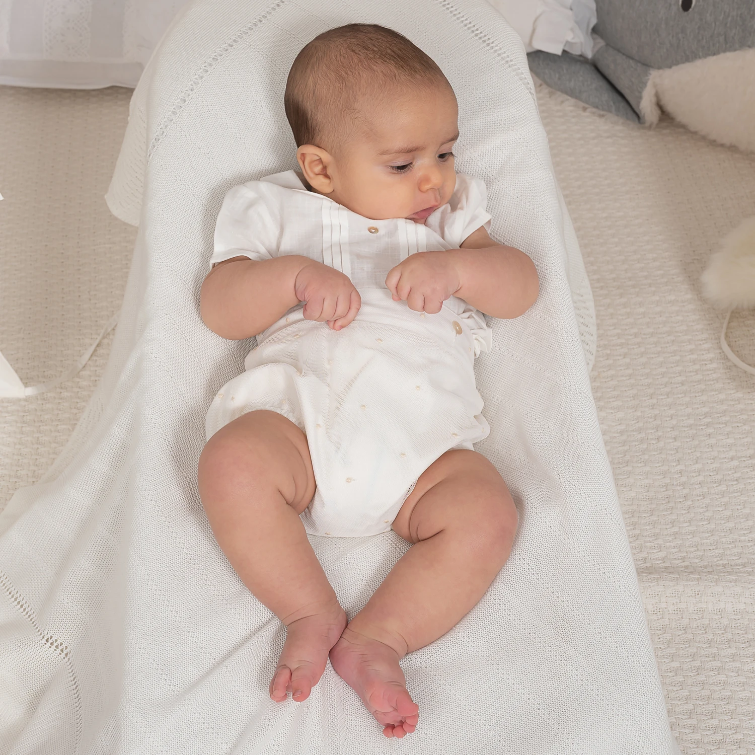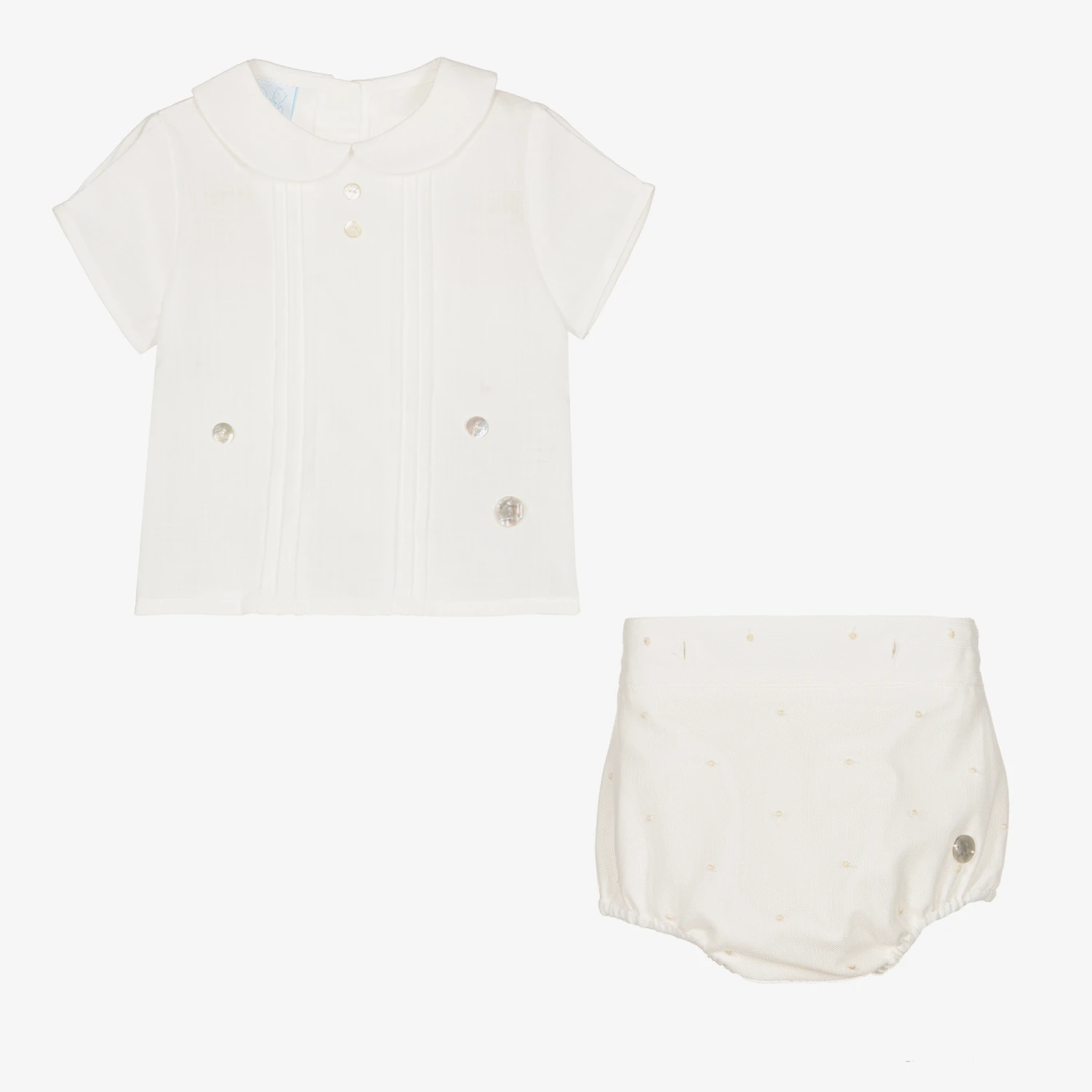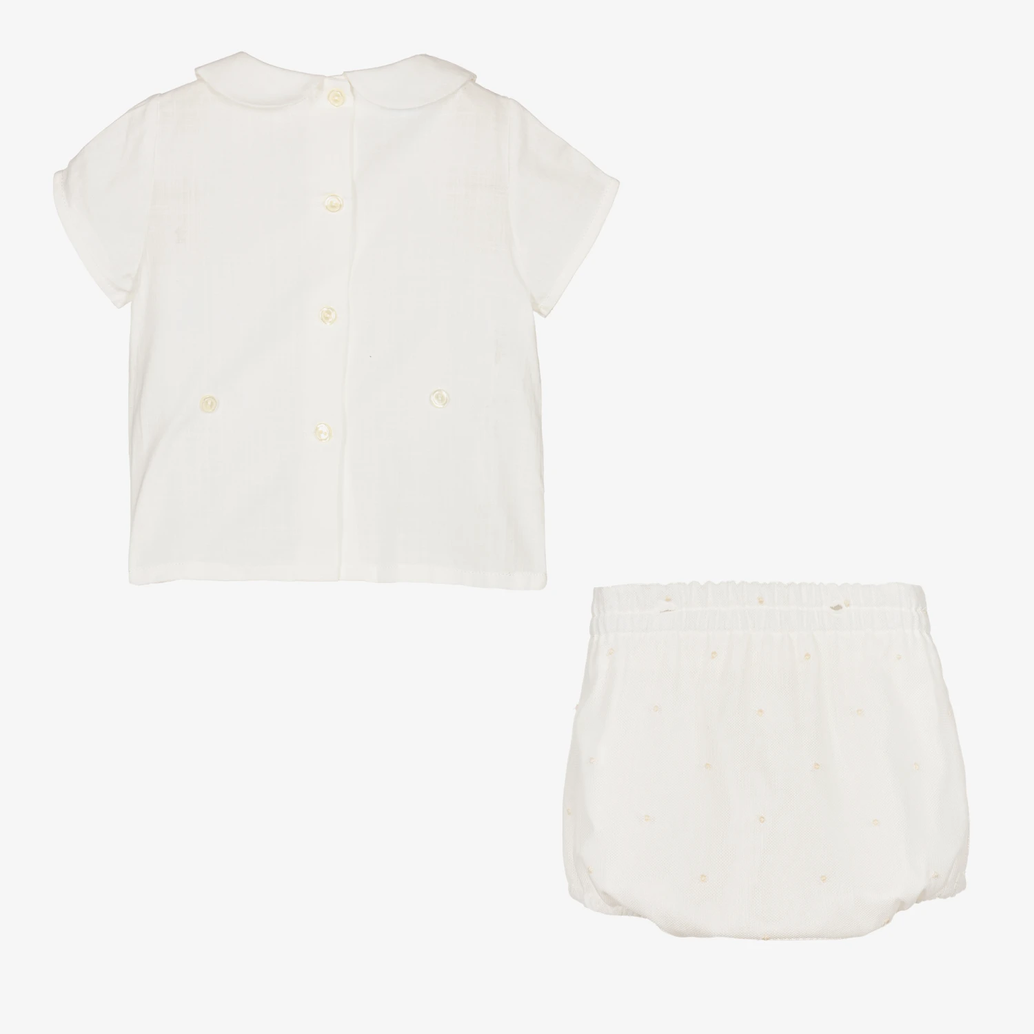 A handsome ivory buster suit for little boys by Spanish brand Artesania Granlei. The soft cotton voile shirt has a rounded collar, decorative mother-of-pearl buttons and a charming pleated chest. There are button fastenings on the back. Decorated in polka dot embroidery tulle, the shorts fasten onto the shirt with matching buttons for a traditional style.