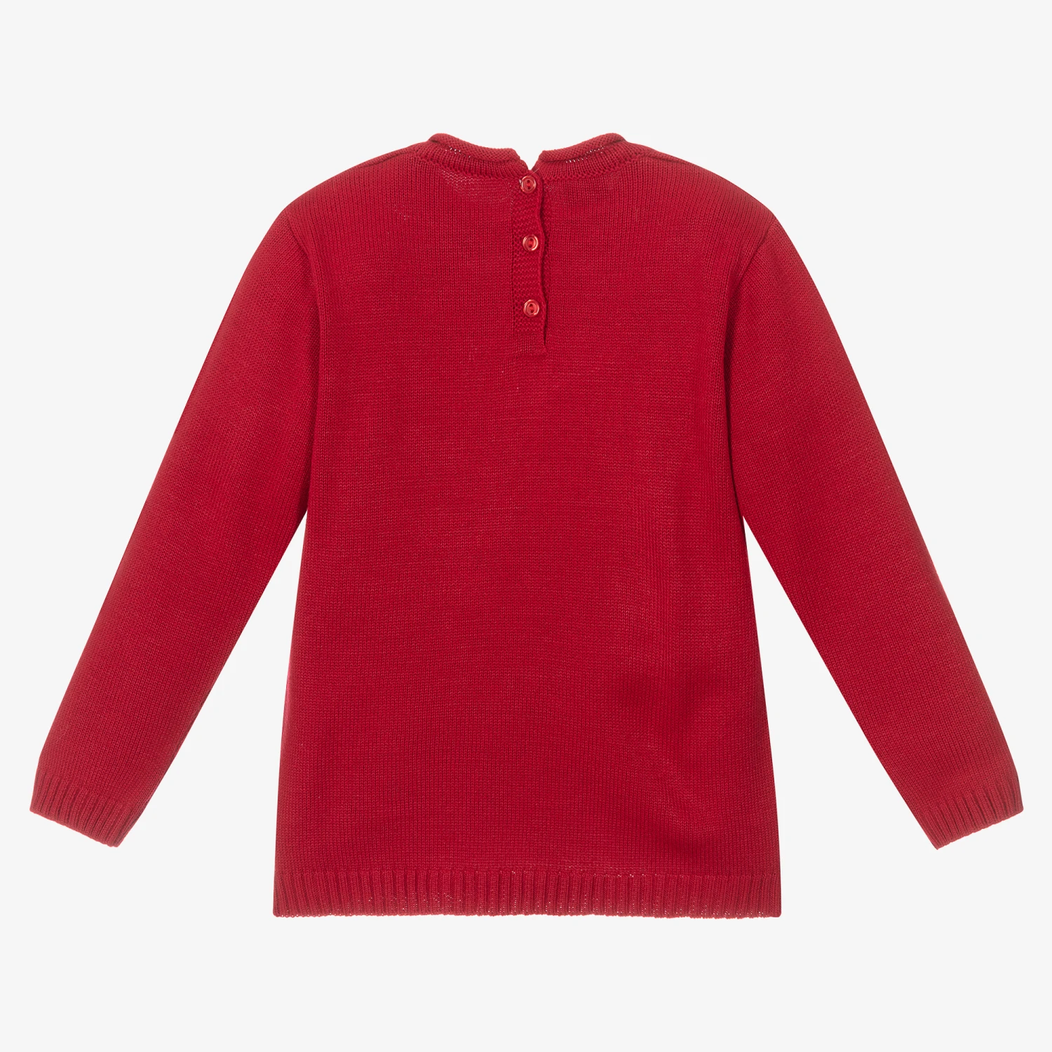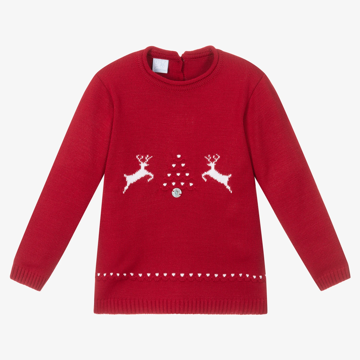 Exclusive to Childrensalon, a red knitted sweater for boys and girls by Artesania Granlei. It has white reindeer on the front, a raised knitted tree with an attached pearlized logo disc, and a complementing festive white pattern above the hem. Mid-weight, it has a curl knit collar neckline with gently ribbed trims, and button fastenings on the back to help with quick and easy dressing.