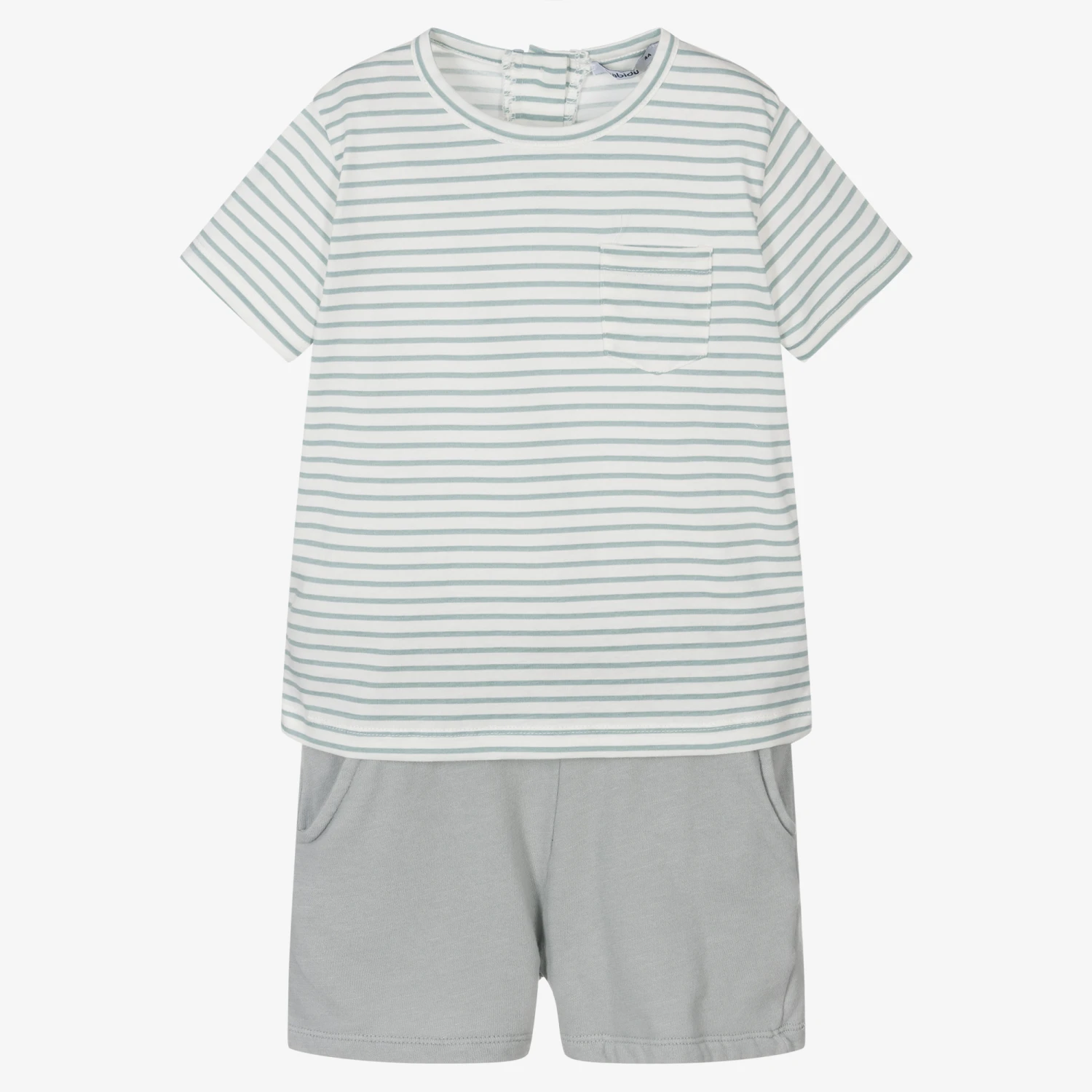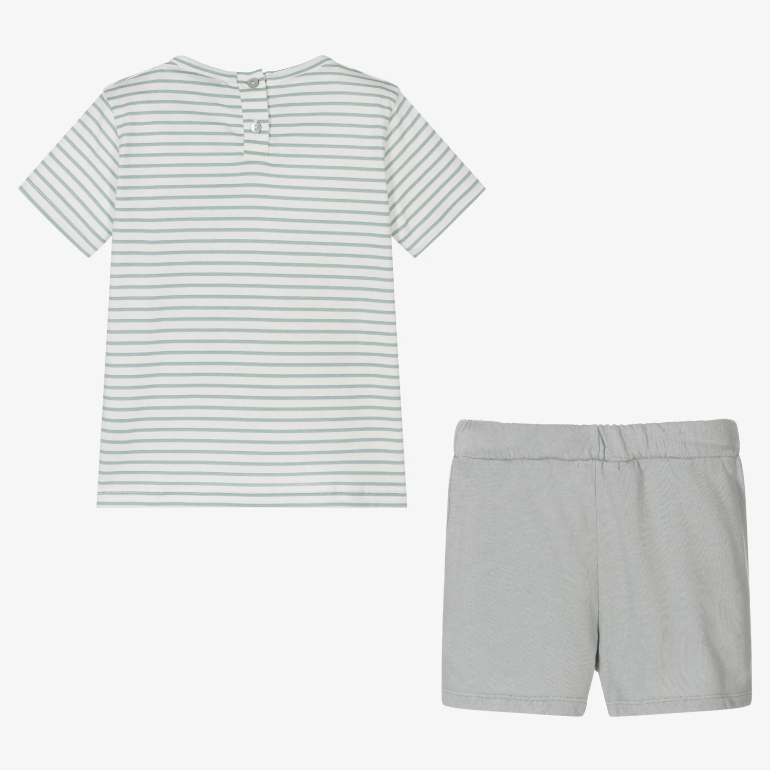 A comfortable and casual top and shorts set for younger boys by Babidu, made in soft organic cotton jersey. The white and grey striped T-shirt has a chest pocket and fastens with mother-of-pearl buttons on the back. The grey shorts have a lovely soft terry feel inside, with a gently elasticated waist and pockets on the front.