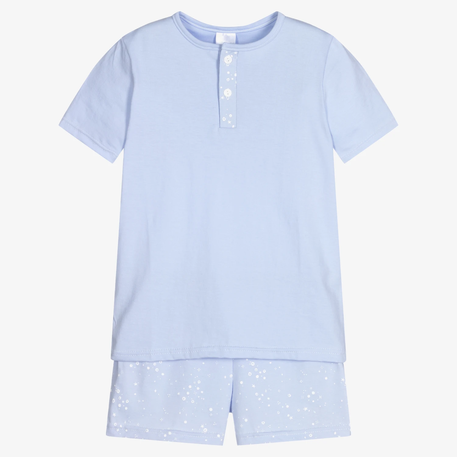 Short pale blue pyjamas for boys by Babidu, patterned with white stars on the shorts. They are made in comfortable cotton jersey with a matching star-patterned placket and white button fastenings on the top. They have an elasticated waist for a comfortable fit.