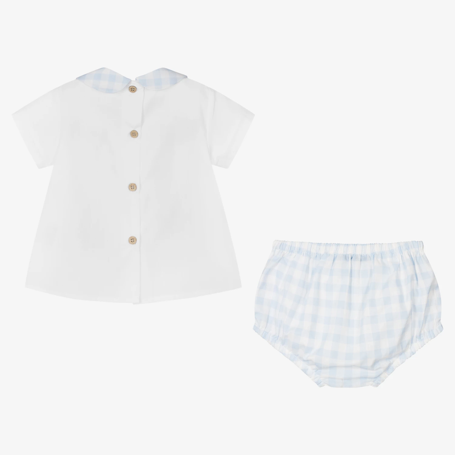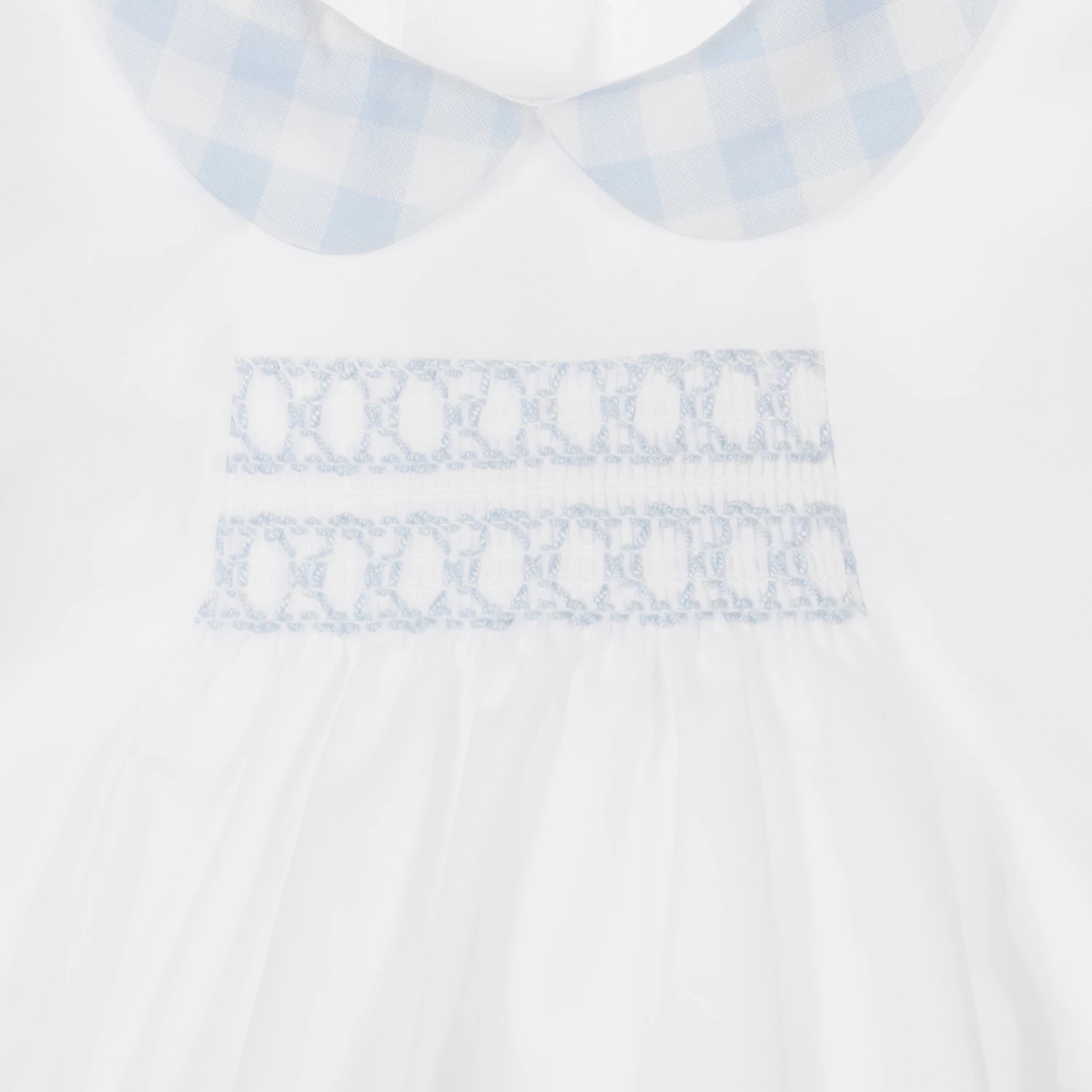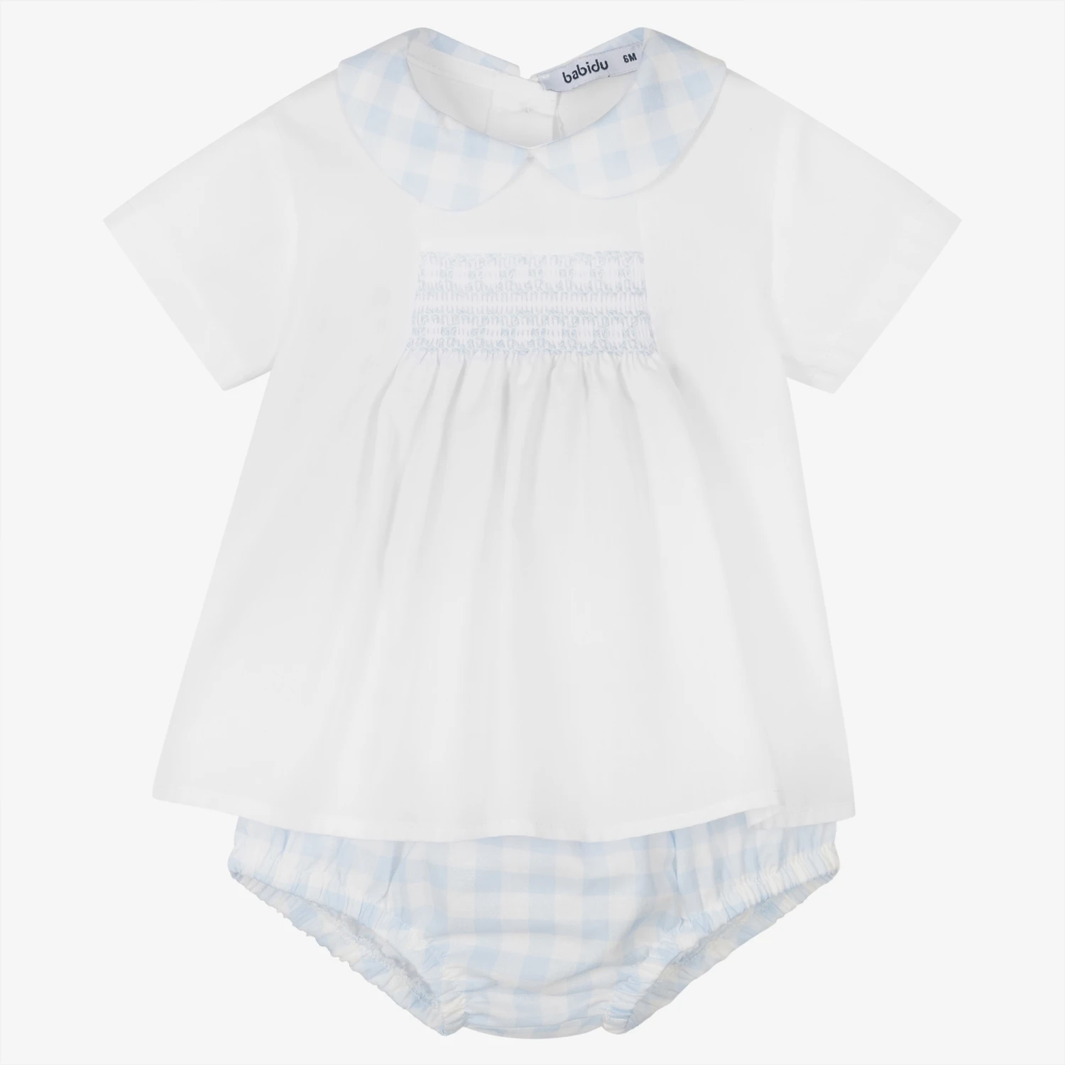 Adorable white and blue checked shorts set for little boys by Babidu, made in lightweight cotton poplin. The top has a sweet checked Peter Pan collar, with traditional smocking detail on the chest. The matching checked shorts have a gently elasticated waist and legs for a comfortable fit.