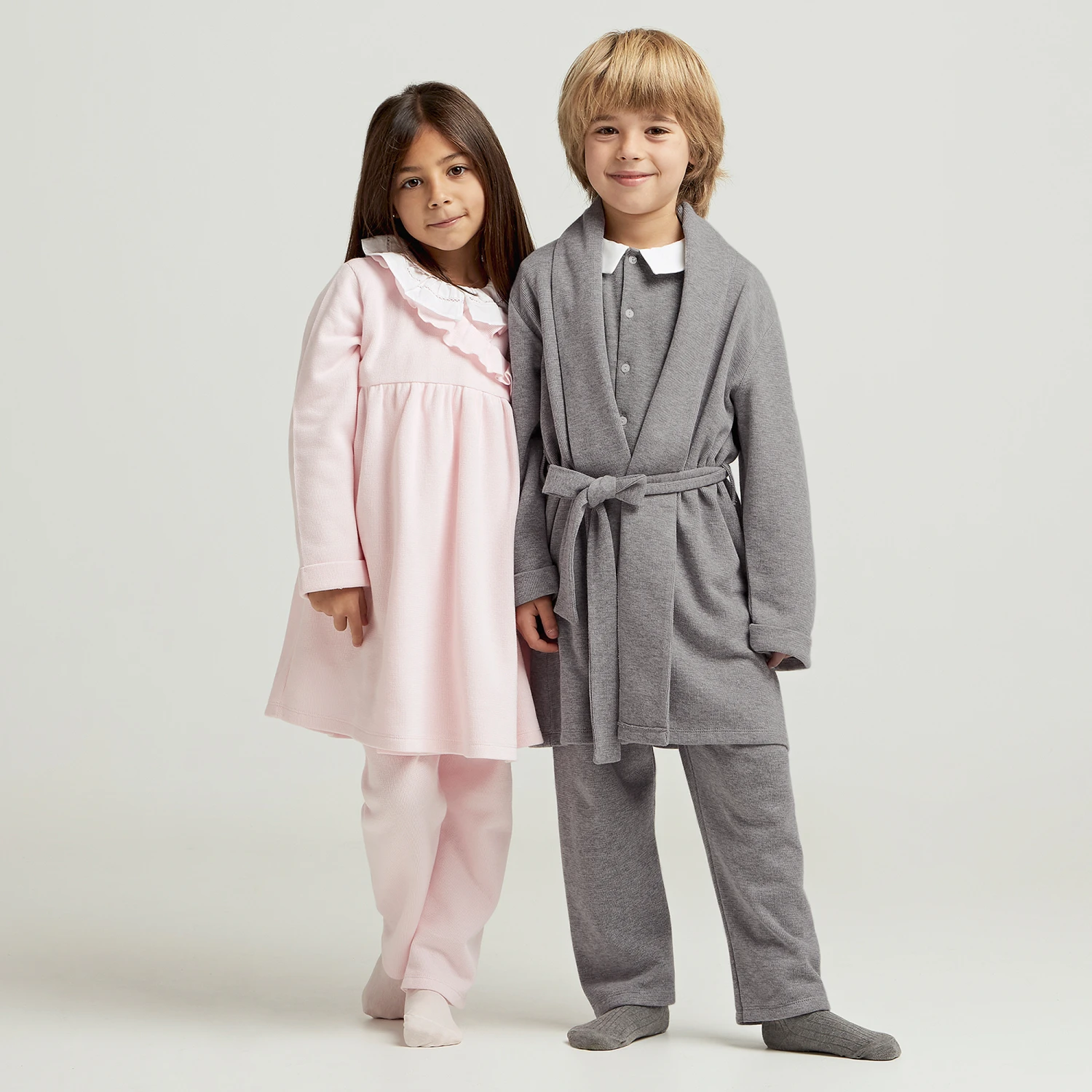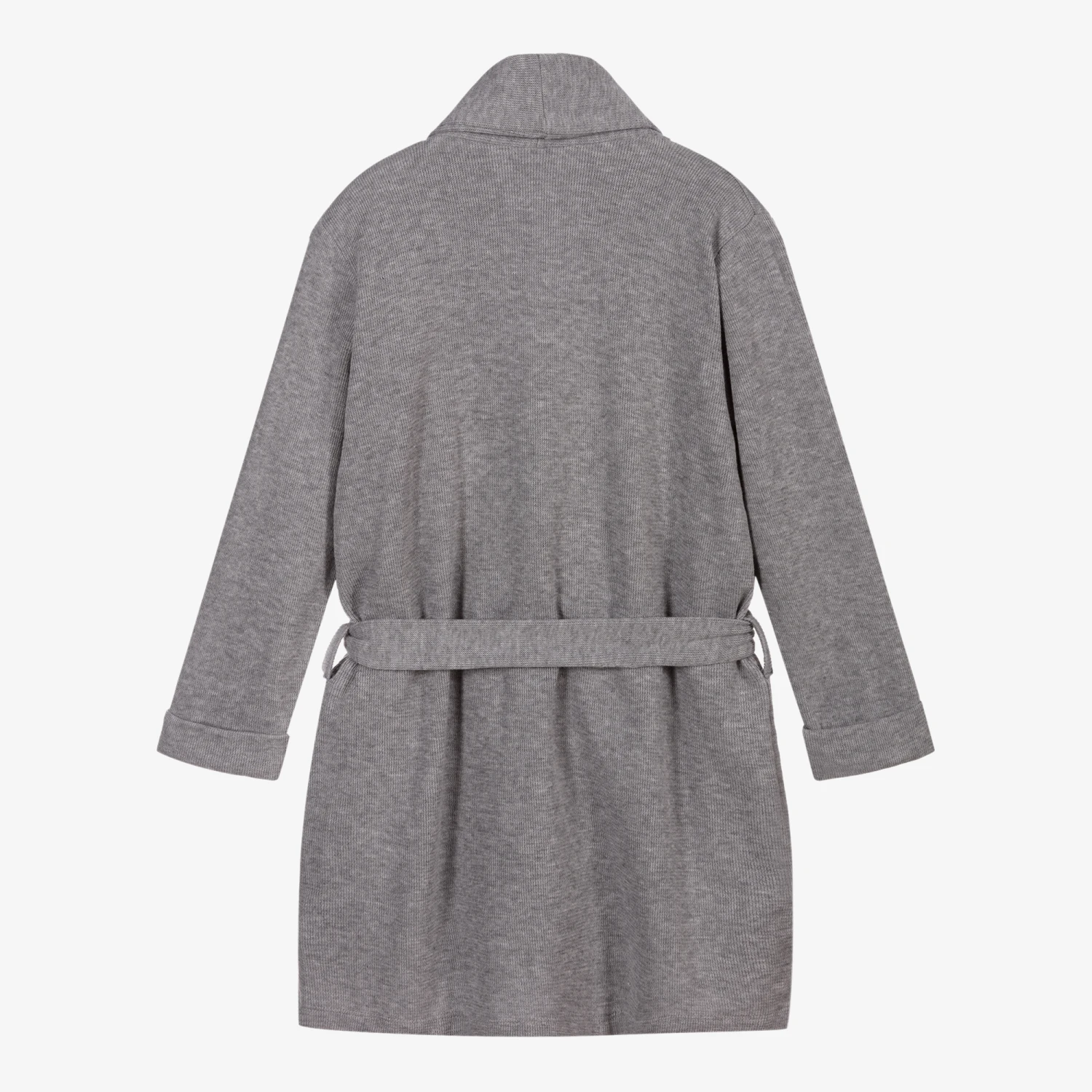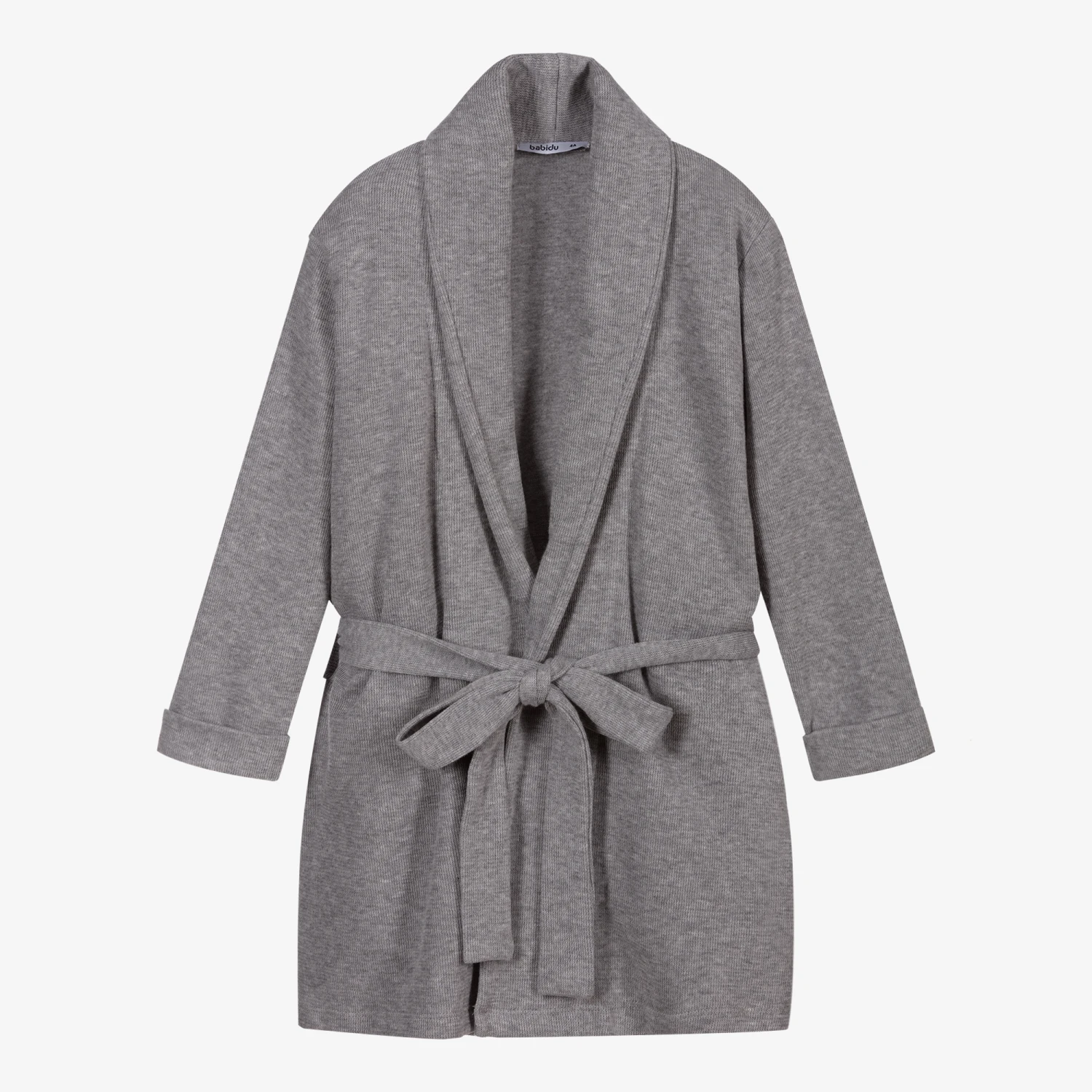 Grey cotton knit dressing gown for younger boys by Babidu. Beautifully soft, with a fleecy lining, this cosy dressing gown has turned up sleeves and a removable tie belt with belt loops.