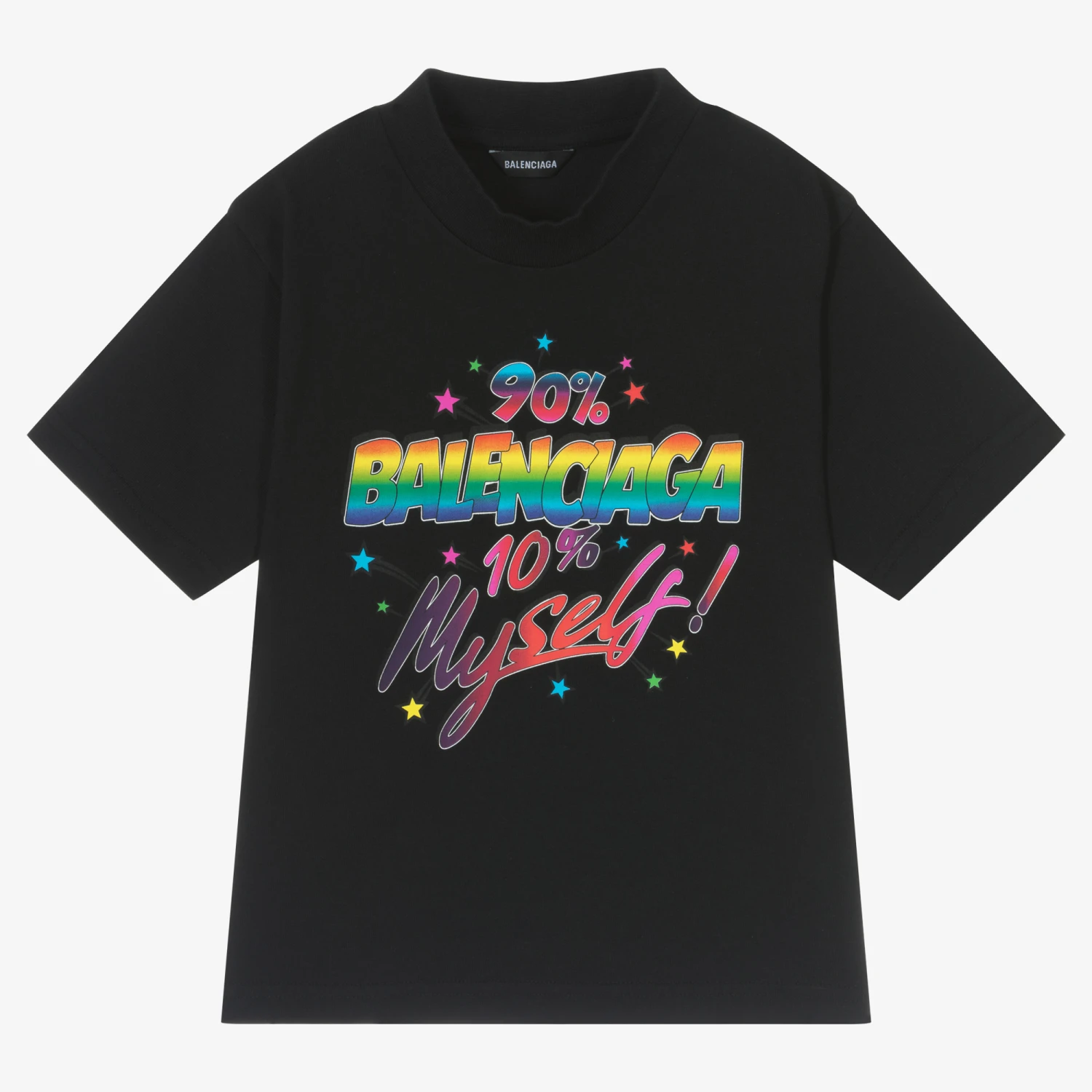 Inspired by the 90’s, black logo-inspired T-shirt for boys and girls by luxury designer Balenciaga. Made in soft cotton jersey, this statement tee has a vibrant rainbow logo artwork on the front, and a relaxed crew neckline.