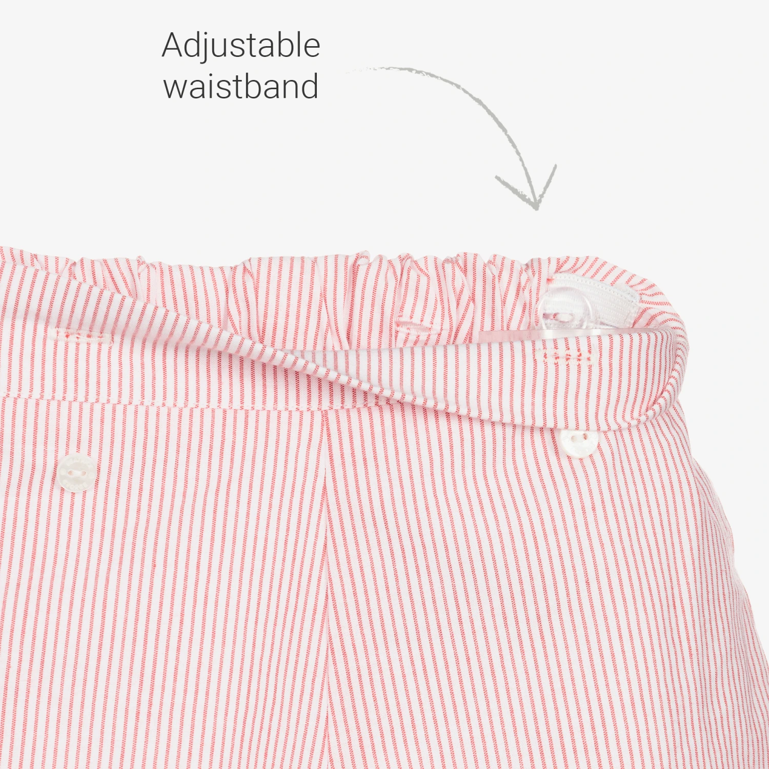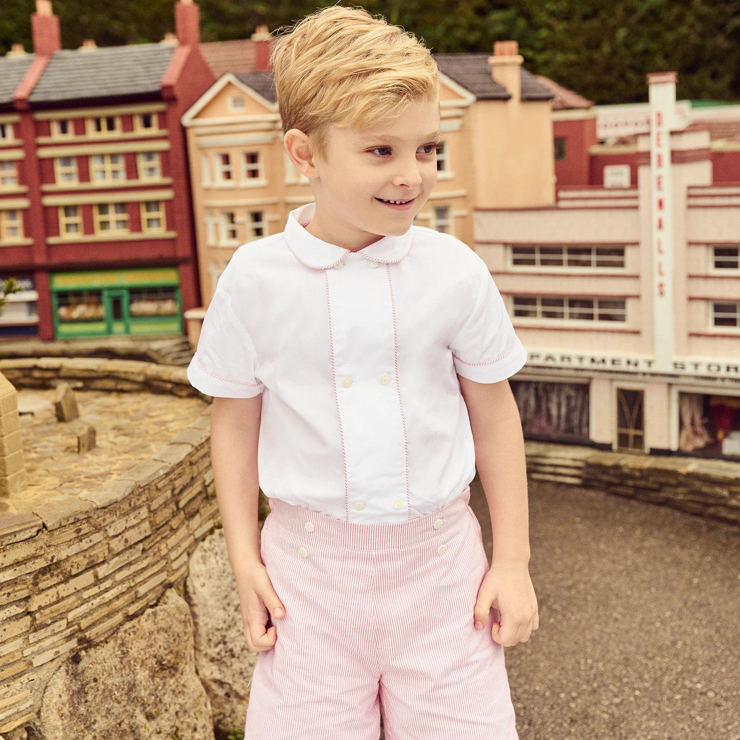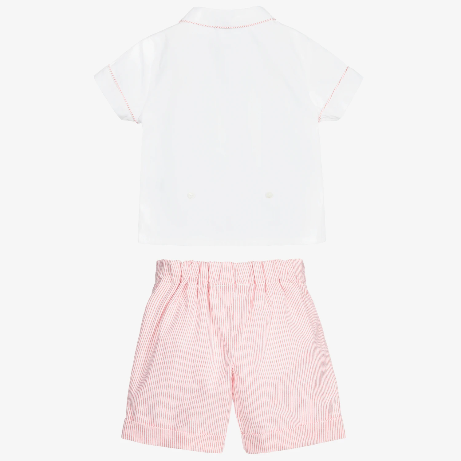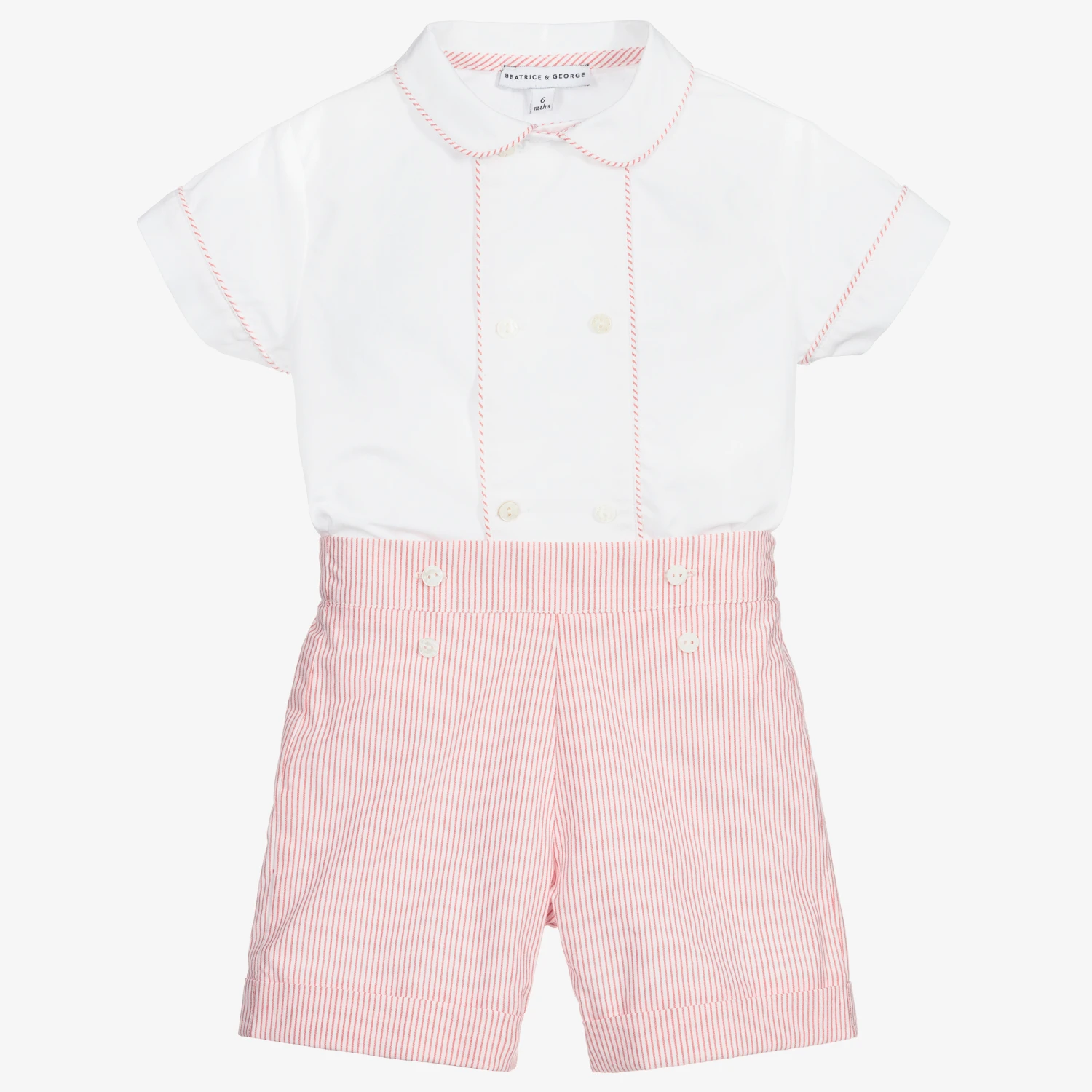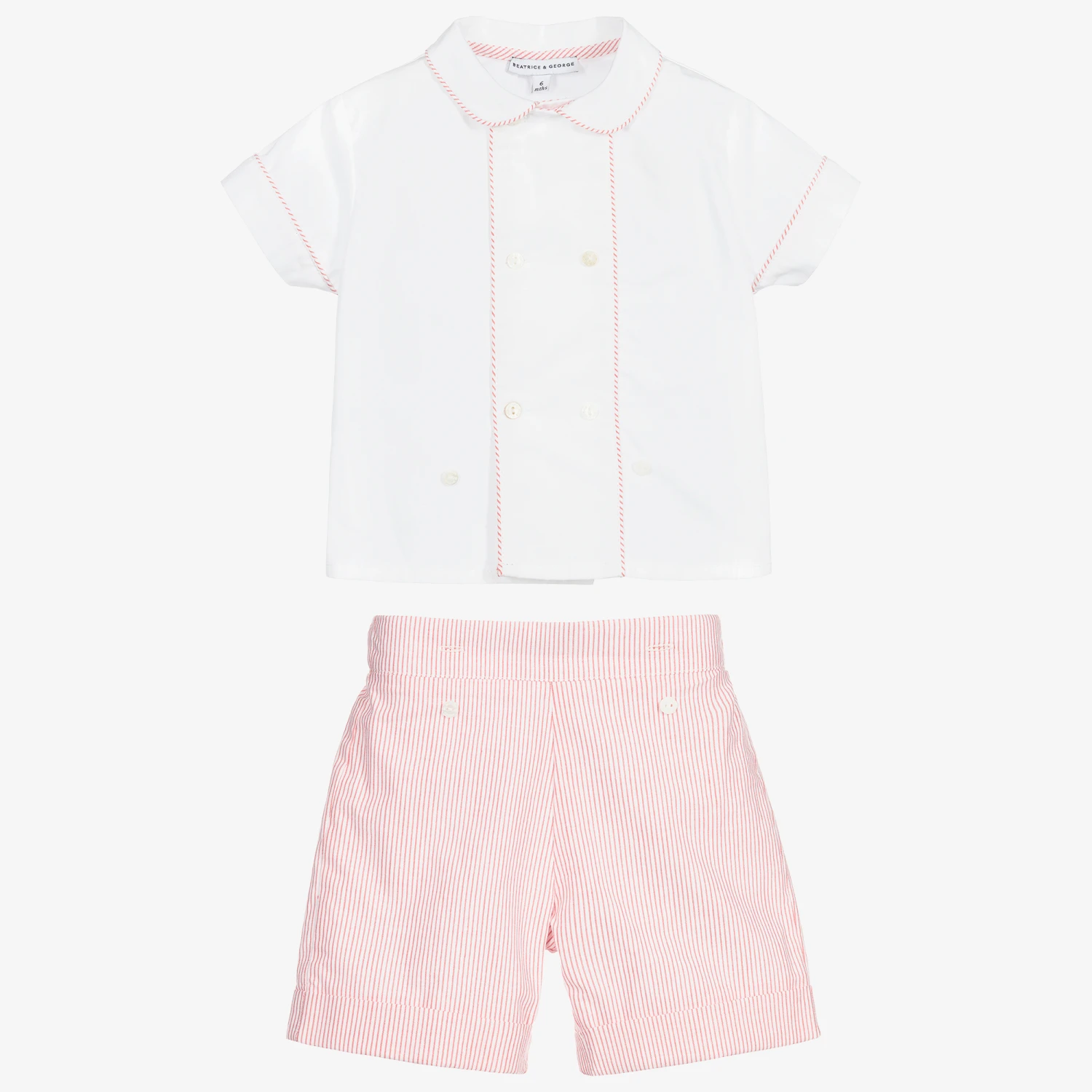 White and red traditional shorts set for boys from British brand Beatrice & George, exclusive to Childrensalon. Made in lightweight cotton, the shirt has striped piping trim to match the shorts. The striped cotton shorts are lined for comfort and have an adjustable waist. The shirt buttons onto the shorts so will always stay neatly tucked in.