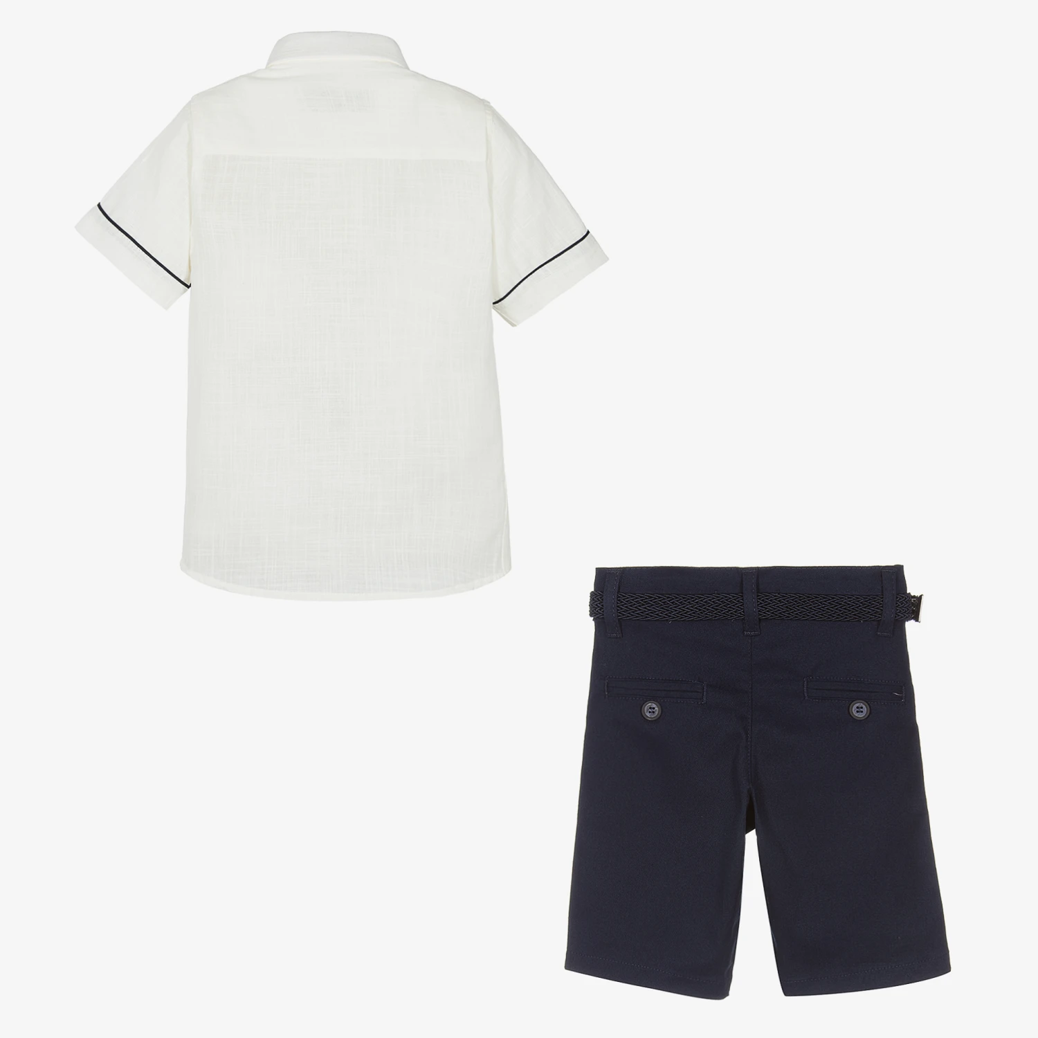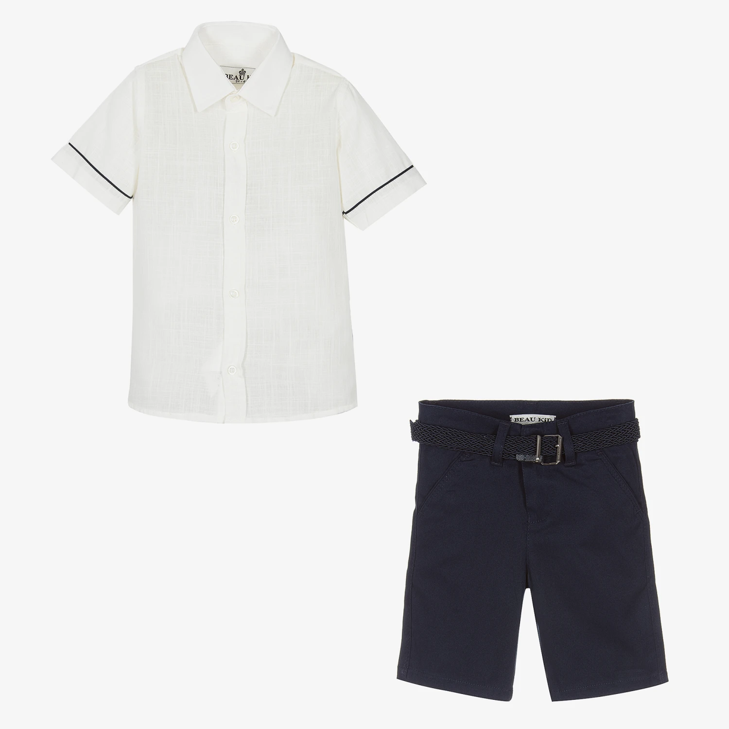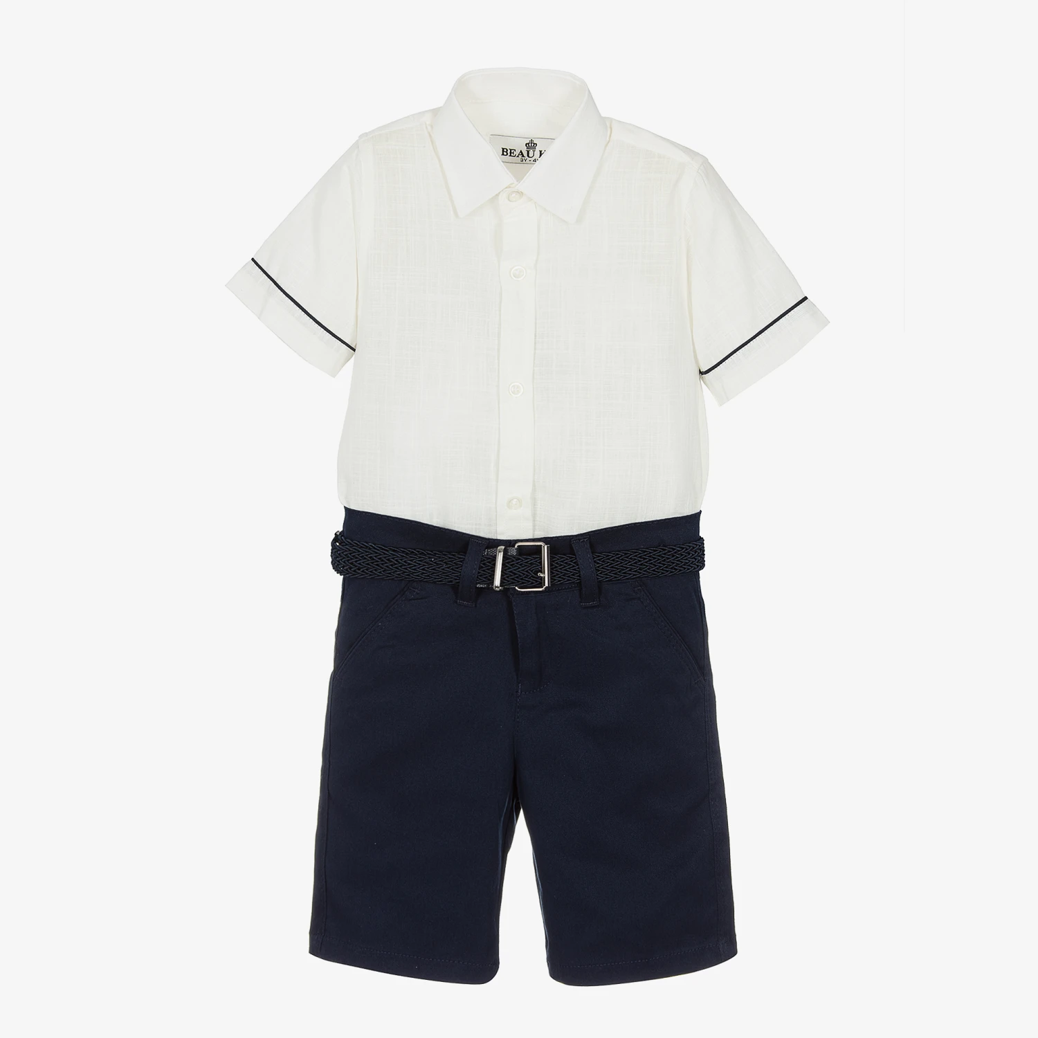 Boys ivory shirt and navy blue shorts set by Beau KiD. The shirt is woven in a soft and lightweight cotton blend and has a pointed collar, blue trims and front button fastening. The smart shorts are Bermuda length and come with a plaited belt that has a buckle fastening. They fasten with a button and zip and have belt loops, side slant pockets and faux pockets on the back.