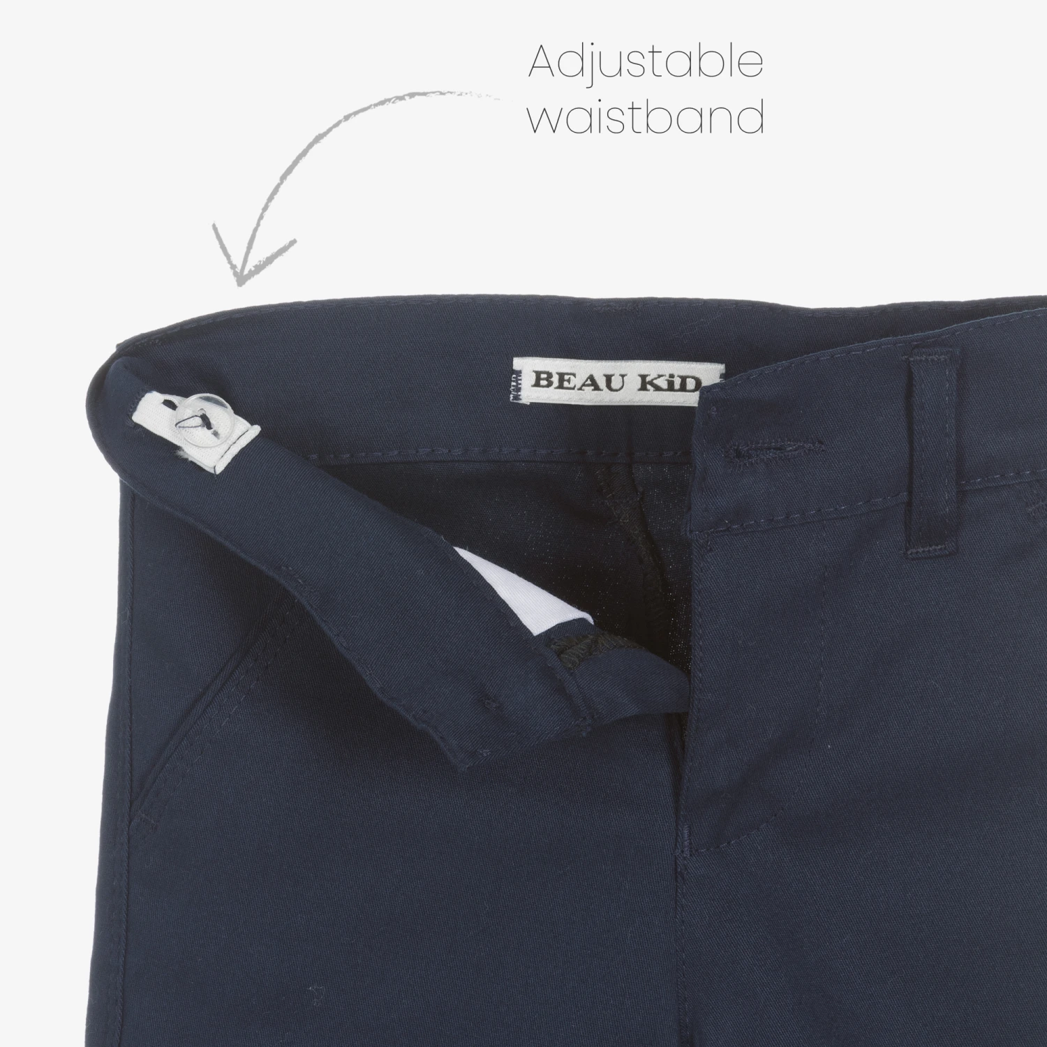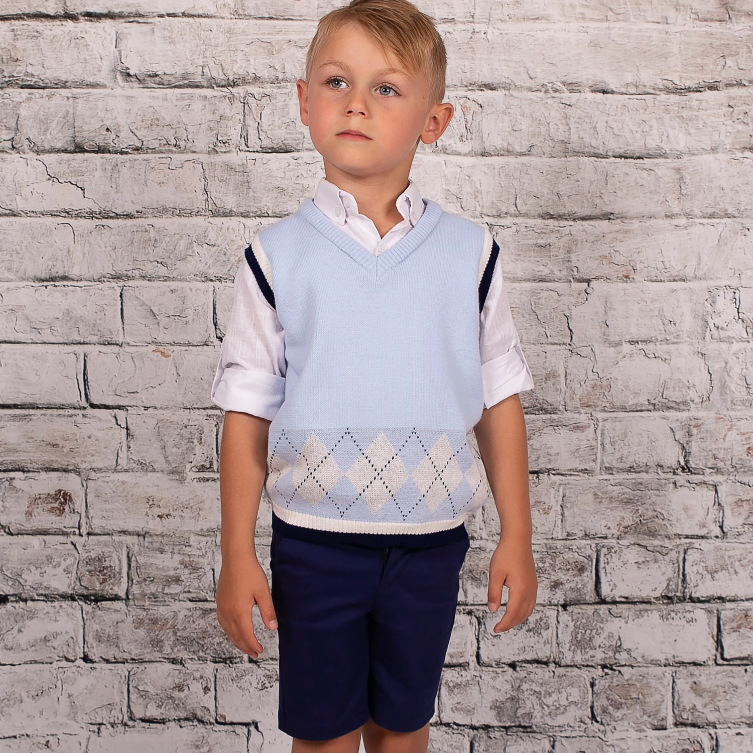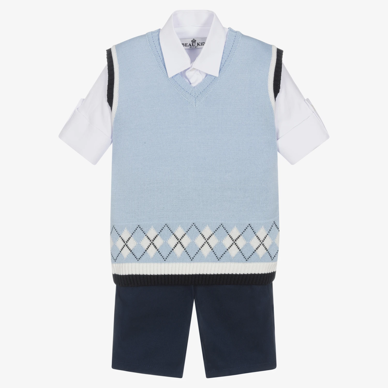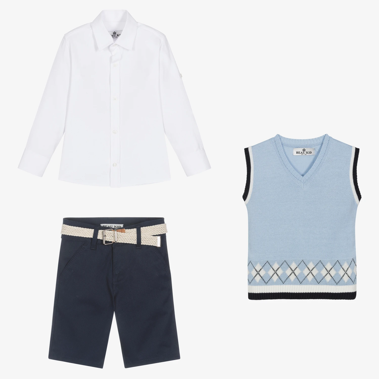 Smart casual three piece shorts set for boys by Beau KiD. The white cotton blend shirt has a textured pattern and sleeves that can be rolled up and secured with a button for a more casual look. The navy blue cotton twill Bermuda-length shorts have slanted front pockets, faux back pockets and an adjustable waist for a comfortable fit. To complete the look, the set comes with a knitted cotton blend slip-over top in pale blue with a stylish Argyll pattern around the hem, and there is a detachable and adjustable beige woven belt.