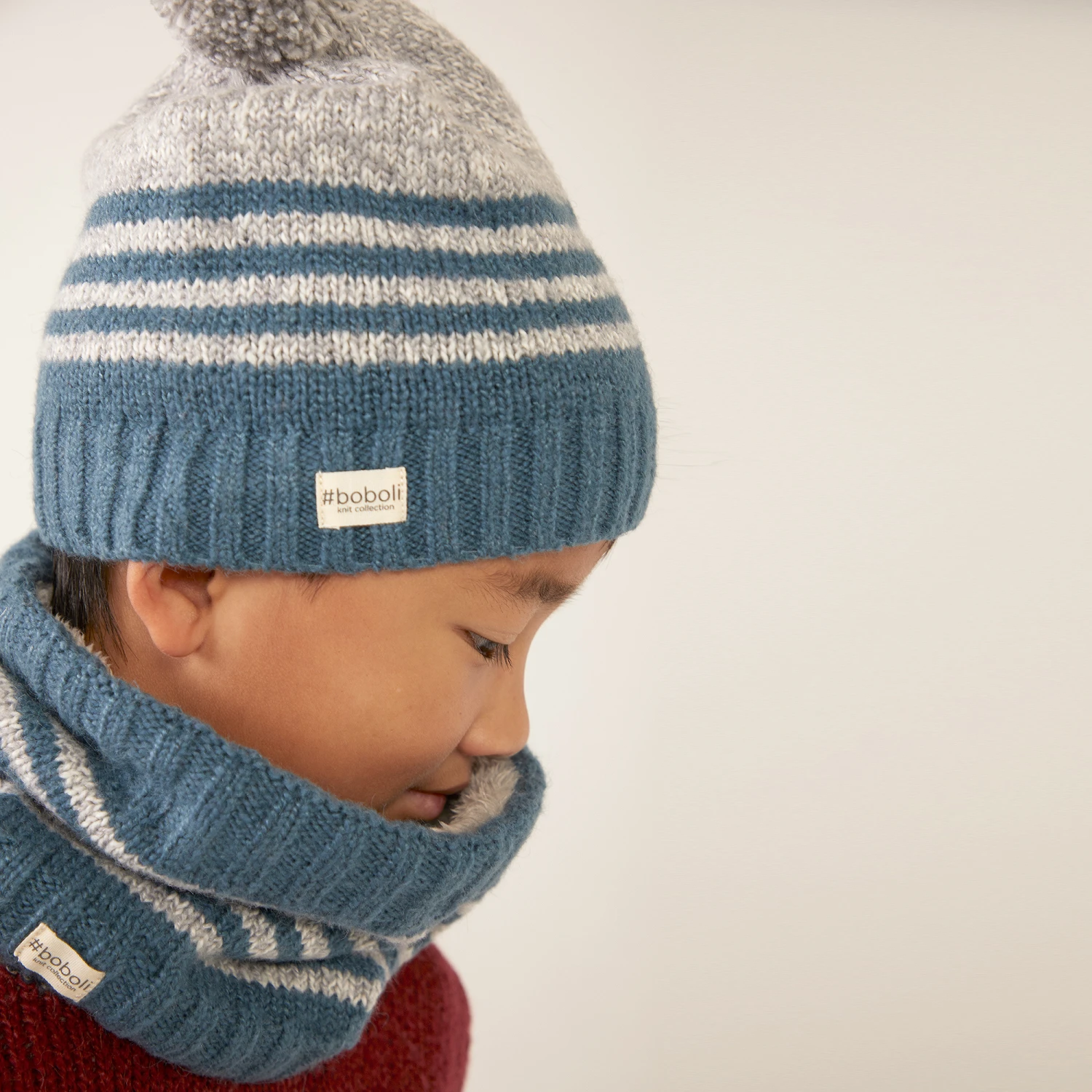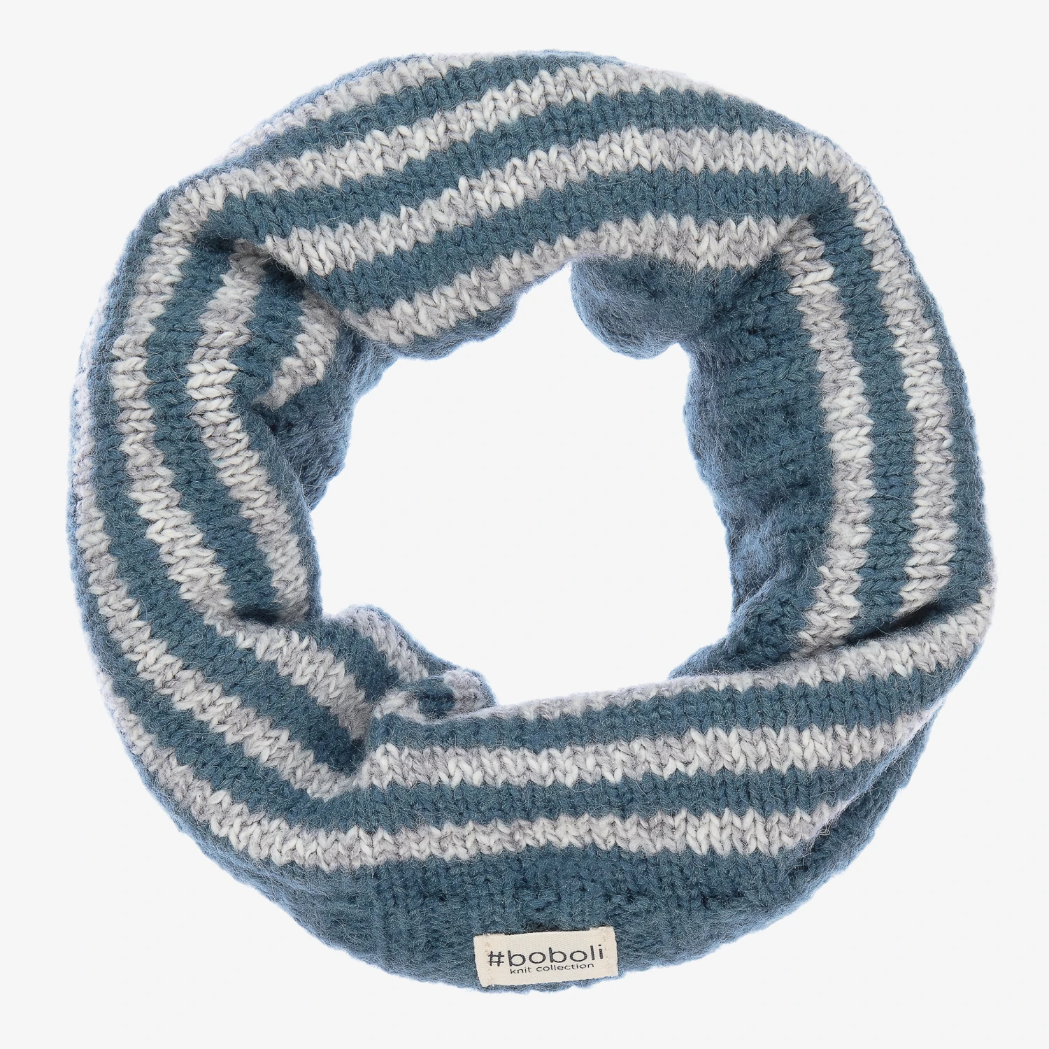 Mid-blue knitted snood scarf for boys and girls by Boboli, knitted in a soft cotton and mohair blend. It is striped in light grey and lined in a soft faux fur for warmth. The brand’s logo patch can be found on the front.