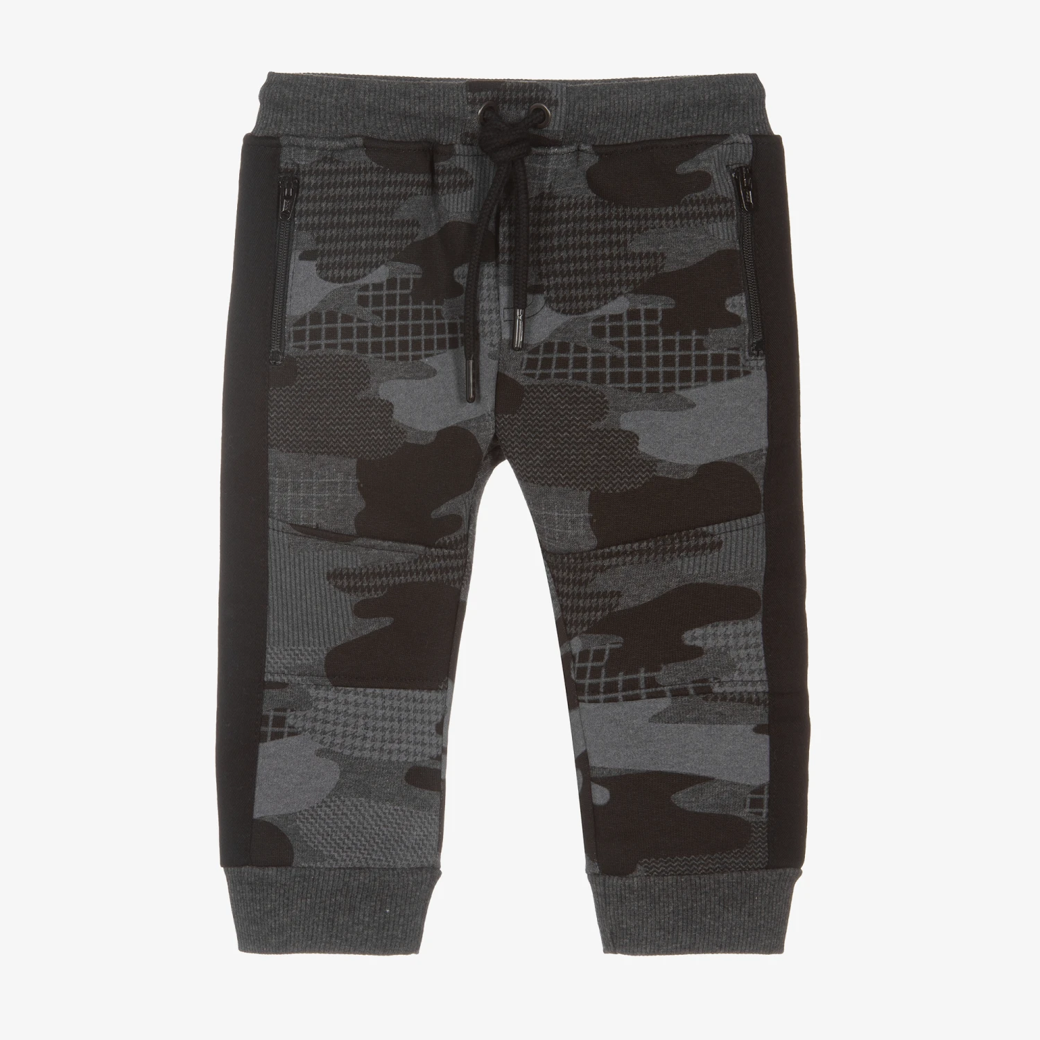 In grey camo with black trims, these joggers for boys are by Spanish brand Boboli. They are made in a soft cotton blend jersey, with a warm fleecy inside. The ribbed waistband has a drawstring tie to ensure a comfortable fit, and there are useful zipped pockets on the sides.