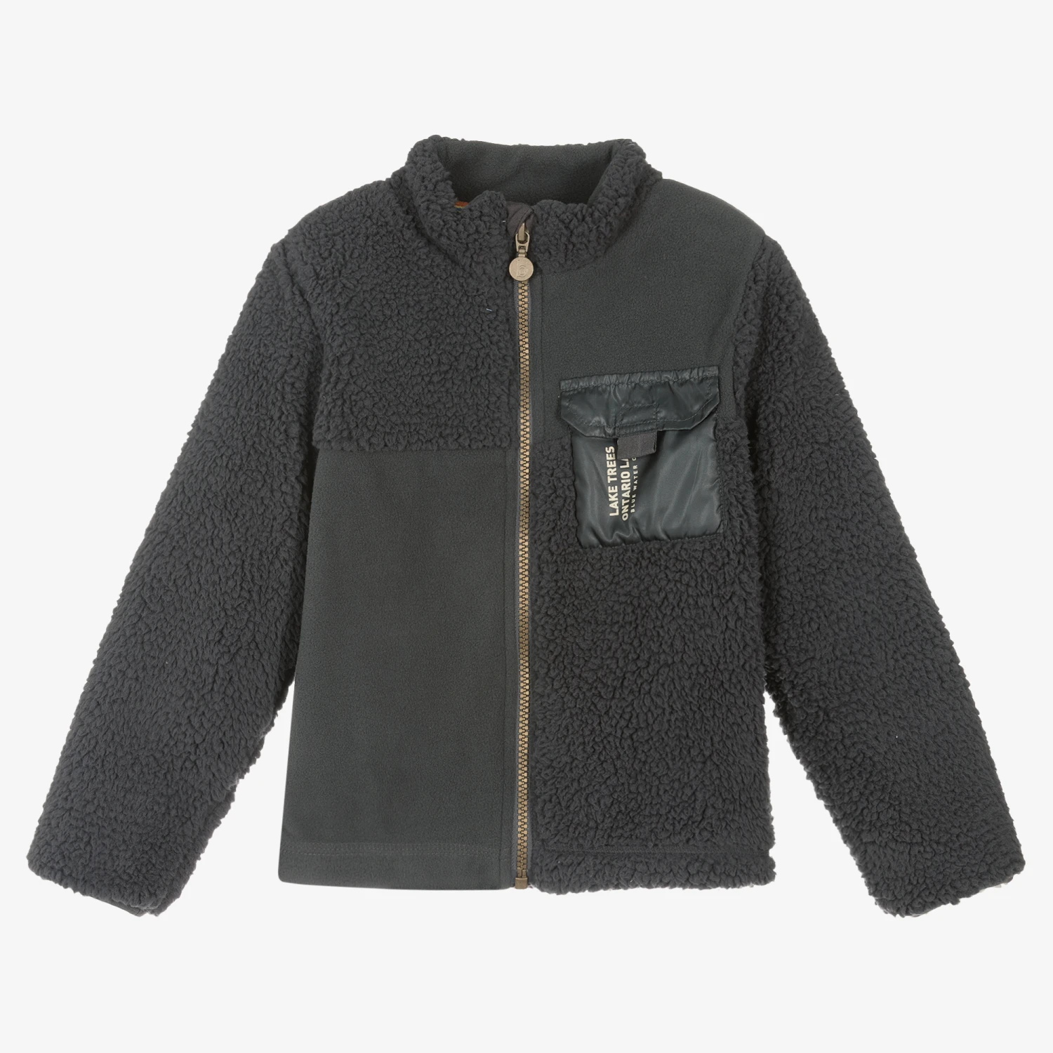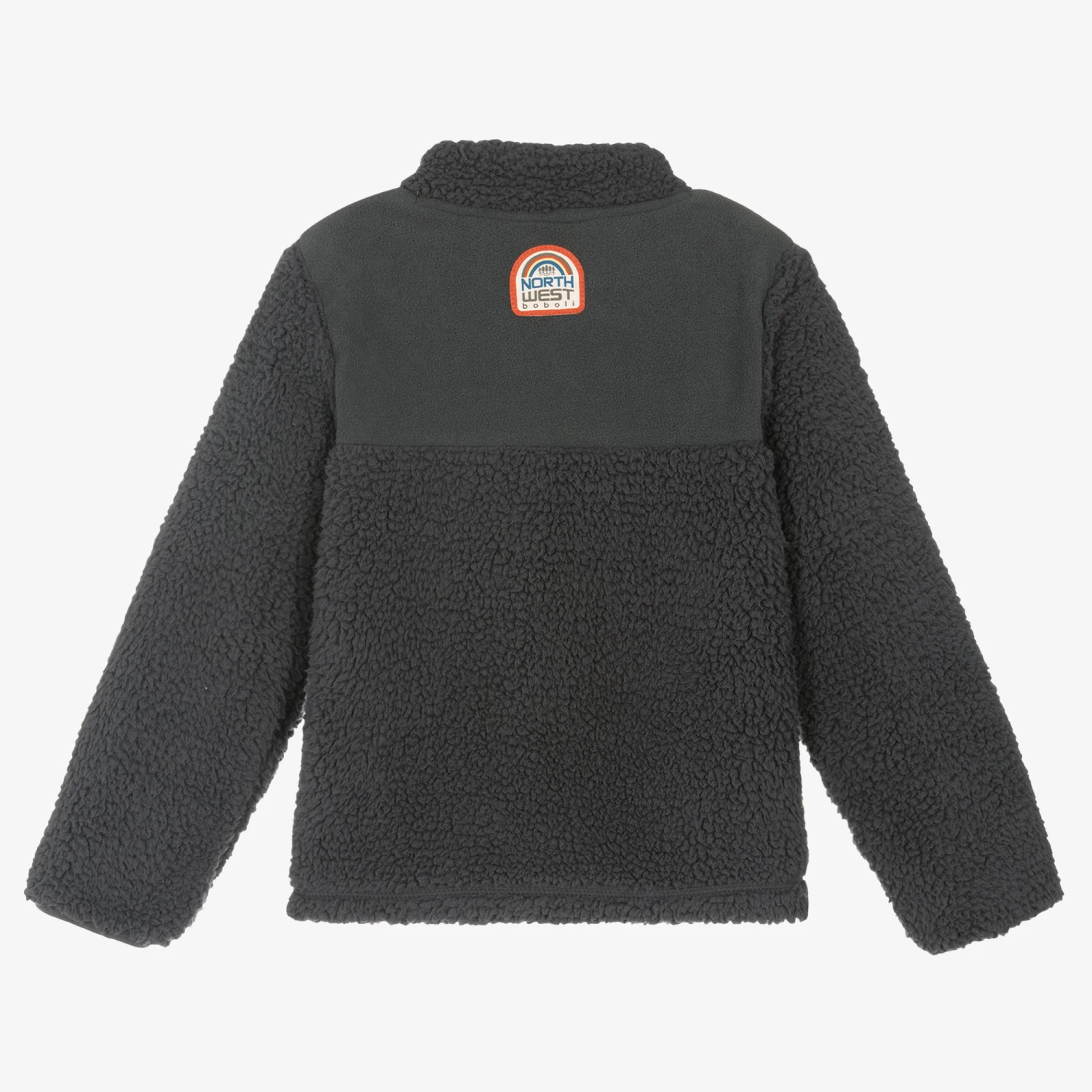 Boys dark grey zip-up top by Boboli, made in soft polyester fleece. The contrasting panels are made in both polar and teddy fleece, offering up some textural interest to this piece. Fastening with a zip, it has a silky chest pocket and a alpine logo patch on the back.