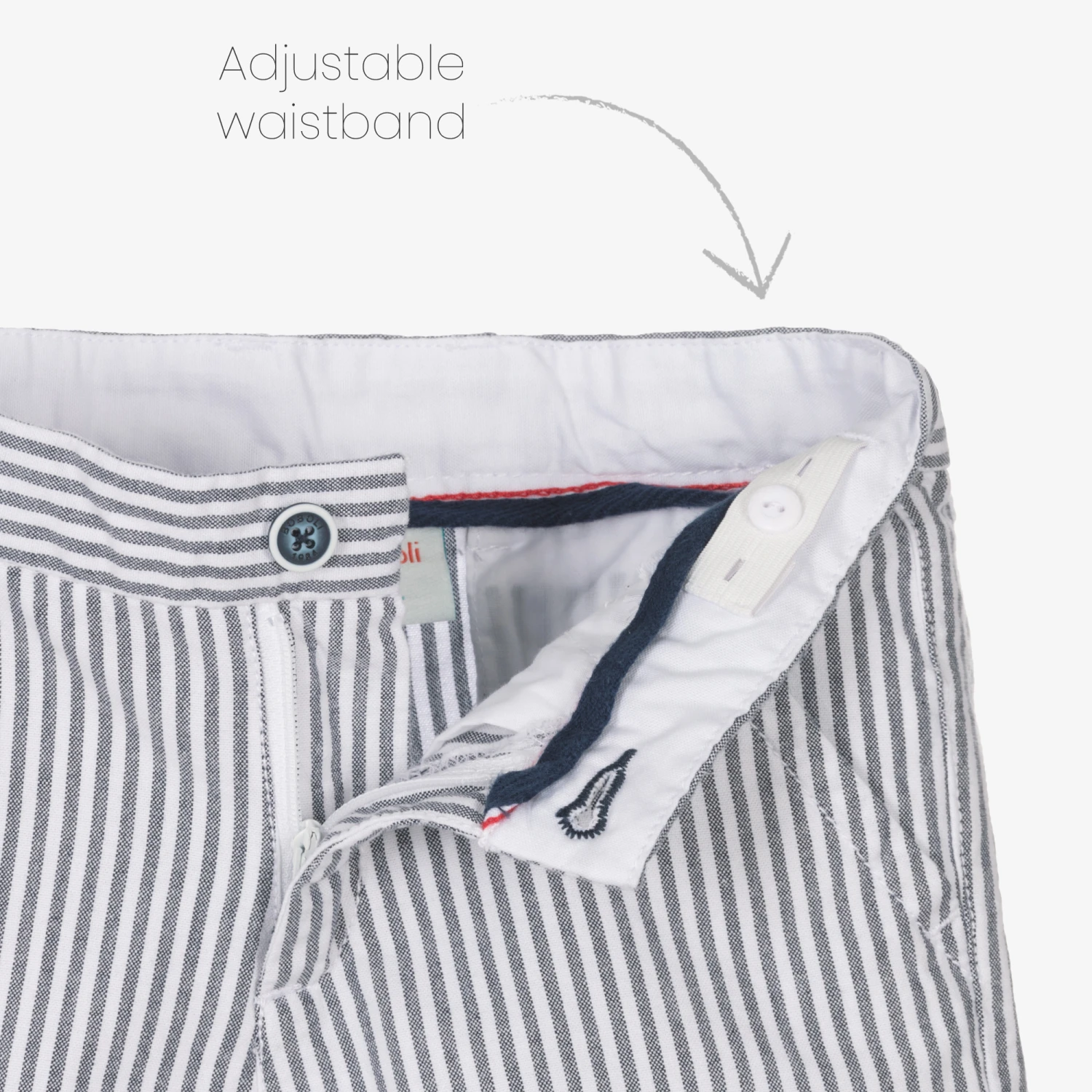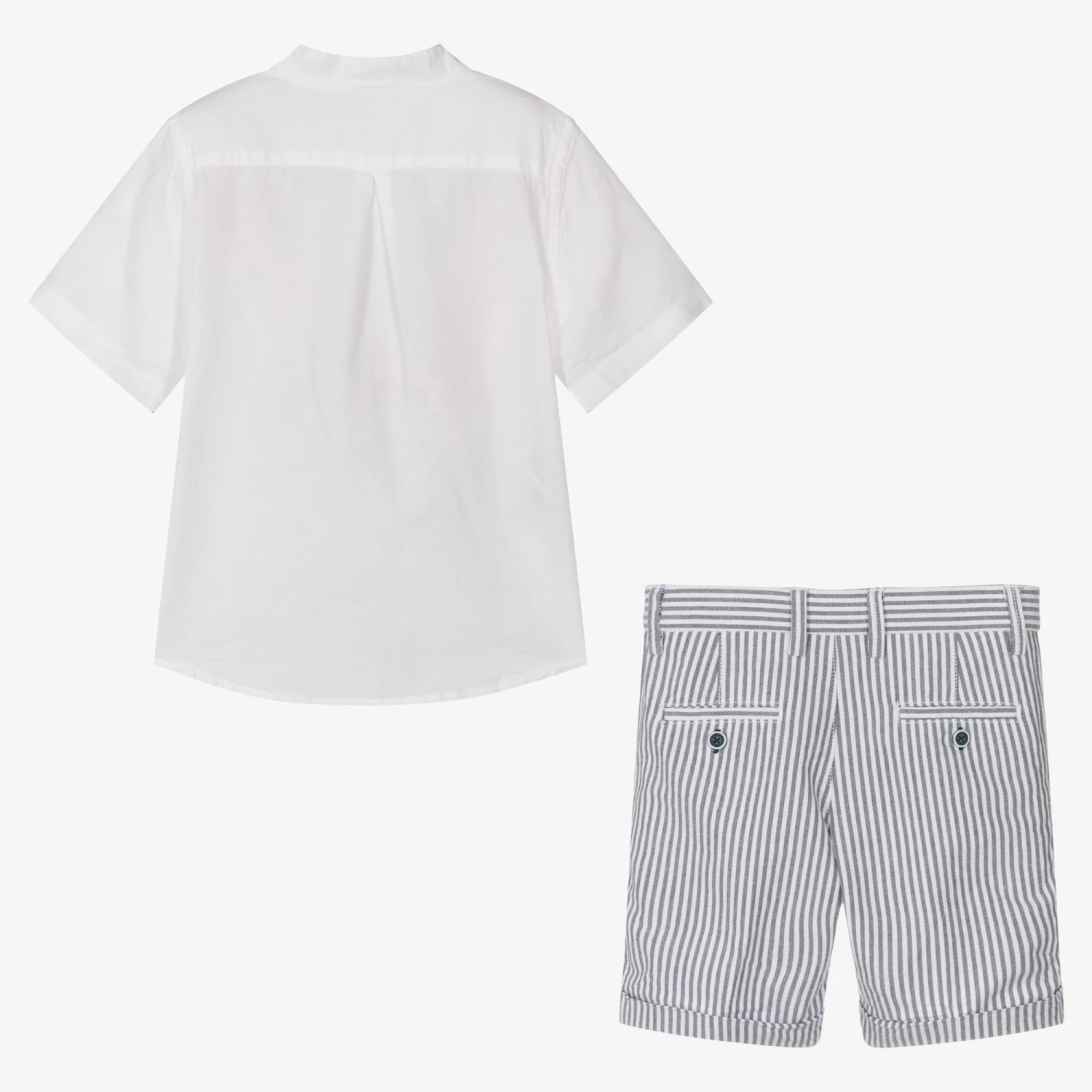 Smart-casual shorts set for boys by Spanish brand Boboli, just right for warmer days. The white shirt is made in a cool, comfortable linen and cotton blend. It has logo button fastenings on the front and has a discreet, embroidered logo on the front. The coordinating, striped cotton twill shorts have an adjustable waistband for a good fit and useful jetted side pockets, with logo button-fastening back pockets. They have cute, fixed turn-ups and fasten with a logo button and zip on the front.