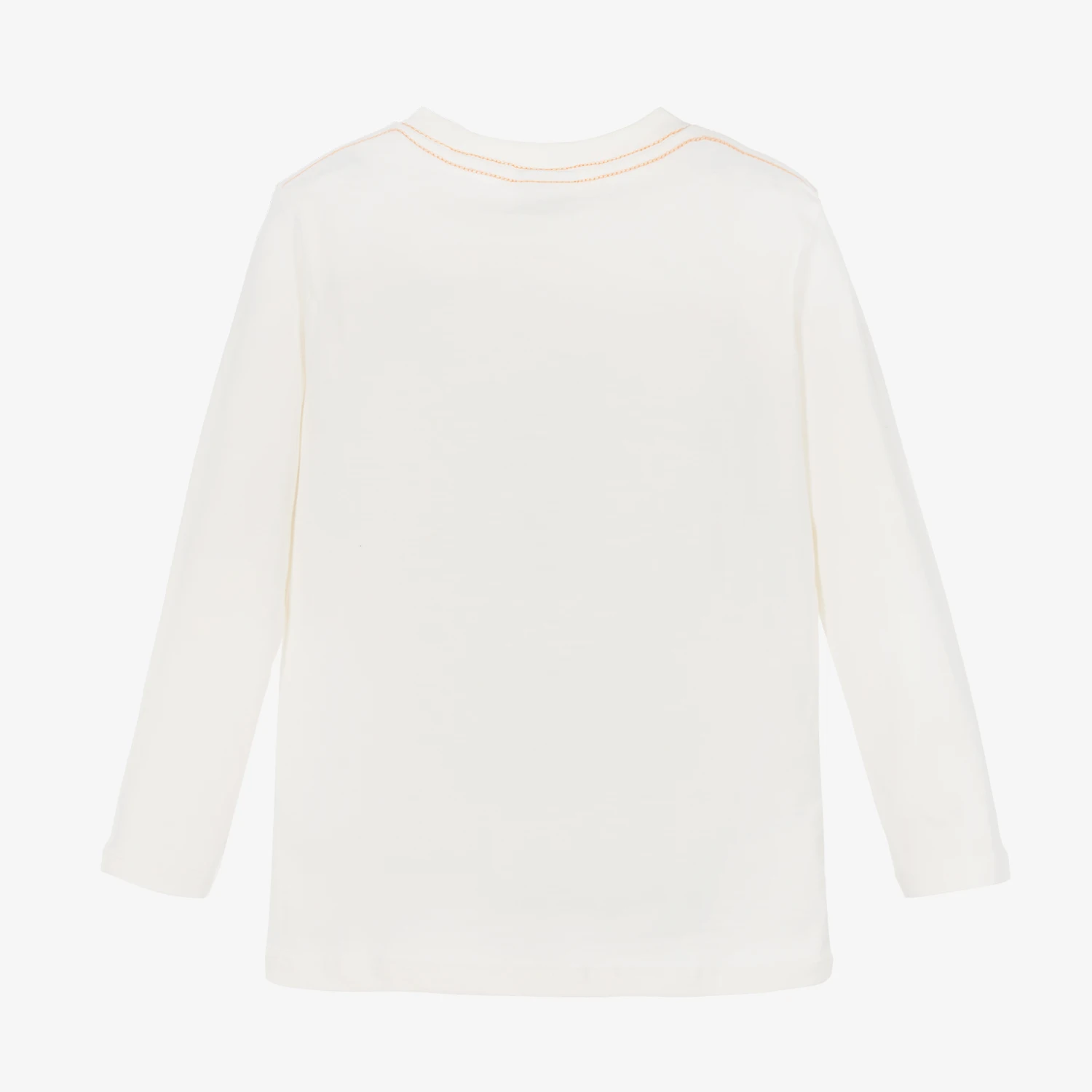 Ivory top for boys by Spanish brand Boboli, made in soft and comfortable cotton jersey. The front has an adventure-themed colourful print of a bear and squirrel riding a bicycle.
