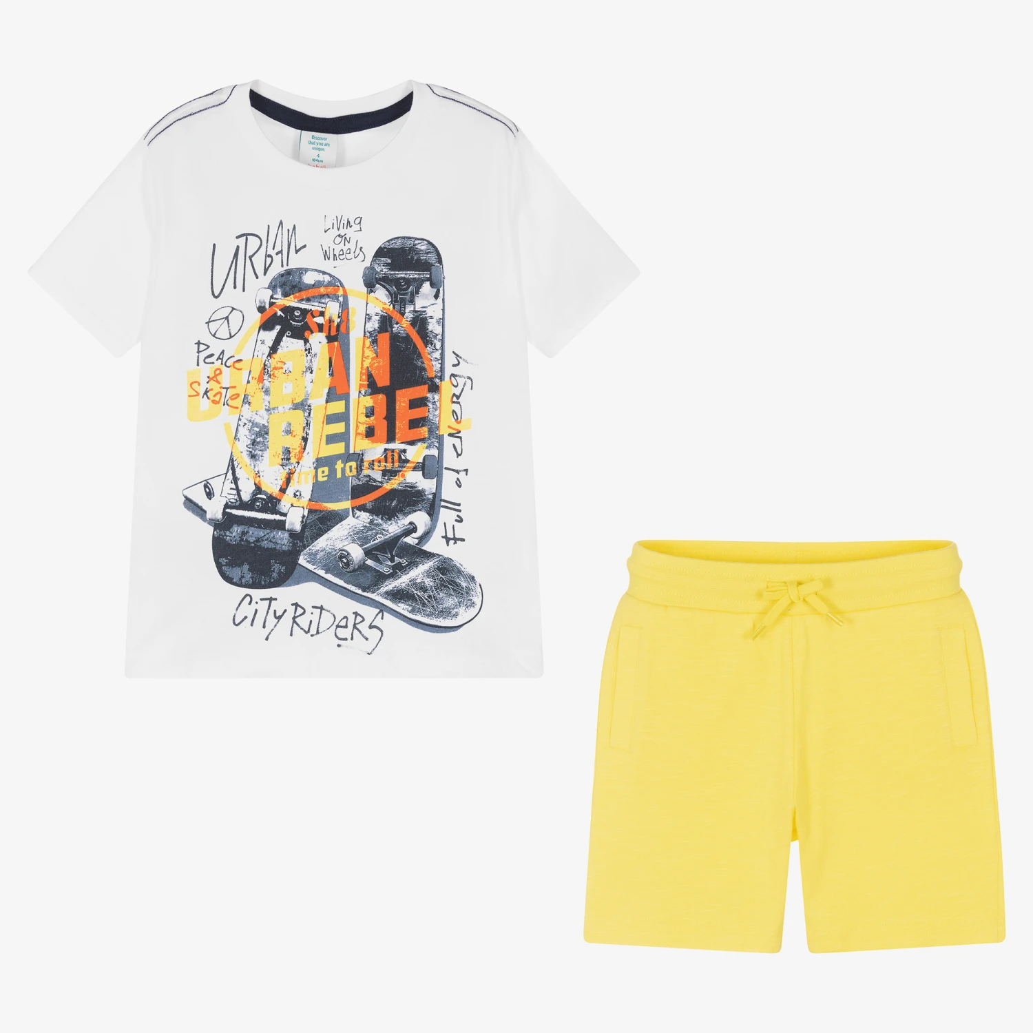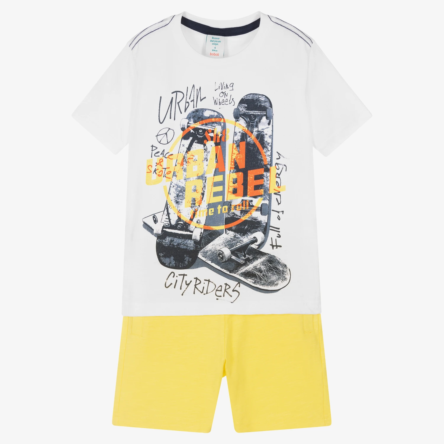 Casual and comfy for boys, this soft cotton jersey shorts set is by Boboli. The white T-shirt has a fun skateboarding print in dark grey, yellow and orange, with cool graffiti detailing. The yellow shorts have useful side pockets and a ribbed waistband with drawstring tie to adjust the fit. There are branded patches on the back of both the top and the shorts.