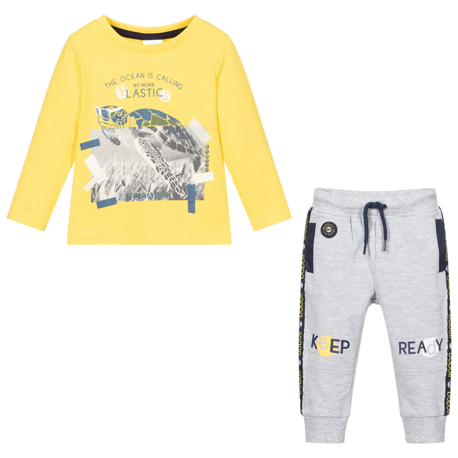 Yellow and grey trouser set for boys by Boboli, made in soft cotton jersey. The yellow long-sleeved top has a blue and grey turtle motif and the grey, mid-weight joggers have blue, white and yellow logo tape trims down each leg, with ‘Keep Ready’ printed across the knees. They have side pockets and a drawstring waist.