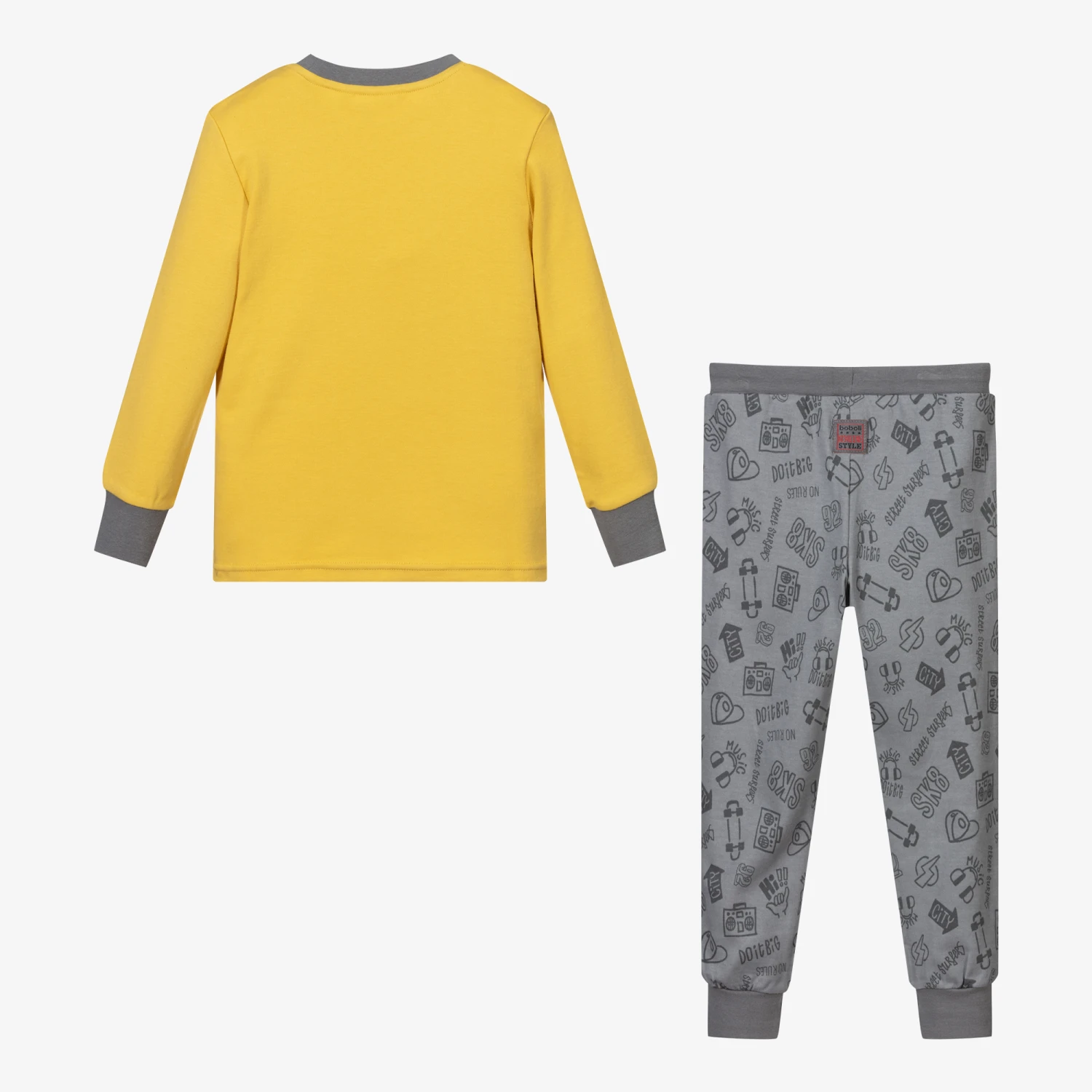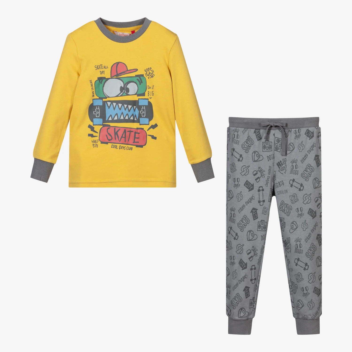 Made in soft cotton jersey, these comfortable pyjamas for boys are by Boboli. The yellow top has grey trims, with a fun and colourful skateboard print on the front. The grey trousers are patterned in skateboarding prints and have an elasticated drawstring wait.