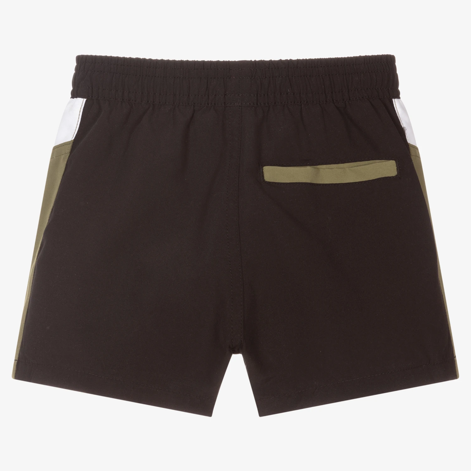 Black swim shorts for boys by BOSS Kidswear, with a white logo print on one leg. Silky and lightweight, they have front pockets, khaki green and white panels, and a branded faux drawstring on the elasticated waist. They have a soft mesh pants lining for comfort.