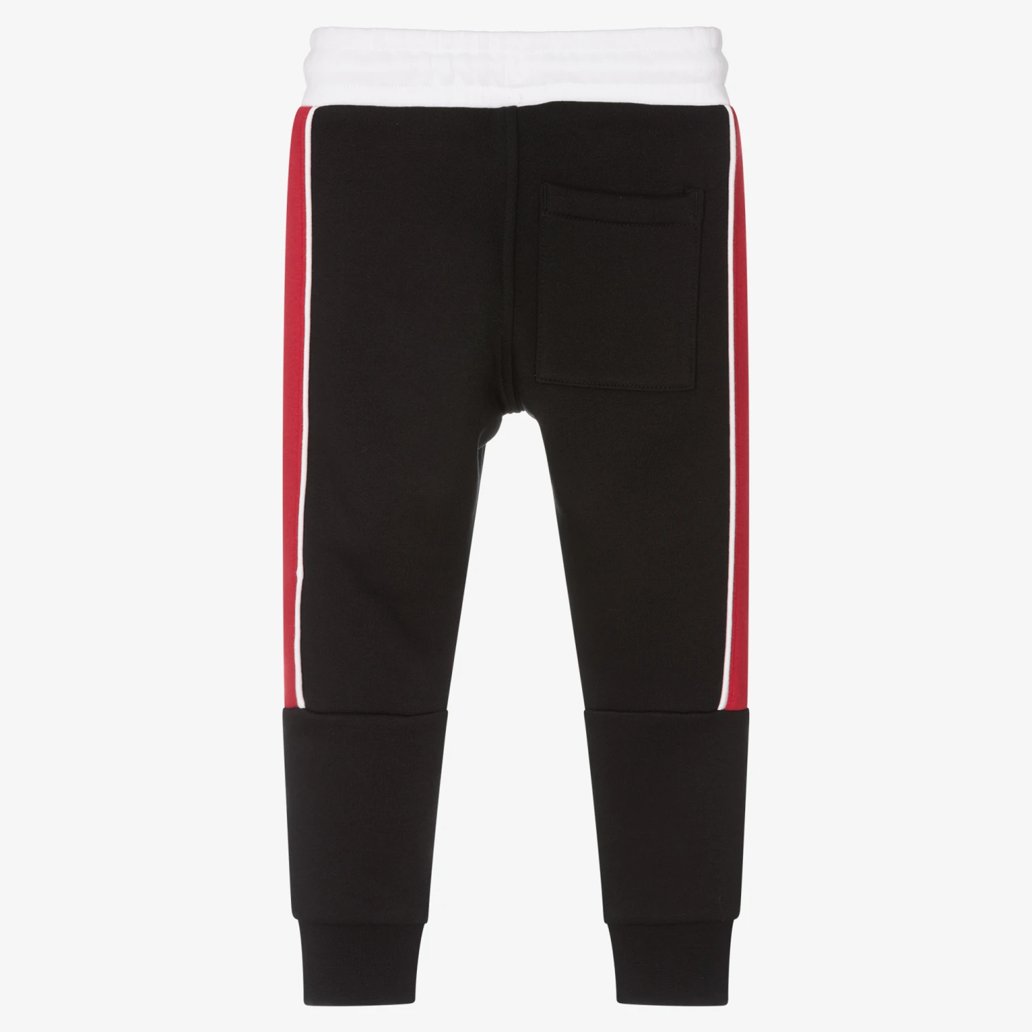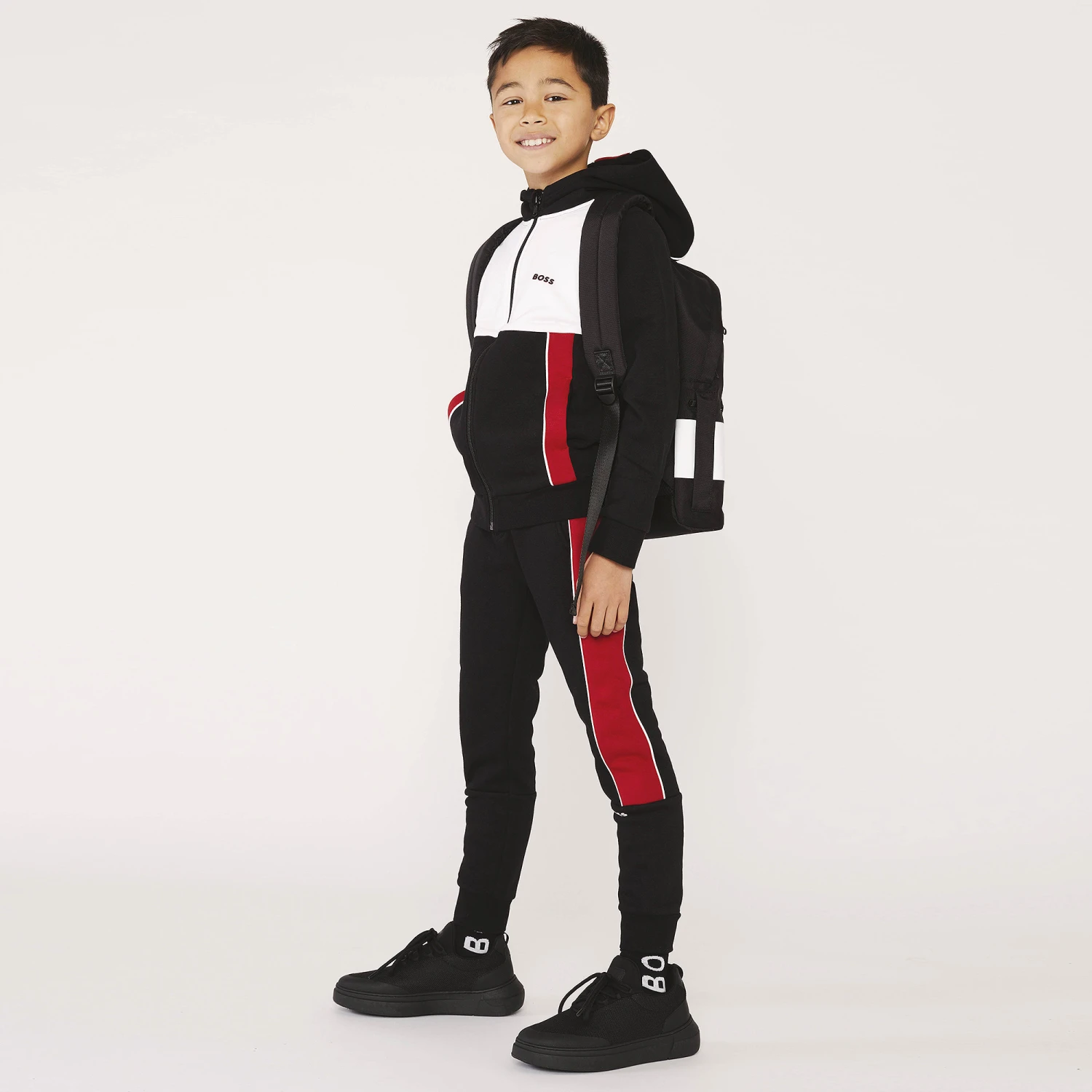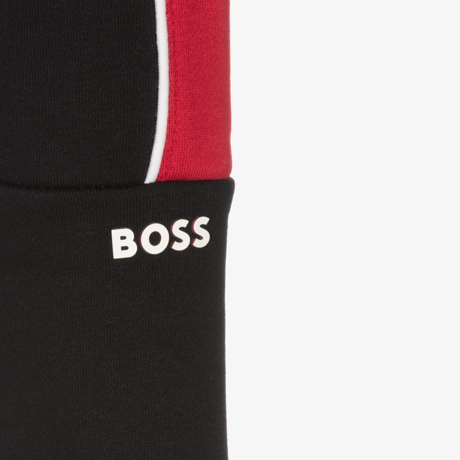 Casual black joggers for boys by BOSS, with red side panels and white piping trim. Made in mid-weight cotton jersey with a cosy fleece feel inside, they have a comfortable drawstring waist with branded end caps and useful pockets on the front and back. There is a raised white and red silicone logo print on one leg.