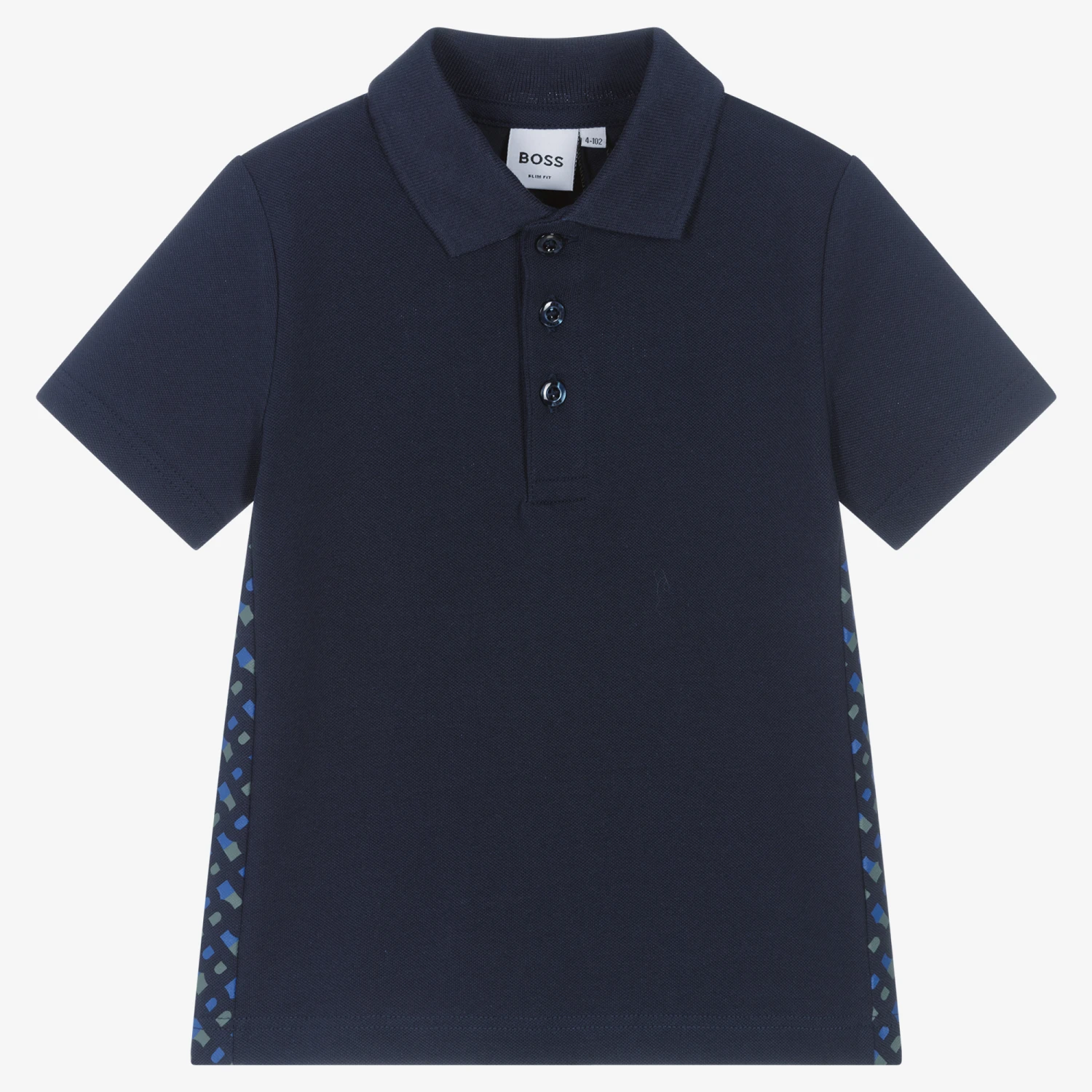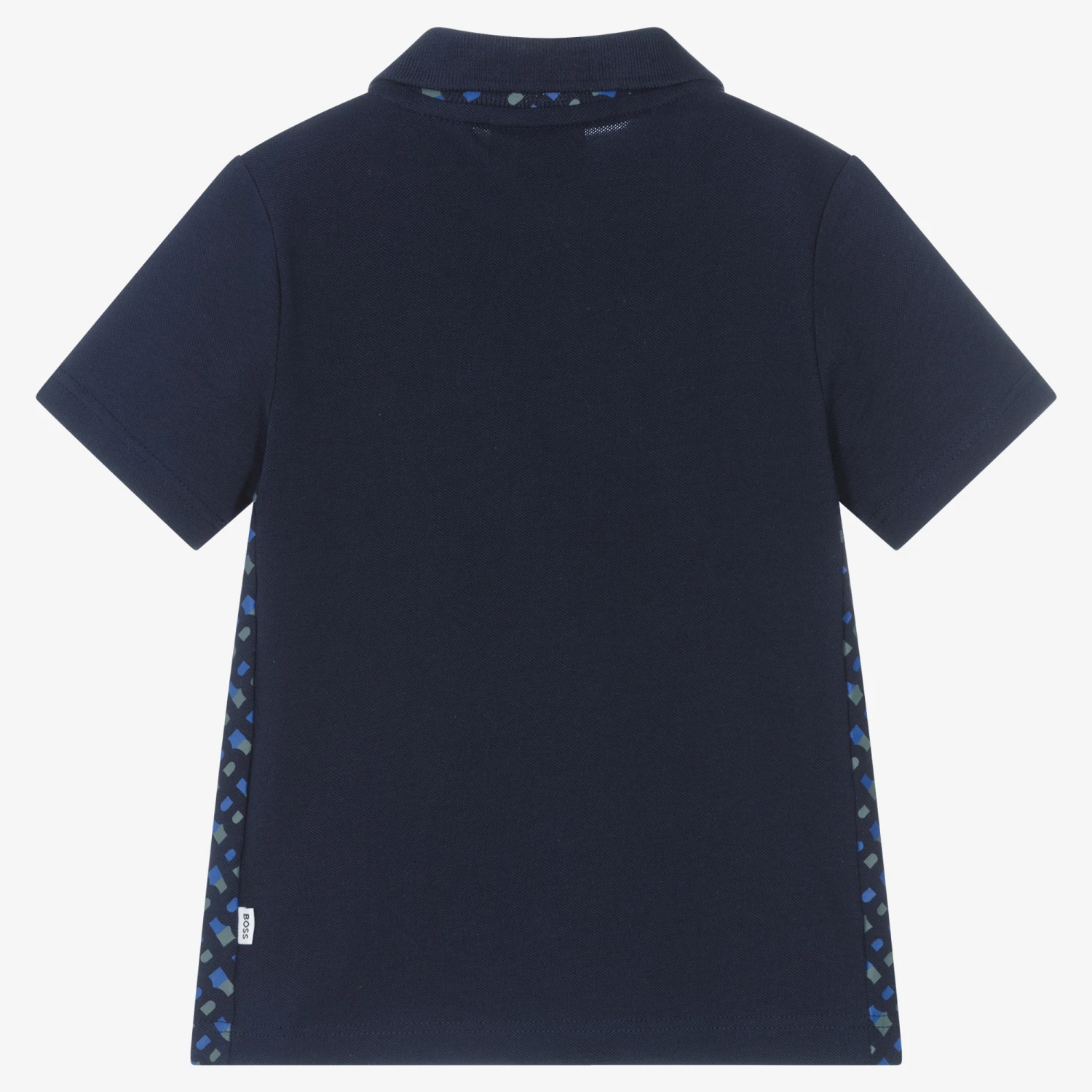 A navy blue slim fit polo shirt for boys by BOSS, made in the softest cotton piqué. For a sleek yet casual style, it has patterned side panels and a ribbed collar, with the iconic monogram design underneath in blue and green.
