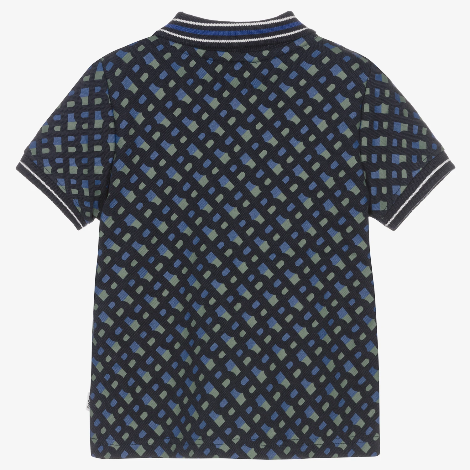 Navy blue polo shirt for little boys from BOSS, made in soft cotton piqué. This timeless piece has a fun twist with an all-over monogram print and striped collar and cuffs.