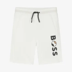 Ivory shorts for little boys by BOSS, made in mid-weight jersey. A great staple piece for any young wardrobe, these versatile shorts have two front pockets, a drawstring waist, and a black and beige tennis-themed logo print.