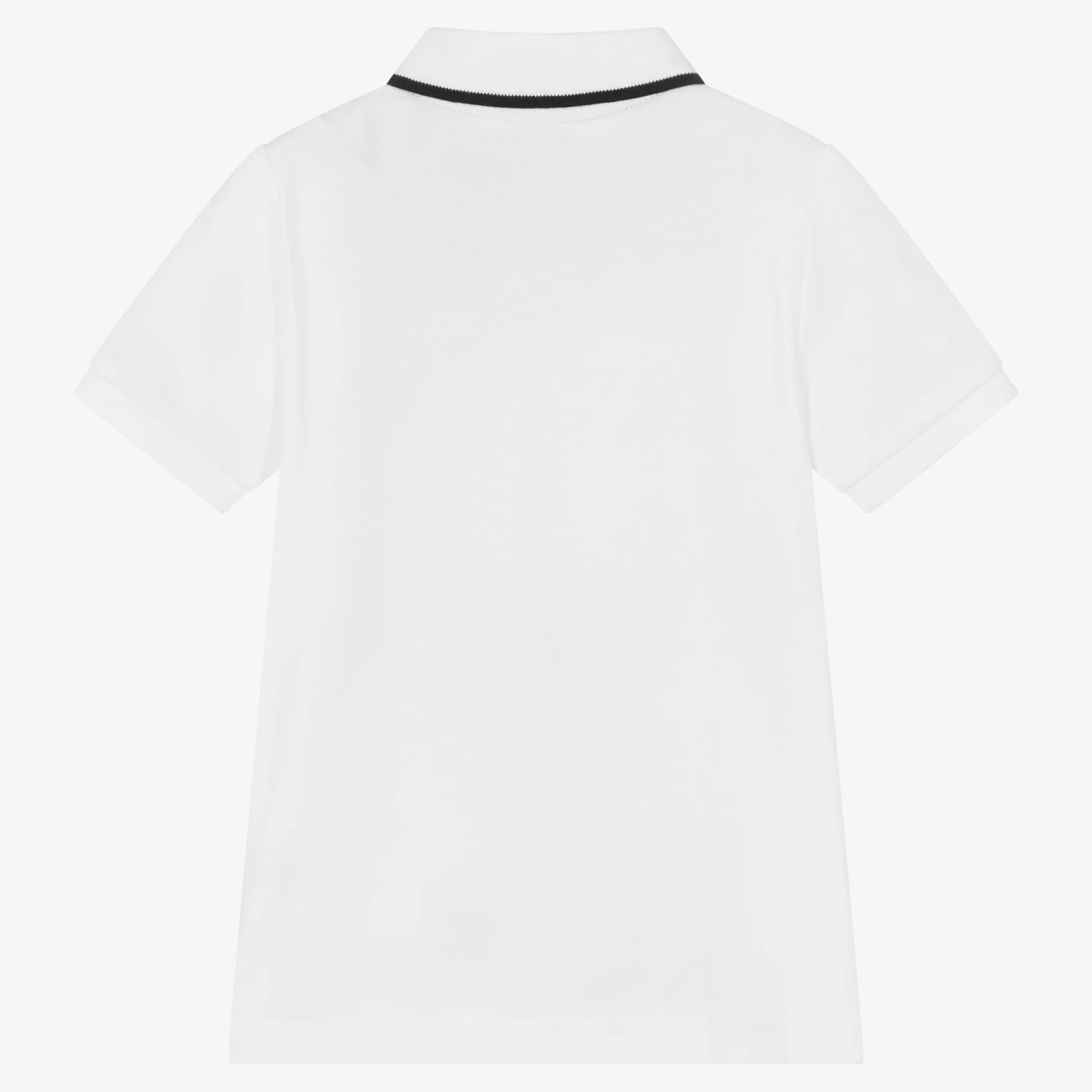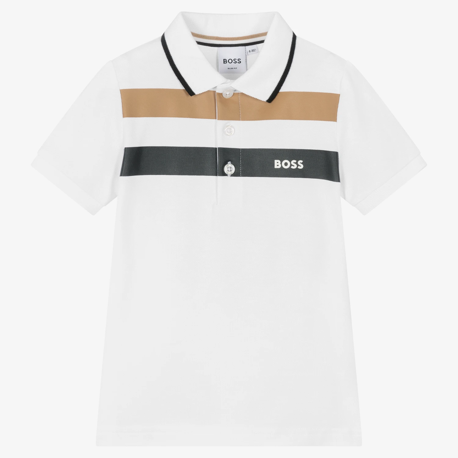 Smart-casual, slim-fitting white polo shirt for boys, unmistakably by BOSS. It has the brands white, rubberised logo on the front, with the signature tricolour stripes across the front. Made in stretchy piqué for all-day comfort, it has a black trim on the ribbed collar and fastens with logo buttons.