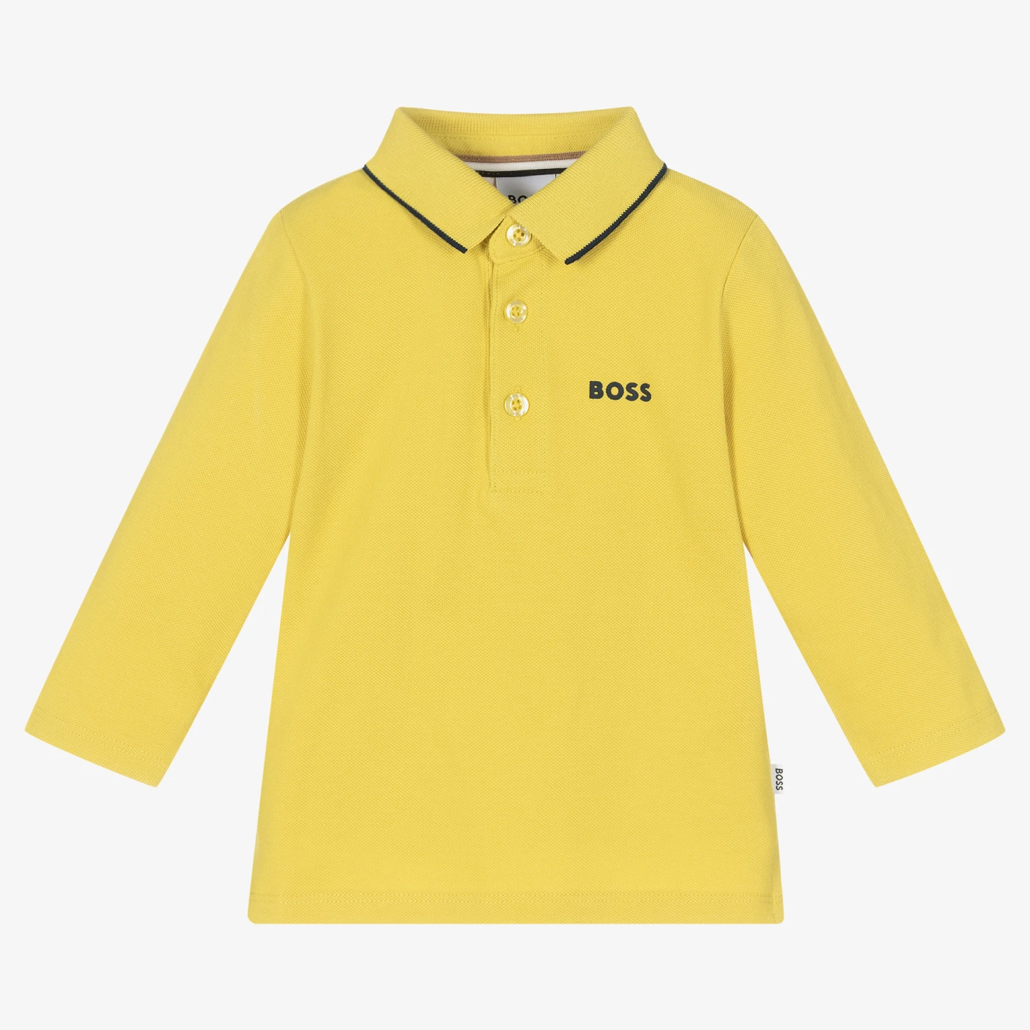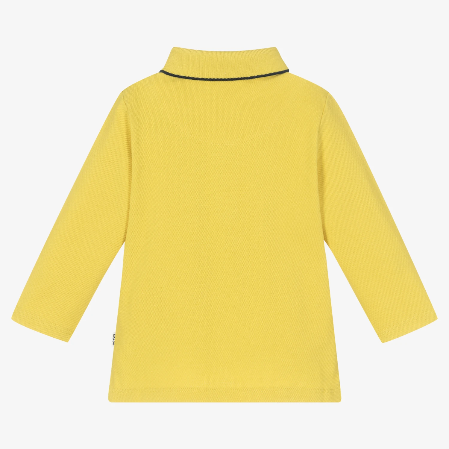 Yellow long-sleeved polo shirt for little boys by BOSS made in comfortable to wear cotton piqué. It has a navy blue striped trim on the ribbed collar and the brand’s signature logo in navy blue rubber on the chest. There are logo-branded button fastenings on the front.