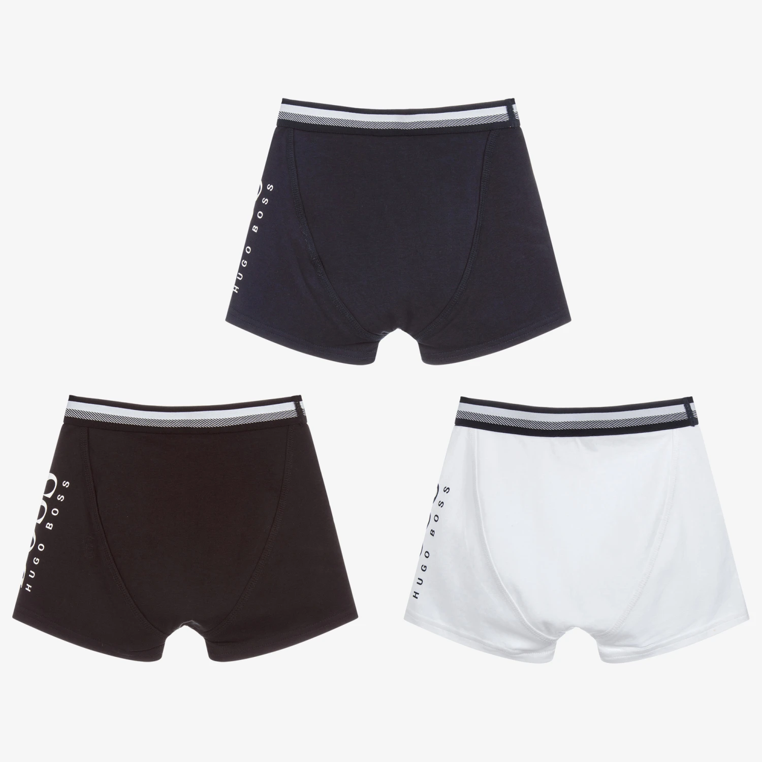 Pack of three boxer shorts for boys by BOSS Kidswear, in navy blue, white and black. Made in soft and stretchy cotton jersey, they have logo branding down one side and on the elasticated waistband.
